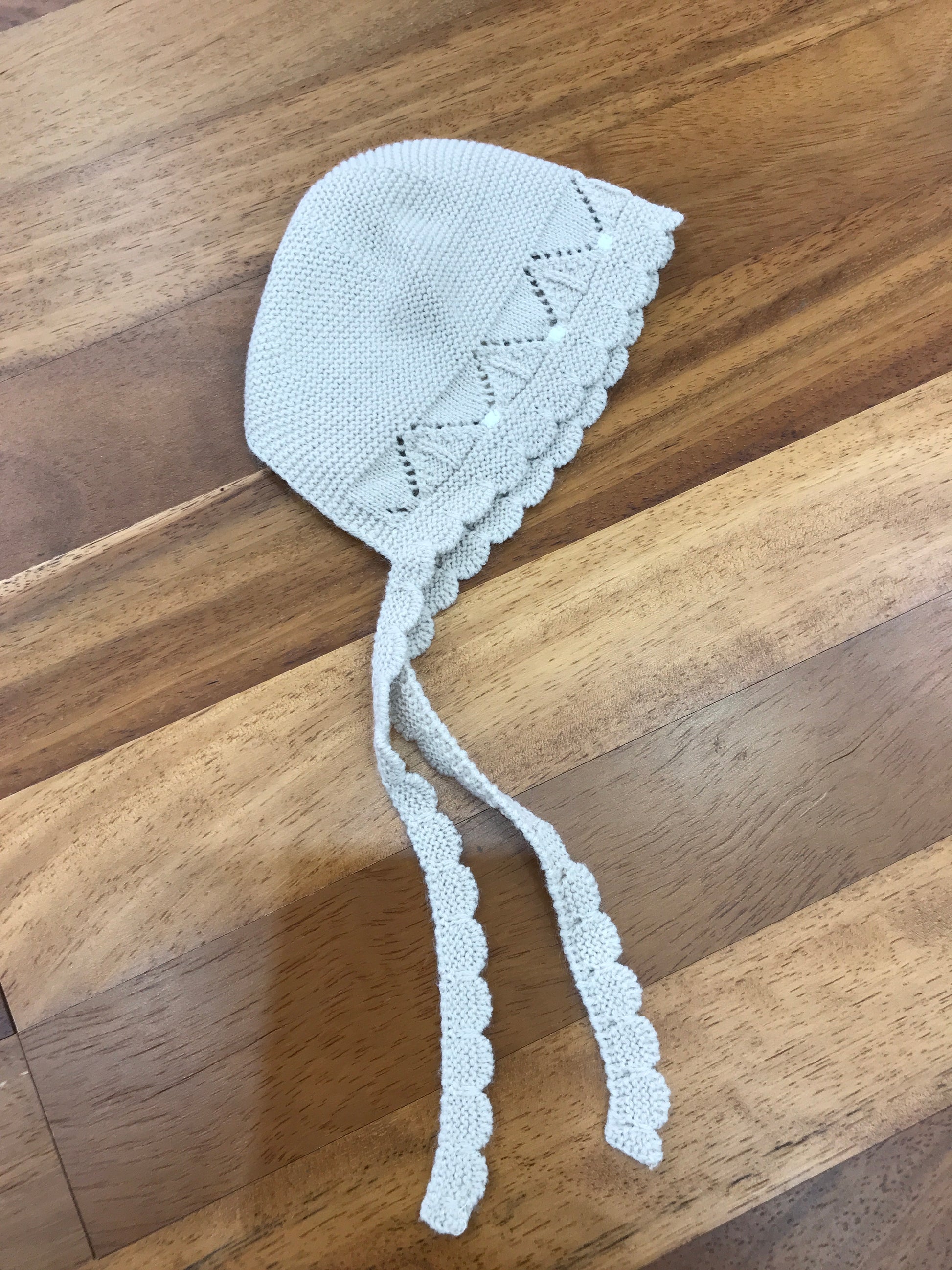 Questa cuffietta presenta raffinati ricami traforati che ne esaltano la delicatezza, accompagnati da un bordo smerlato che aggiunge un tocco di eleganza. Anche i laccetti utilizzati per la chiusura a fiocco sono rifiniti con la stessa cura smerlata, garantendo un design armonioso e curato nei minimi dettagli, ideale per completare con stile il guardaroba del neonato.