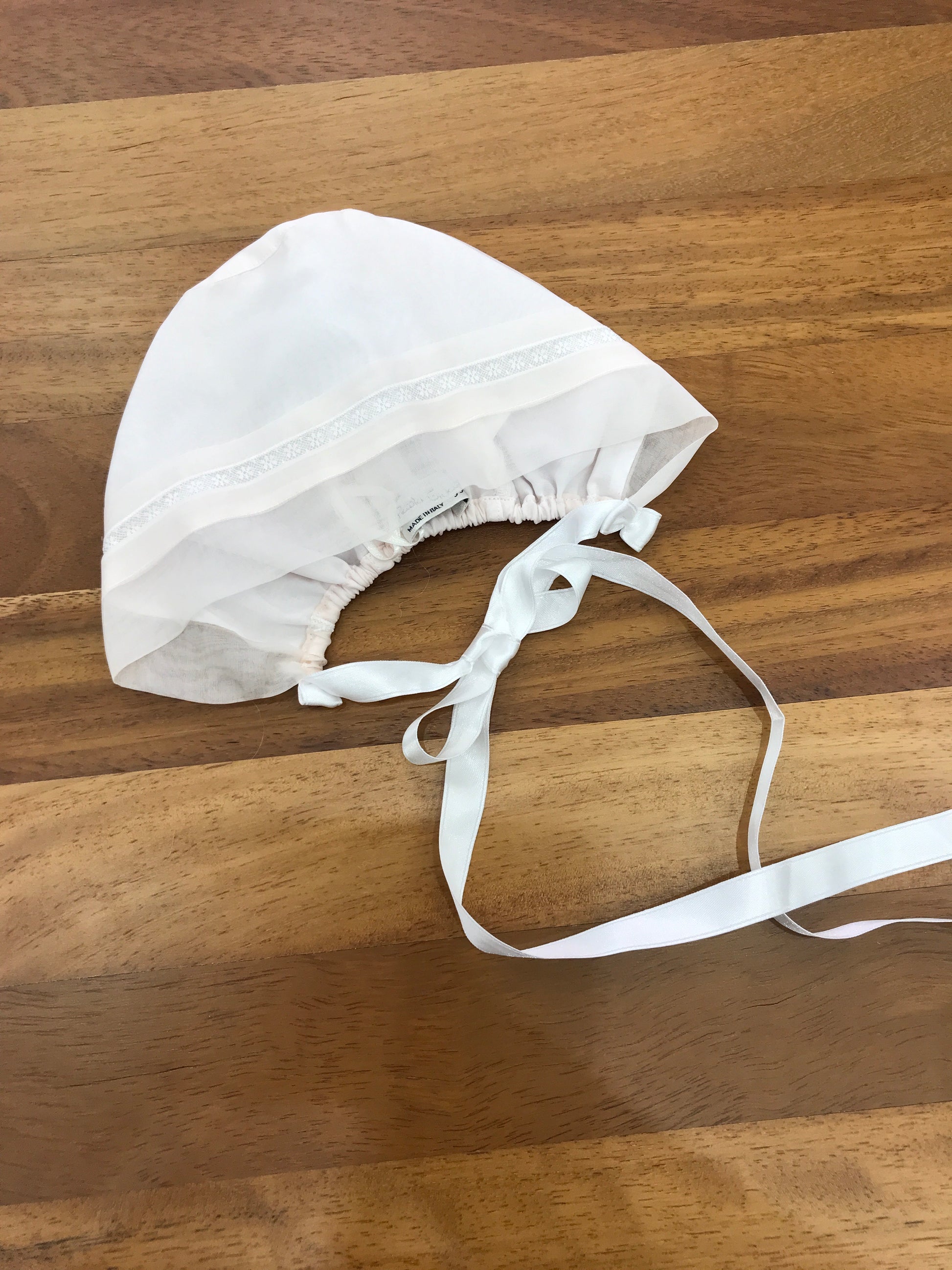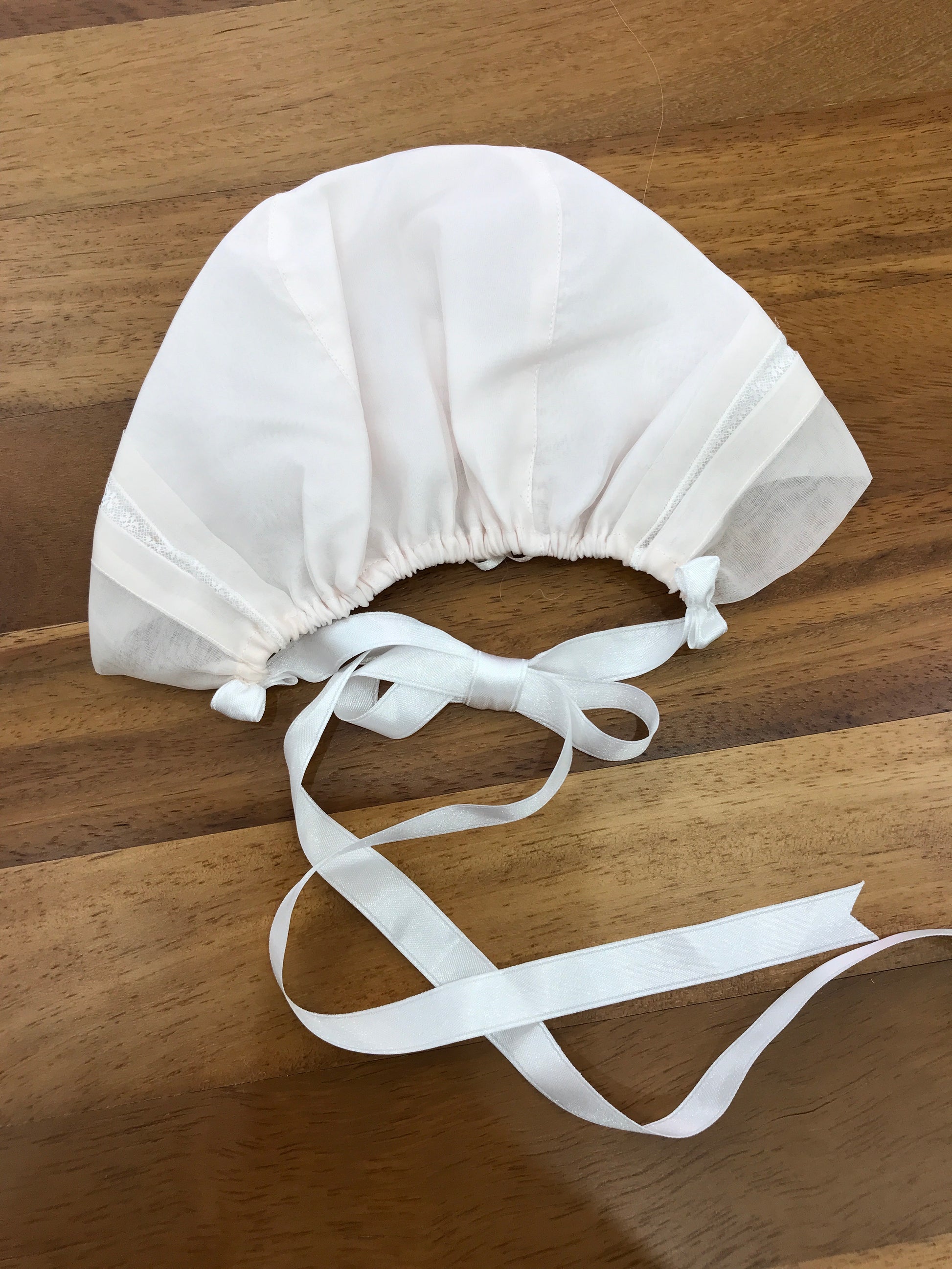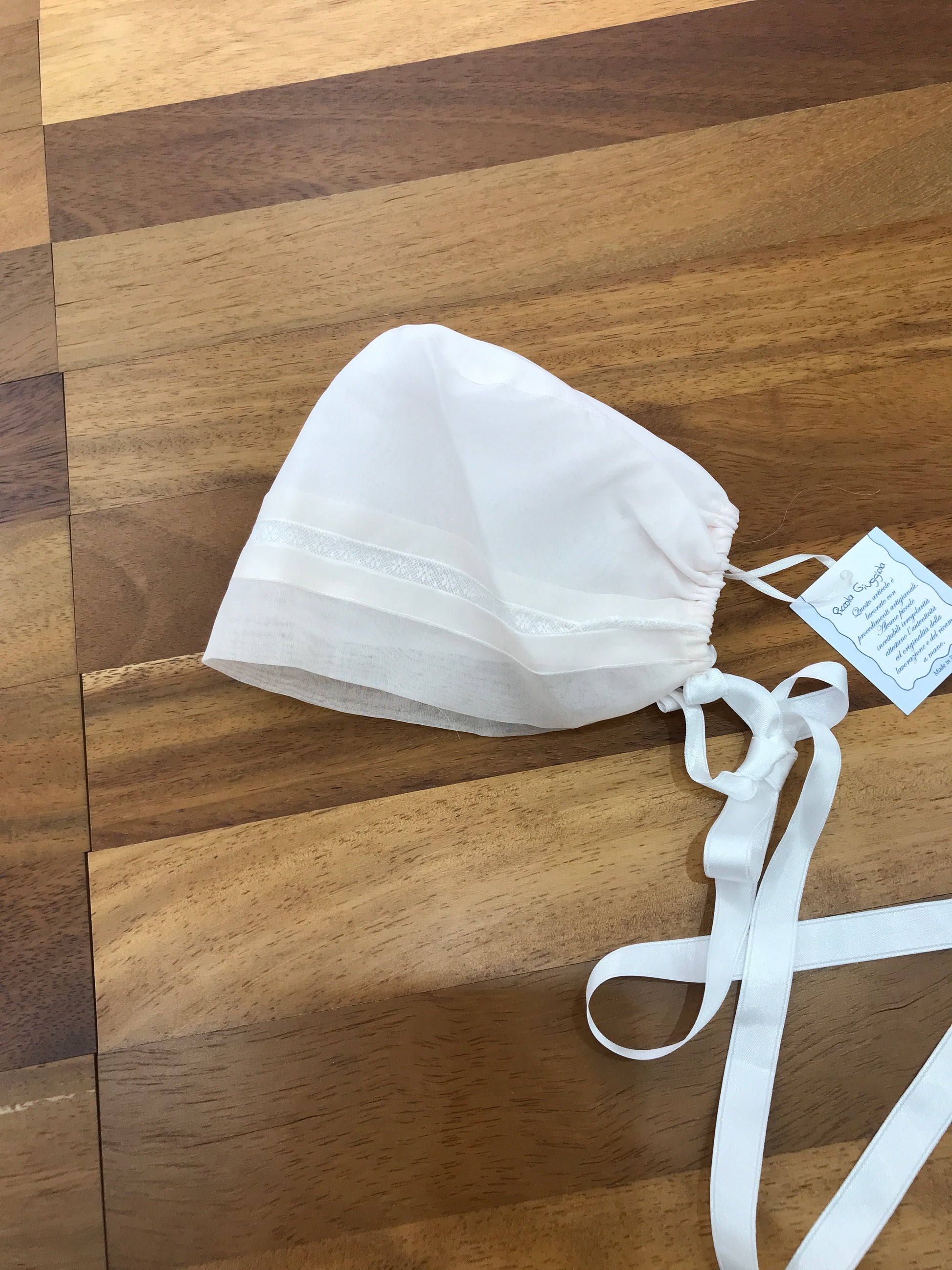 Delicata cuffietta in organza, arricchita da un raffinato merletto ricamato e chiusa con un elegante fiocchetto.