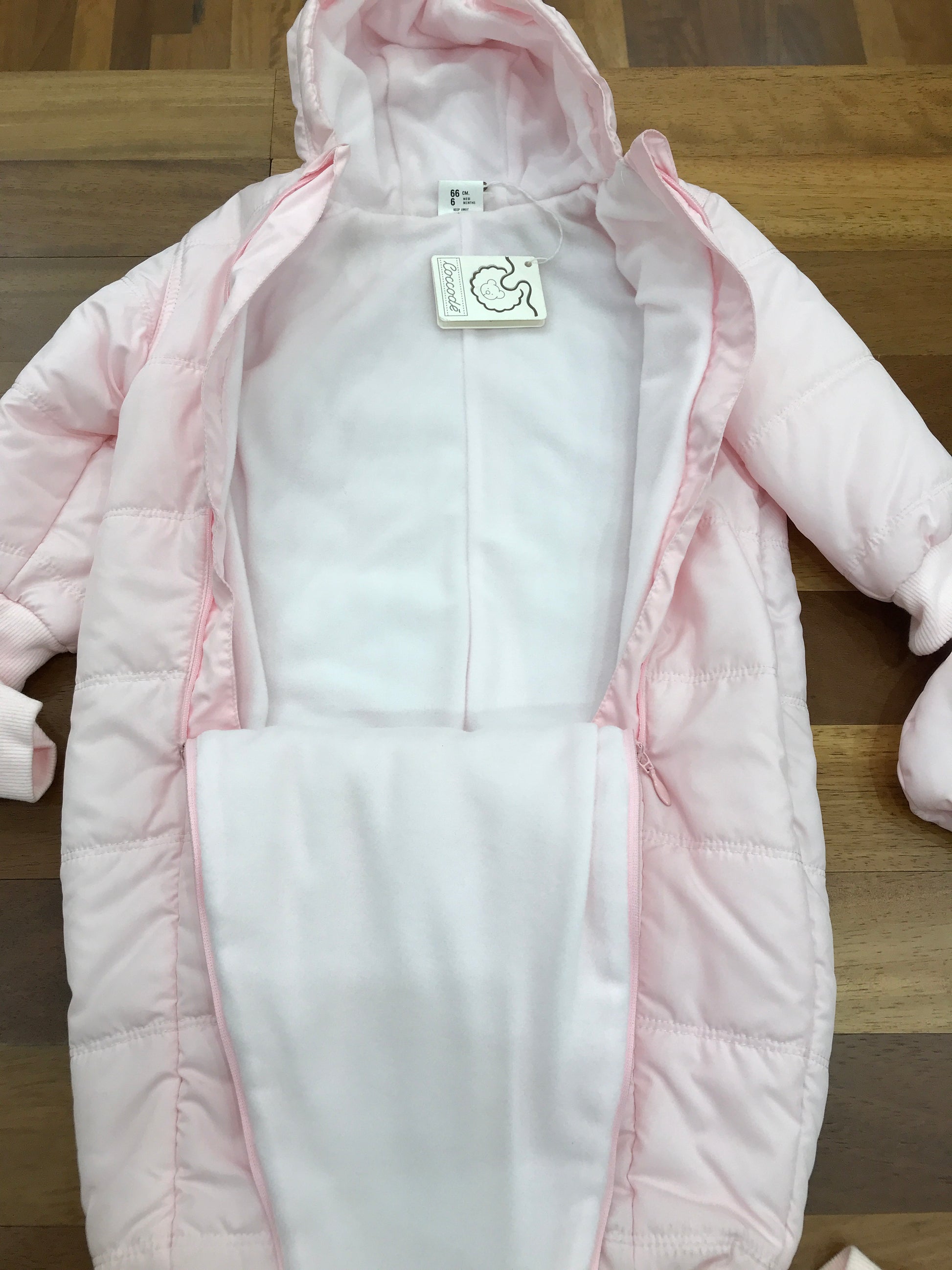 Tuta impermeabile Eskimo in rosa con cappuccio integrato, ideale per proteggere i più piccoli dalle intemperie. Dotata di piedini e guantini staccabili per adattarsi alle diverse esigenze stagionali, garantisce praticità e versatilità. La chiusura frontale facilita l'indossamento e lo svestimento, mentre la struttura robusta assicura comfort e protezione duratura durante le attività all'aperto.