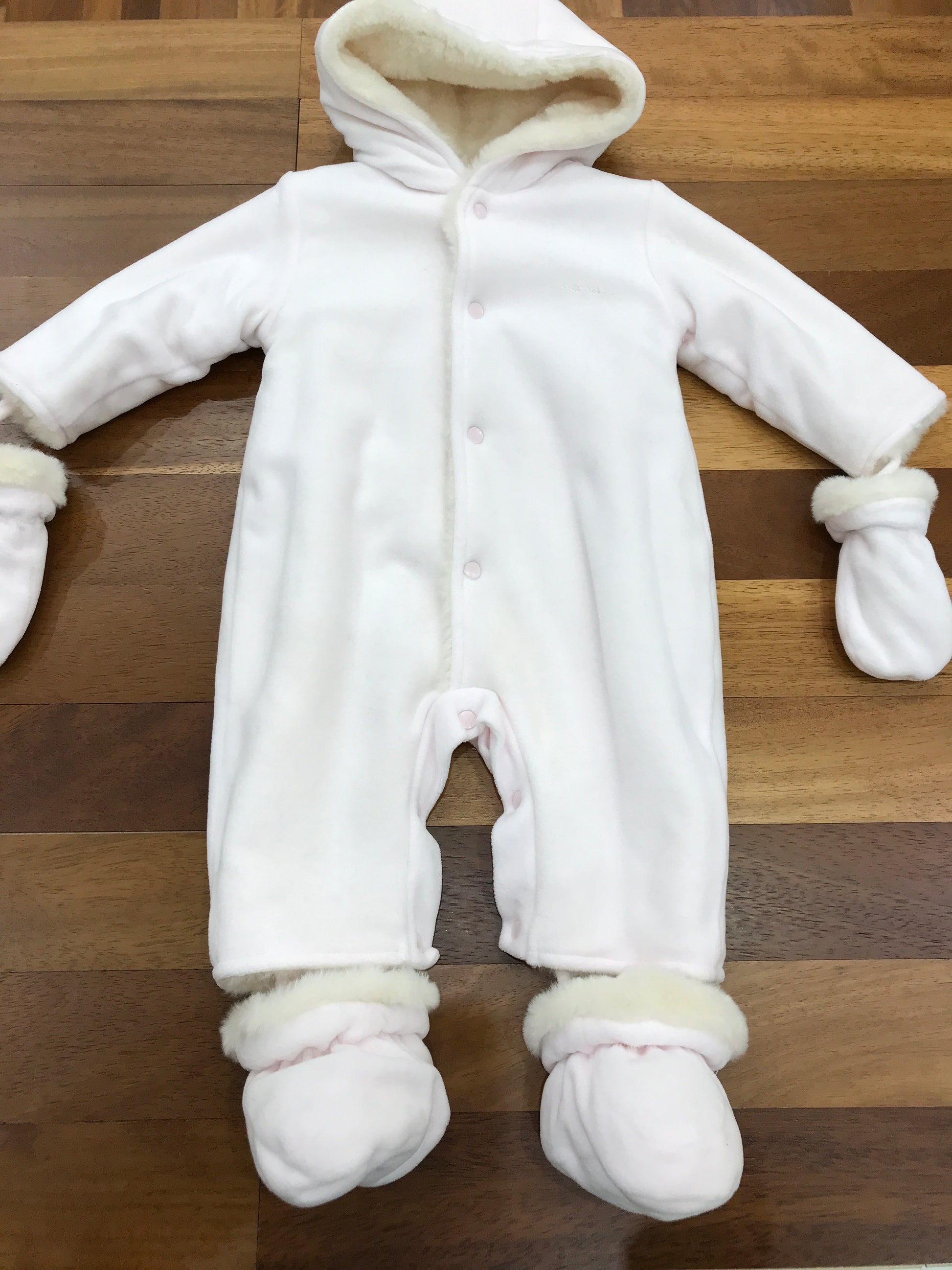 Accogliente eskimo in lana rosa con cappuccio integrato, arricchito da una fodera in morbida pelliccia. Dotato di piedini e scarpine staccabili, offre praticità e versatilità per le esigenze quotidiane del bambino. Un capo pensato per garantire calore e comfort durante i mesi più freddi.