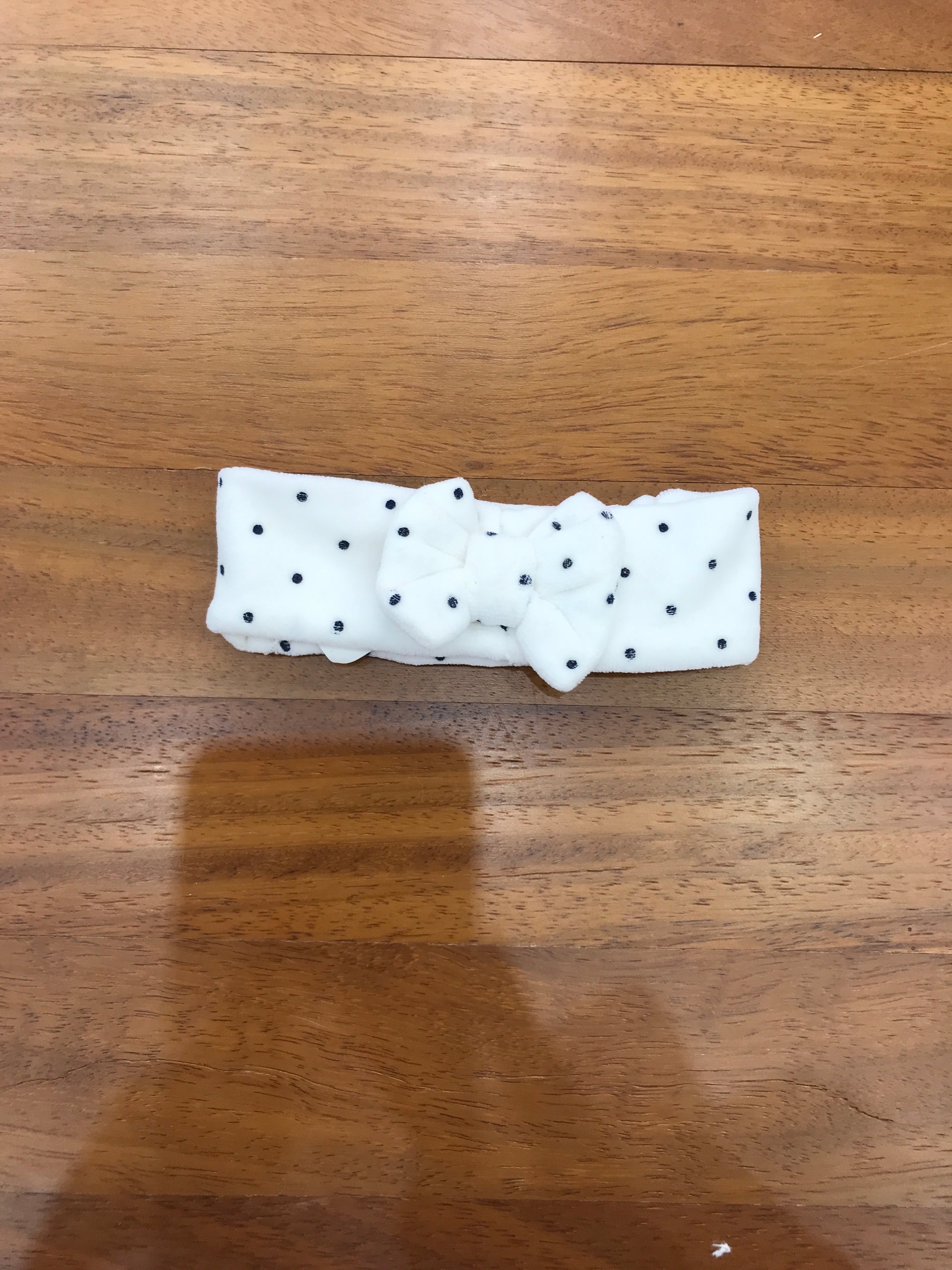 Fascia realizzata in morbida ciniglia bianca, arricchita da un motivo di pois blu scuro distribuiti uniformemente su tutta la superficie. Il design è completato da un elegante fiocco posizionato al centro sul davanti, che aggiunge un tocco raffinato e distintivo al capo.