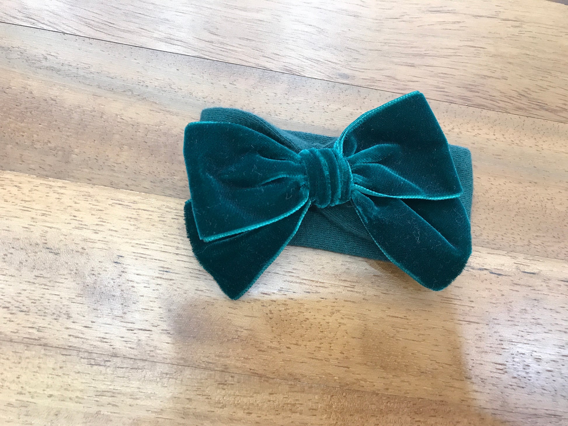 Fascia realizzata in morbida lana di colore verde scuro, arricchita da un elegante fiocco in velluto applicato al centro frontale, anch’esso in tonalità verde, che dona un tocco raffinato e distintivo al capo.