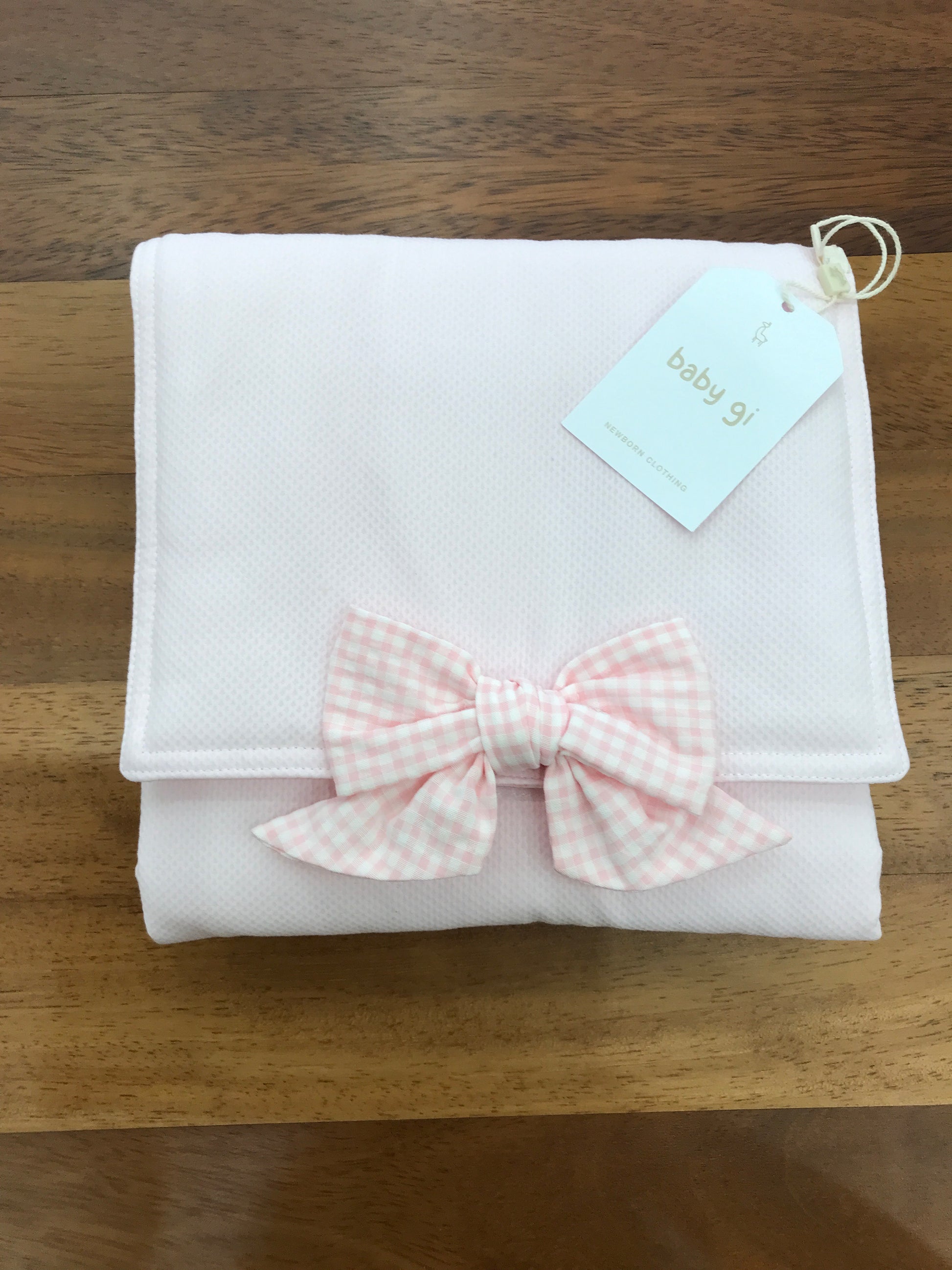 Fasciatoio per neonato di colore rosa, caratterizzato da un elegante fiocco a quadretti rosa e bianco che ne valorizza il design. Il piano interno è rivestito in plastica lavabile, offrendo una superficie igienica e facile da pulire, ideale per garantire comfort e praticità durante il cambio del bambino. Realizzato con materiali resistenti, è pensato per durare nel tempo assicurando sicurezza e funzionalità.