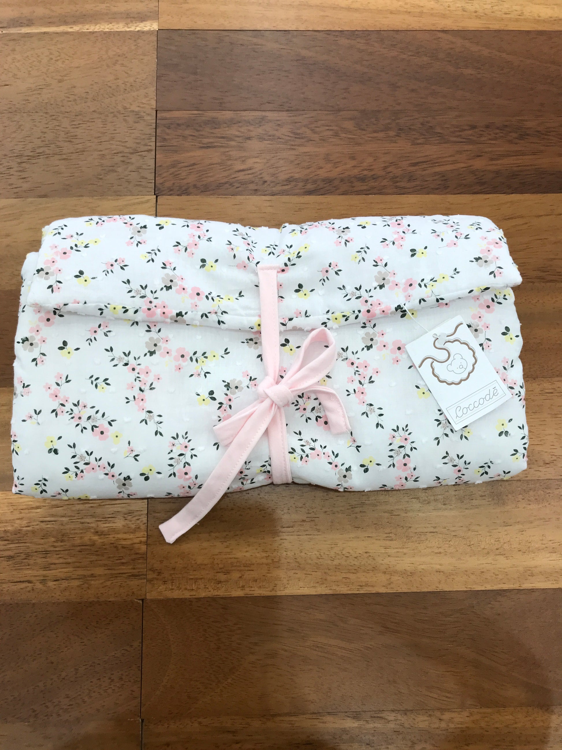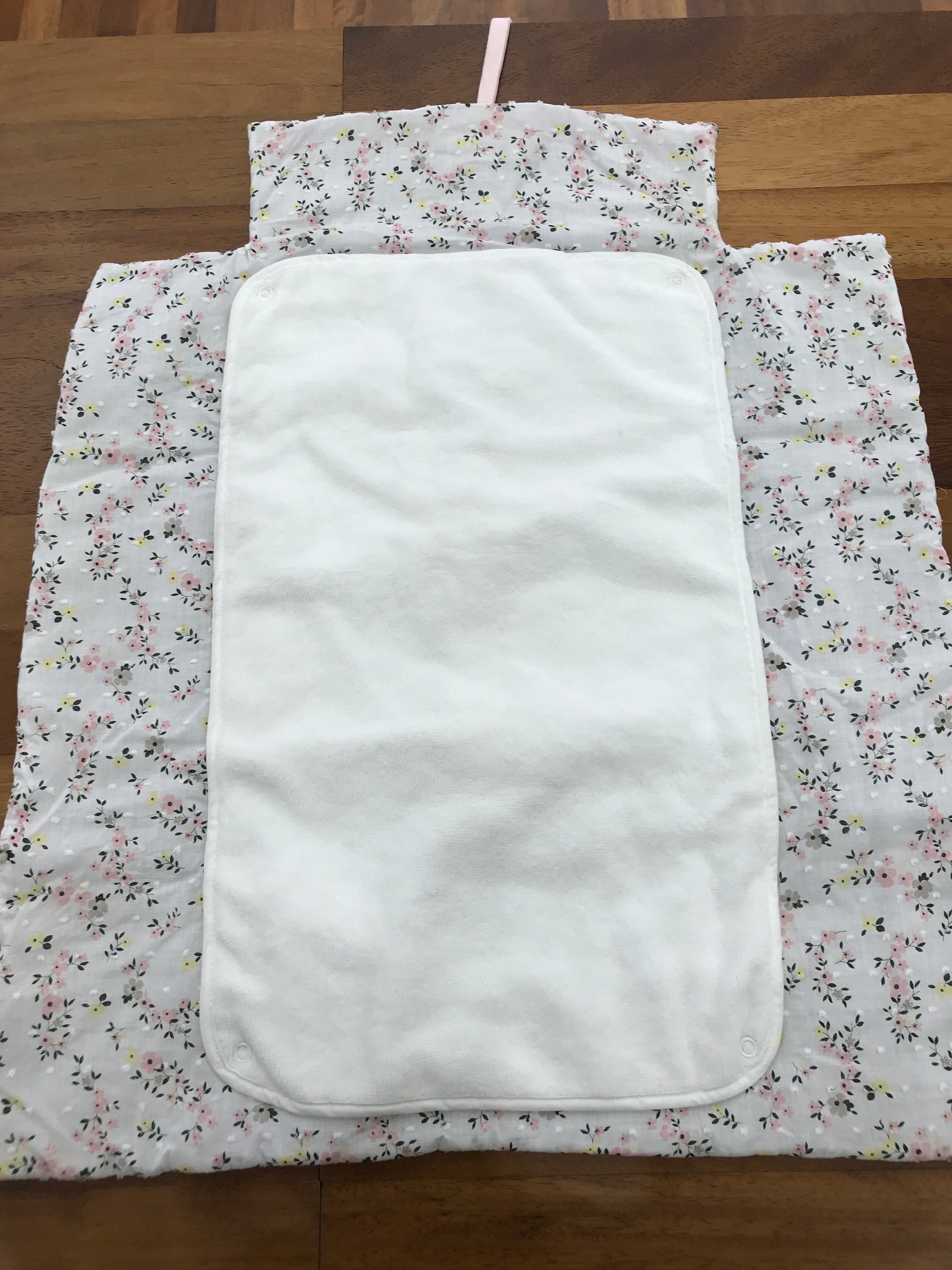Il fasciatoio presenta una base decorata con delicati fiorellini in tonalità rosa, giallo e beige, che creano un design raffinato e piacevole. La chiusura è caratterizzata da un elegante fiocchetto rosa, che aggiunge un tocco di colore e praticità. La parte interna del fasciatoio è rimovibile grazie a piccoli bottoncini, permettendo così una pulizia più semplice e accurata, garantendo un ambiente igienico e sicuro per il cambio del bambino. Questa funzionalità facilita il mantenimento della pulizia quotidiana in modo efficiente.
