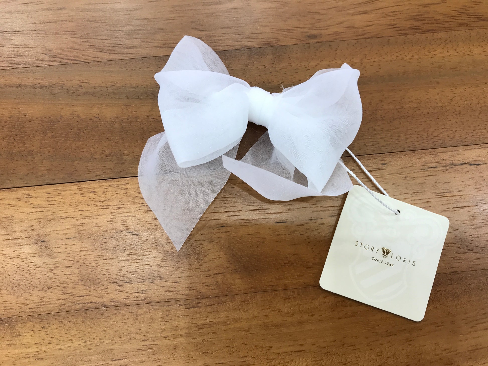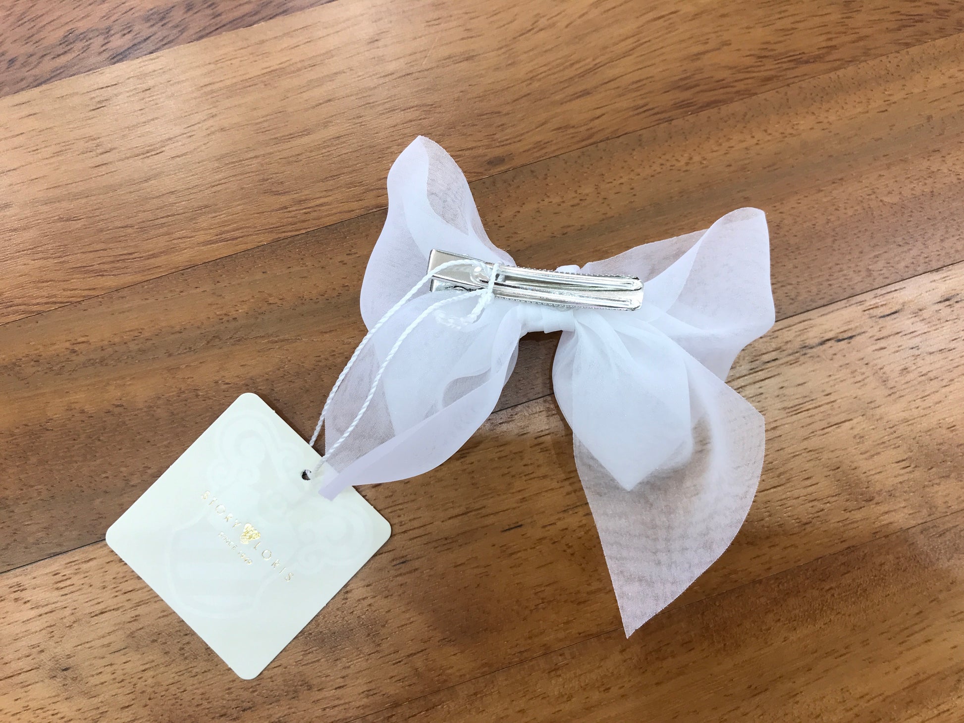 Fermaglio con sagoma a fiocco, completo di molletta di fissaggio posizionata sul retro.