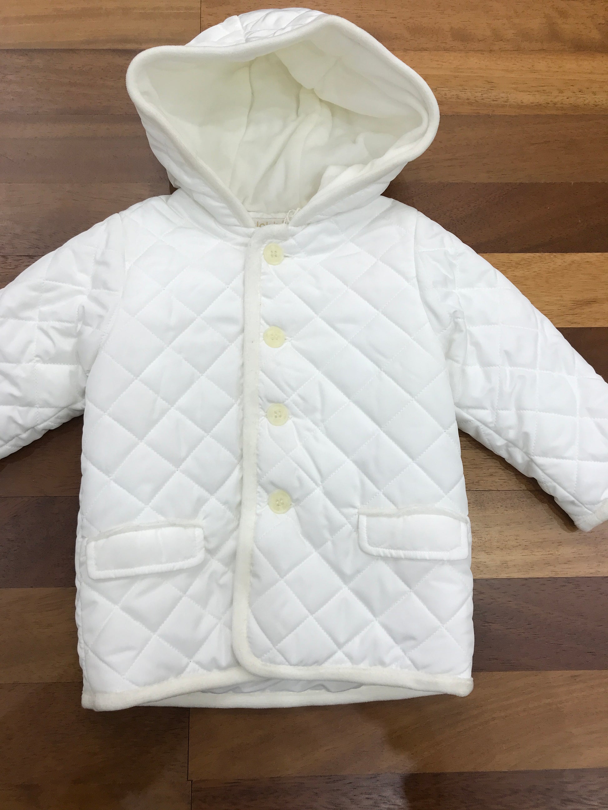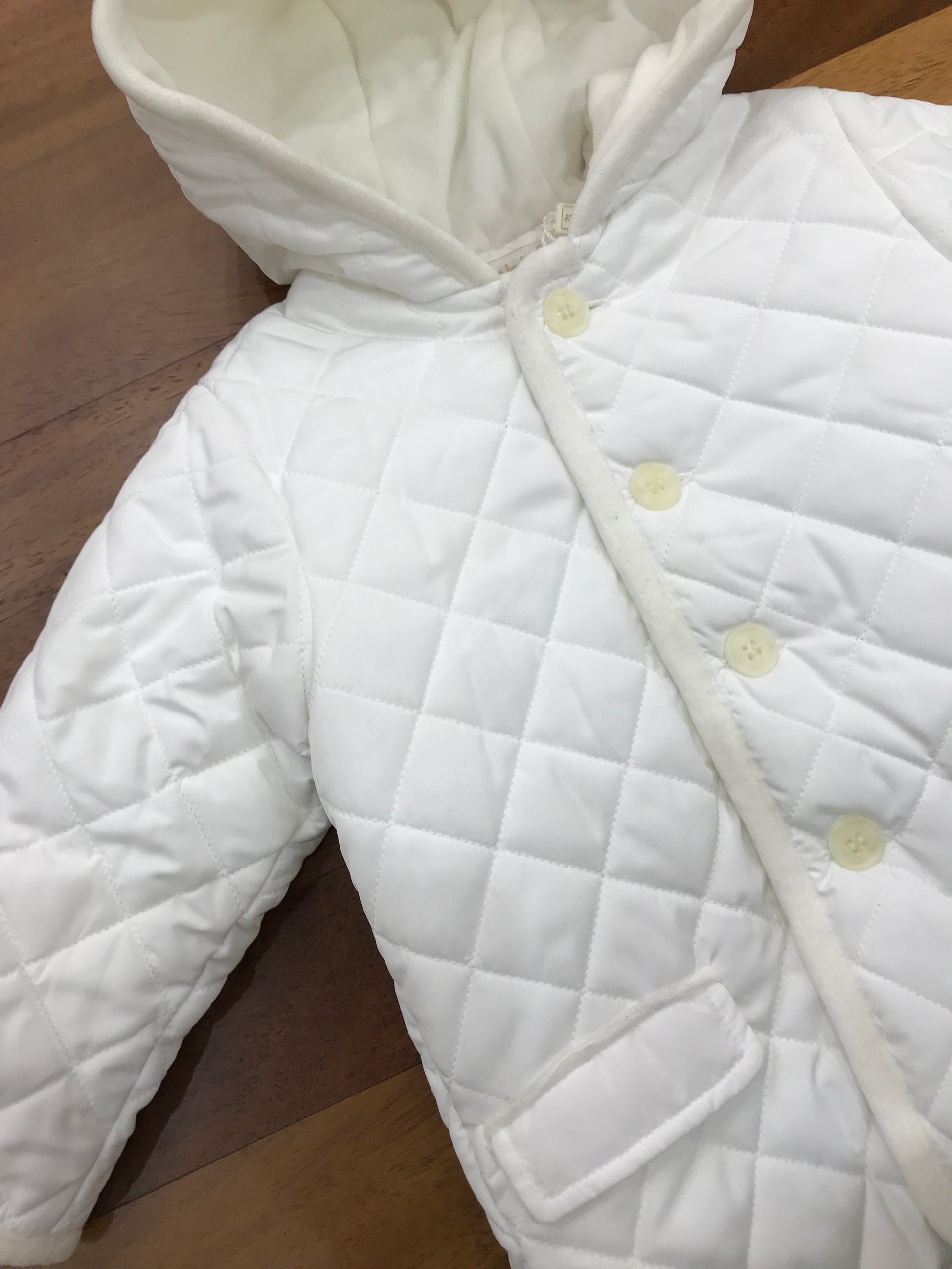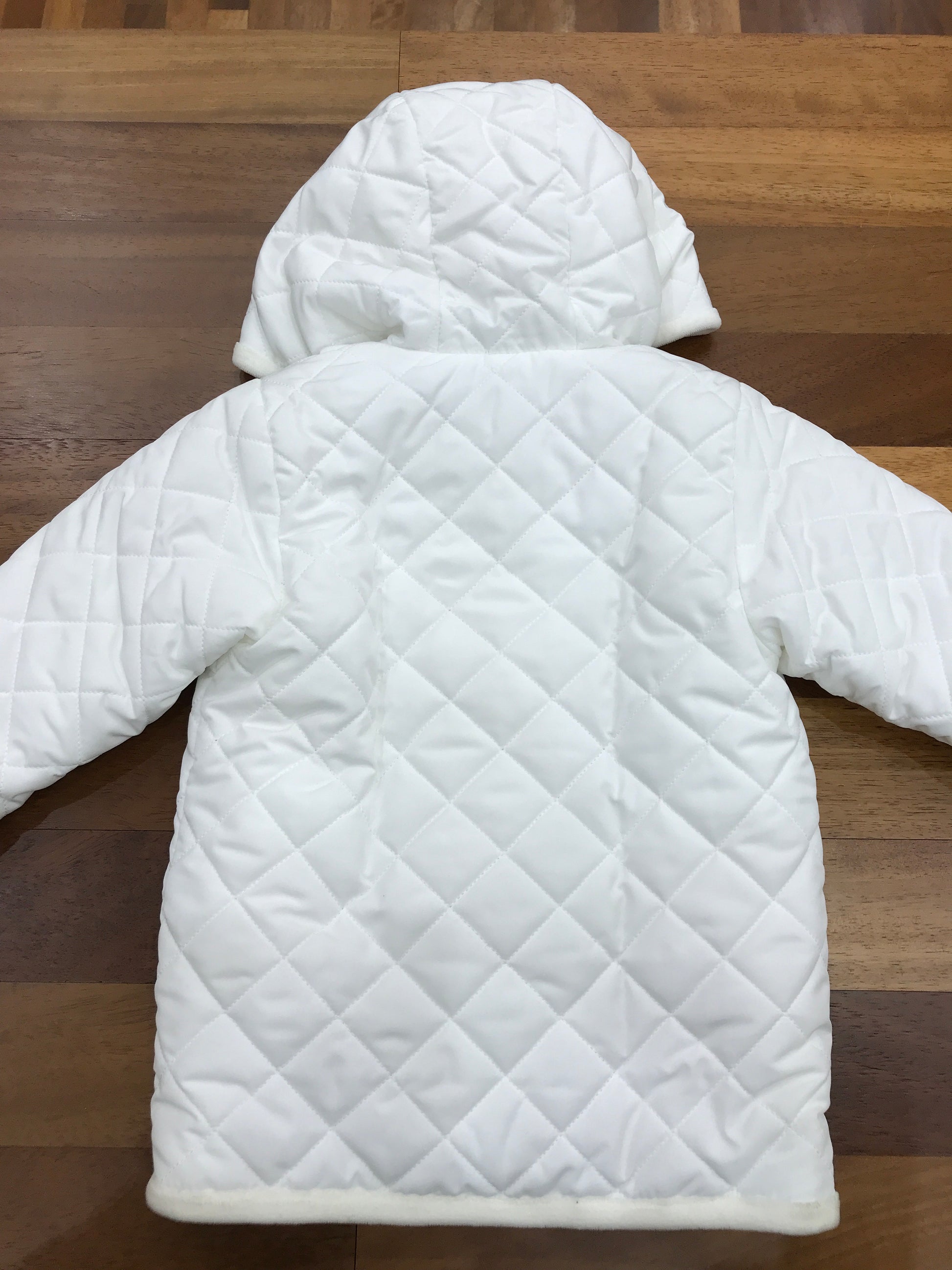 Giubbotto trapuntato in bianco con cappuccio integrato e dettagli di tasche decorative sul fronte. Un capo essenziale dalla costruzione robusta, ideale per proteggere dai primi freddi mantenendo libertà di movimento. La trapuntatura garantisce isolamento termico leggero, mentre il design minimalista si abbina facilmente a qualsiasi guardaroba infantile.