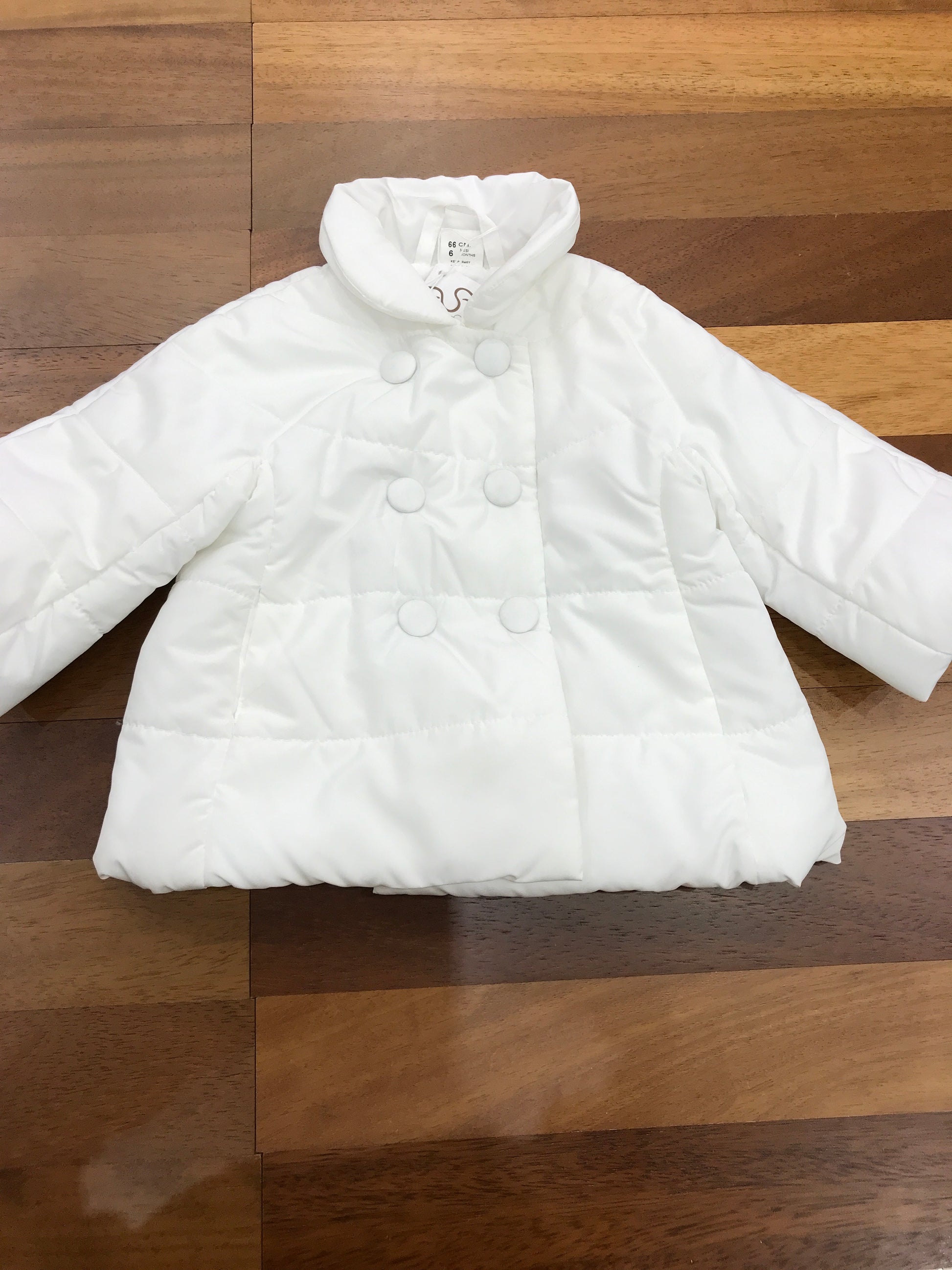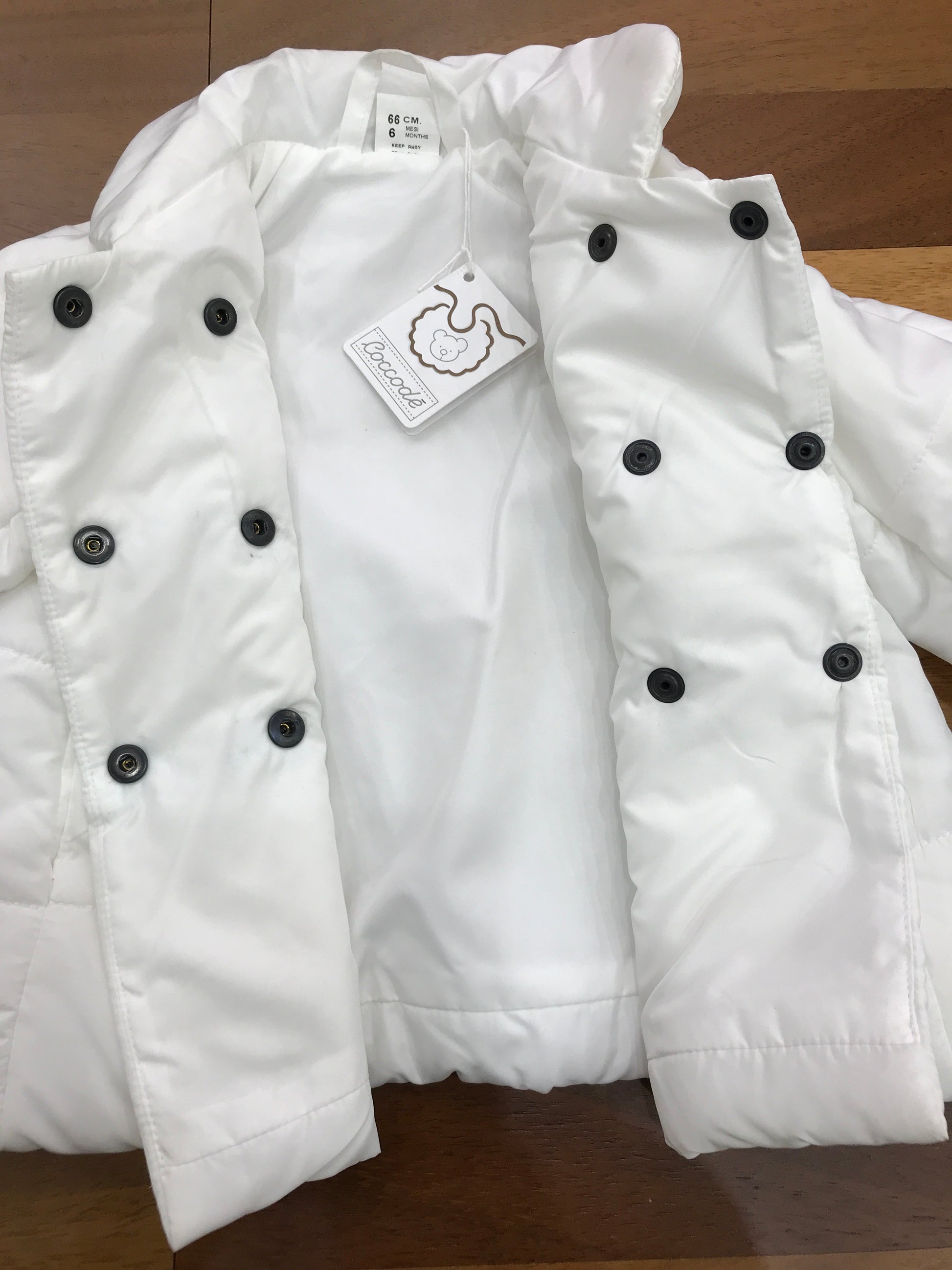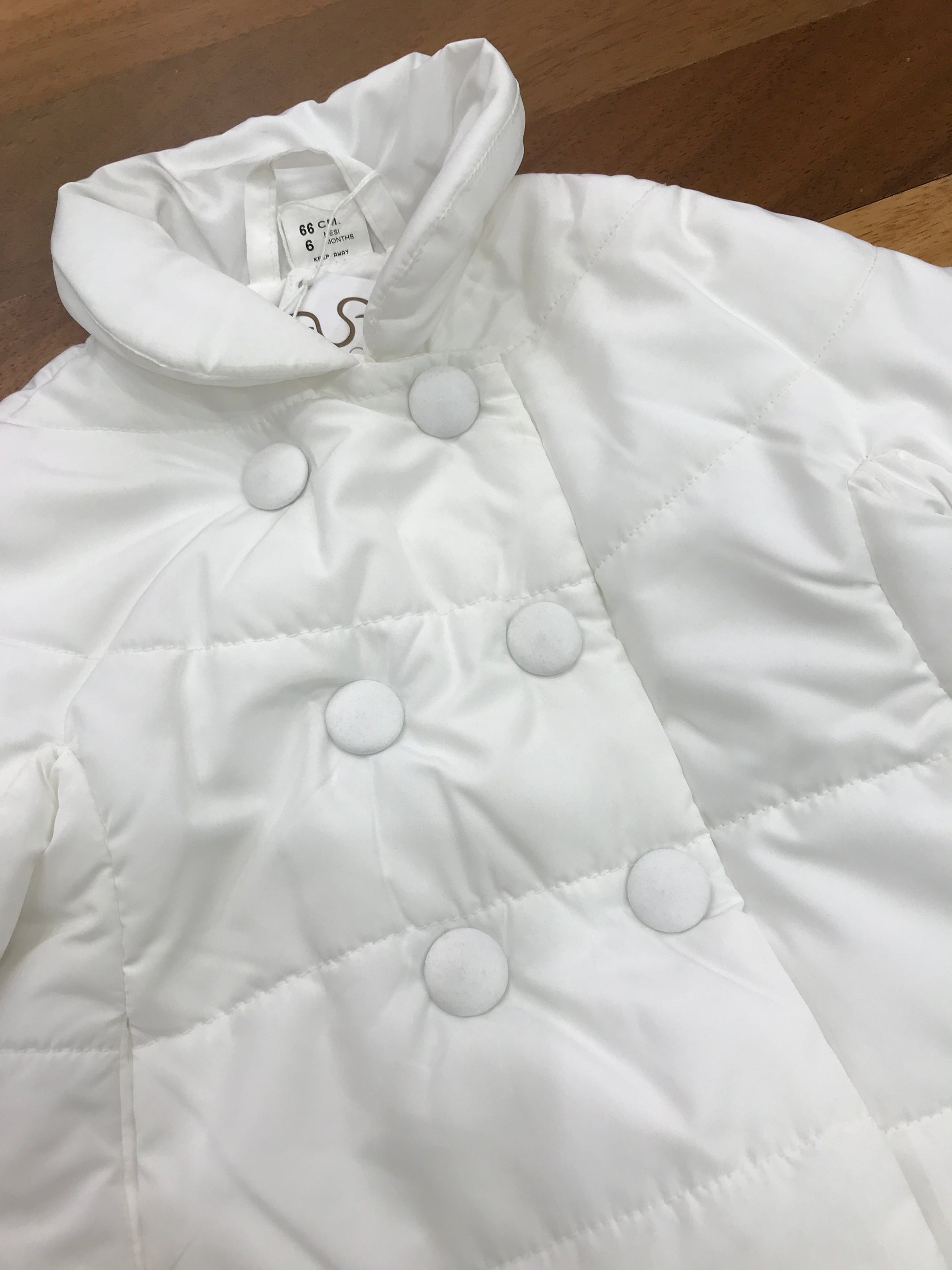 Giacca bianca a taglio svasato con protezione impermeabile, ideale per proteggere i più piccoli dalle intemperie mantenendo libertà di movimento e comfort durante le attività quotidiane.