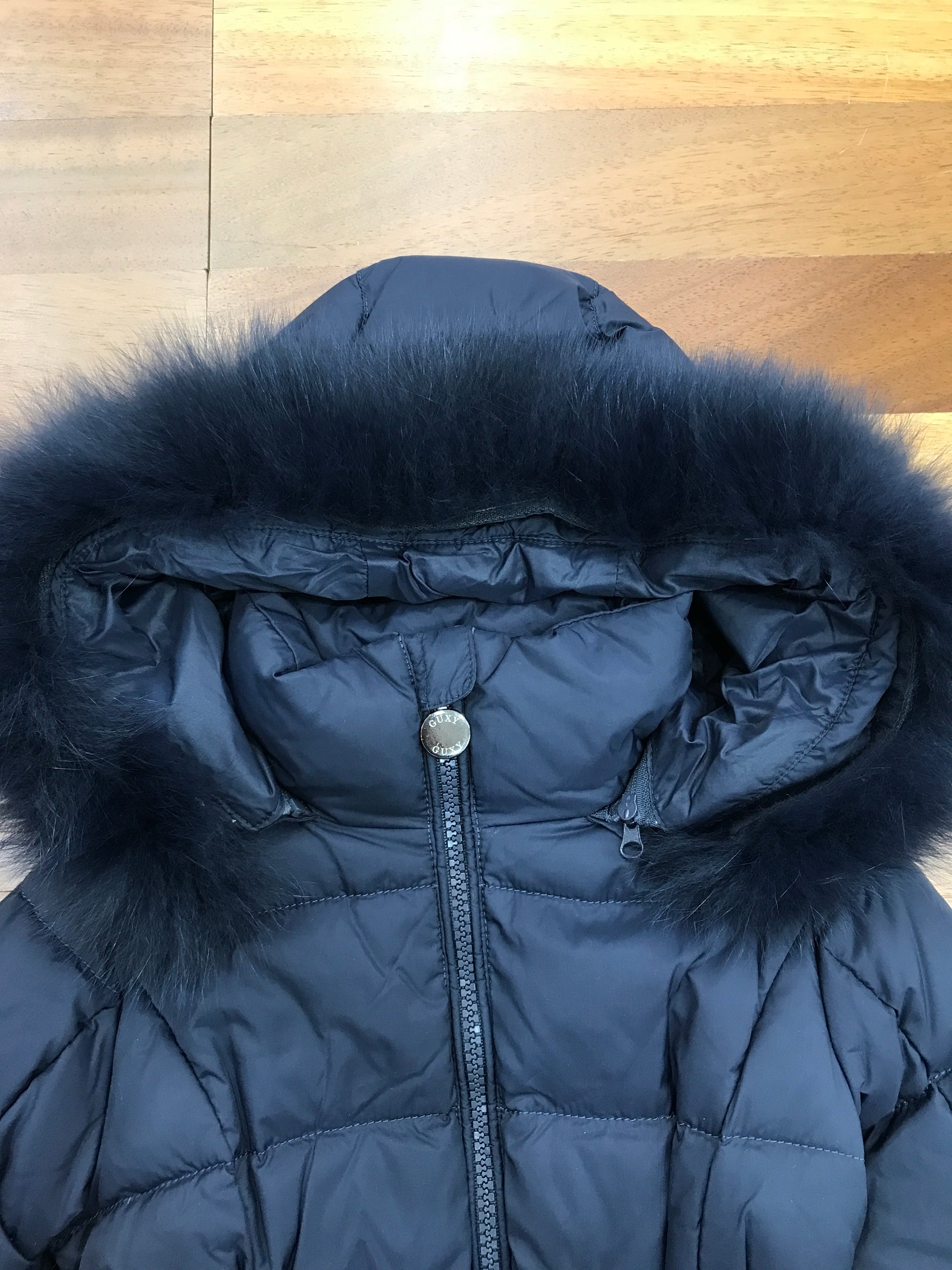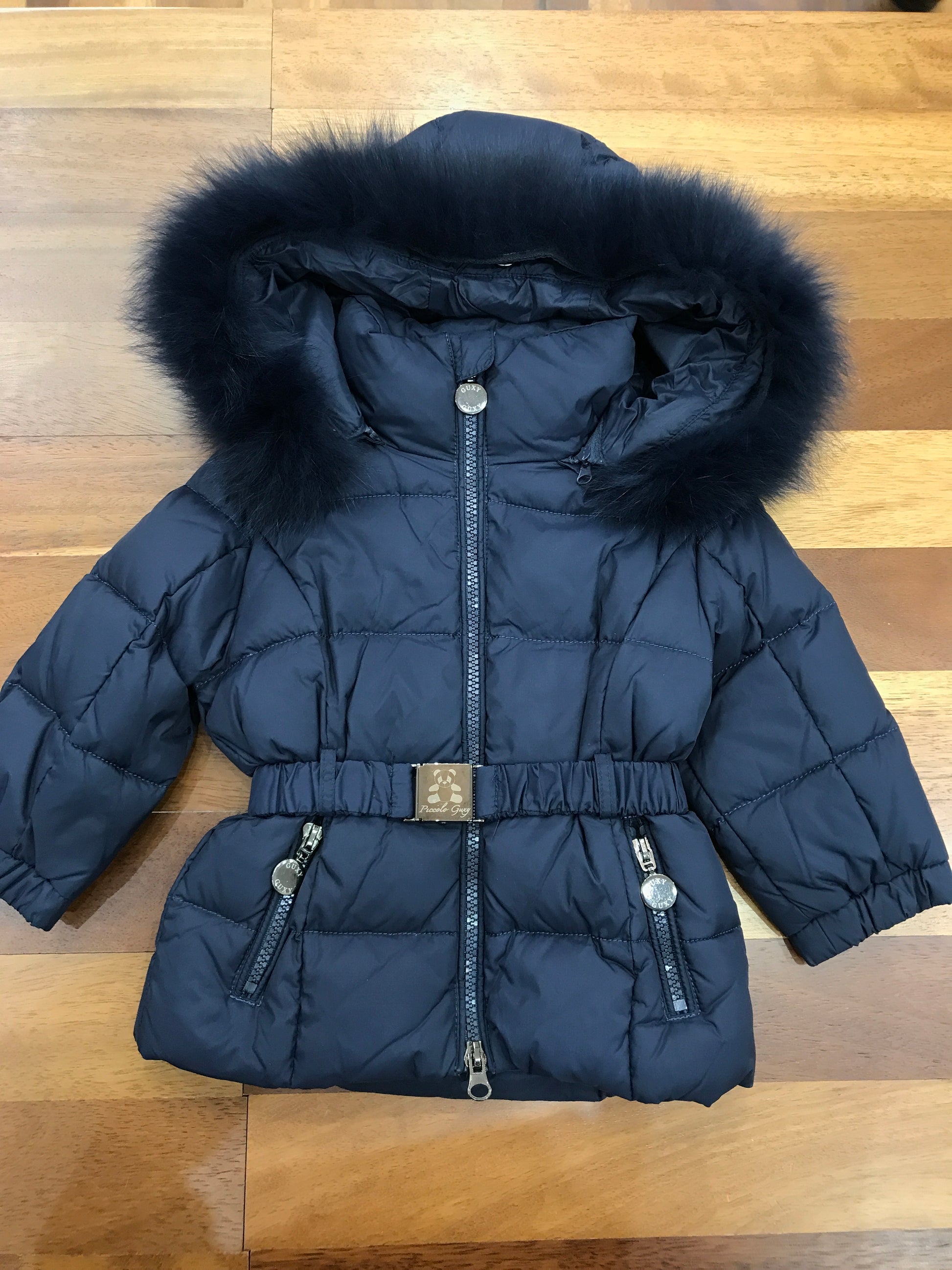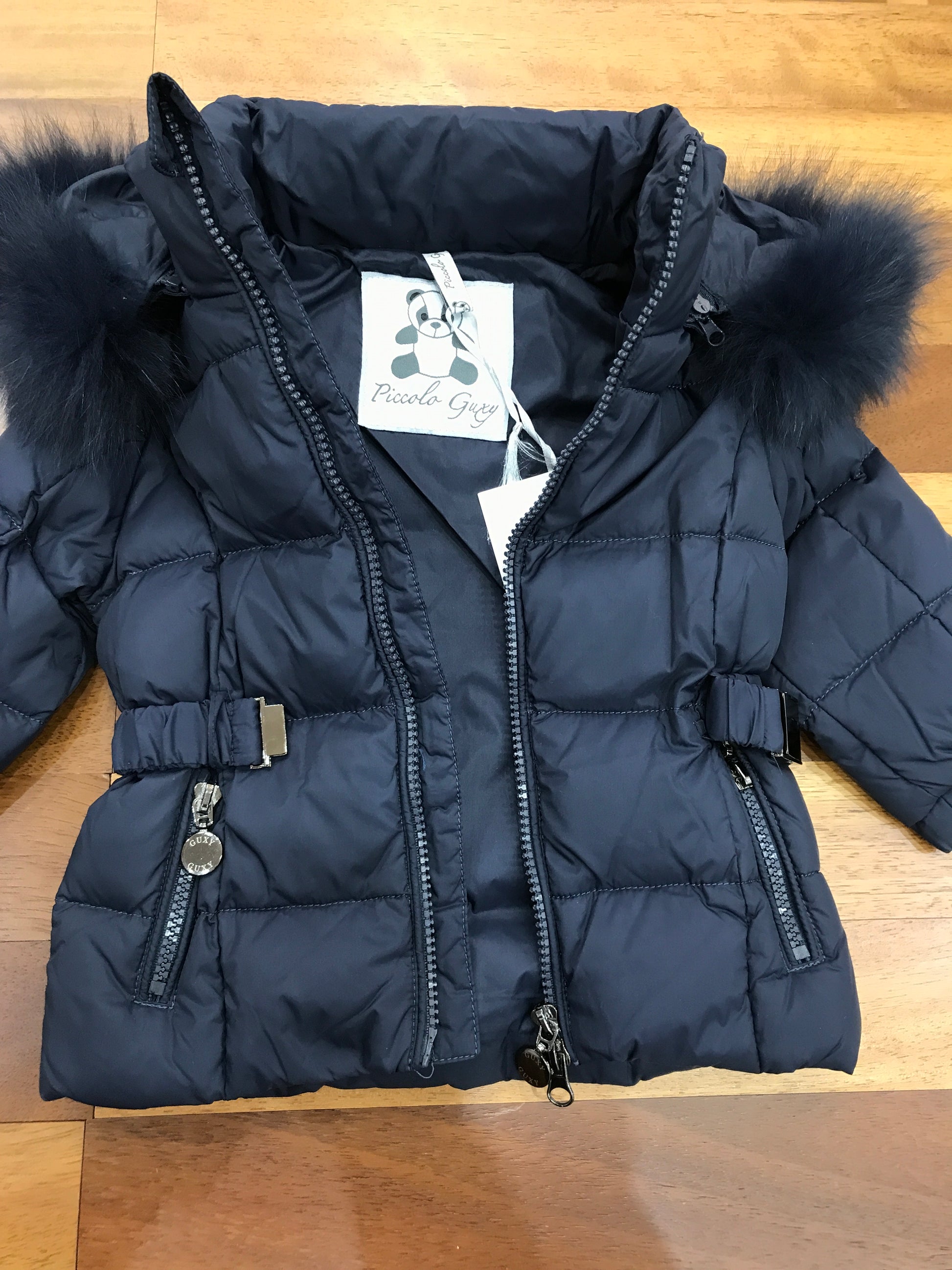 Giubbotto impermeabile imbottito con cappuccio foderato in pelliccia sintetica blu sfumato. Chiusura a bottoni e cintura regolabile in vita per una vestibilità ottimale. Ideale per proteggere i più piccoli dalle intemperie mantenendo calore e comfort durante le stagioni fredde.