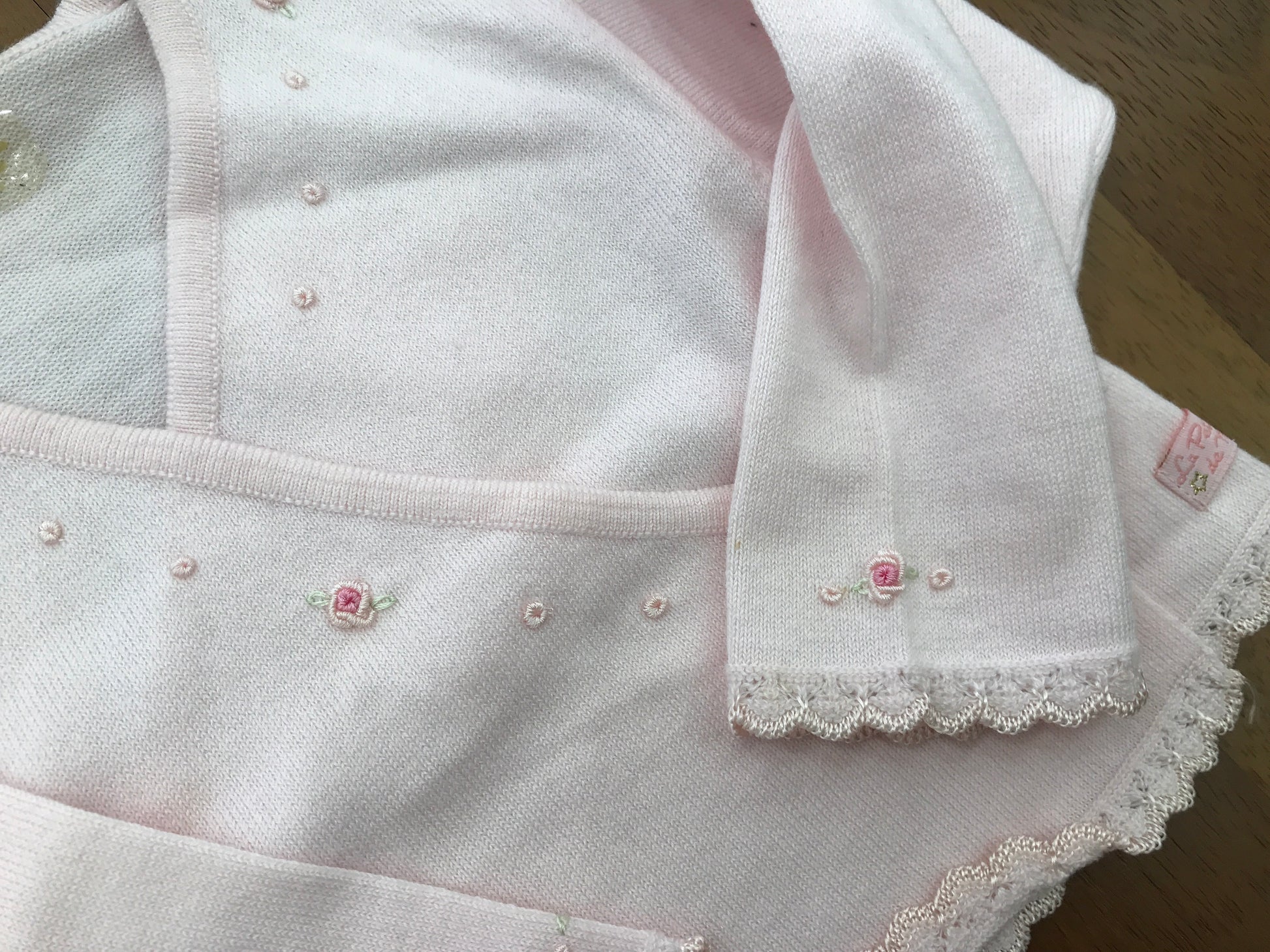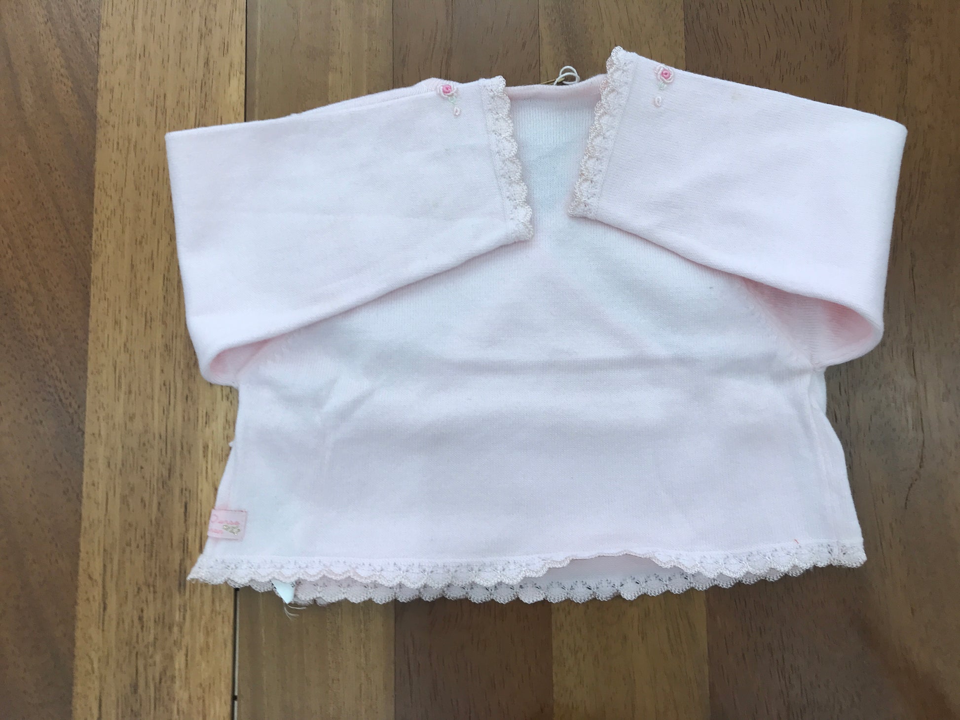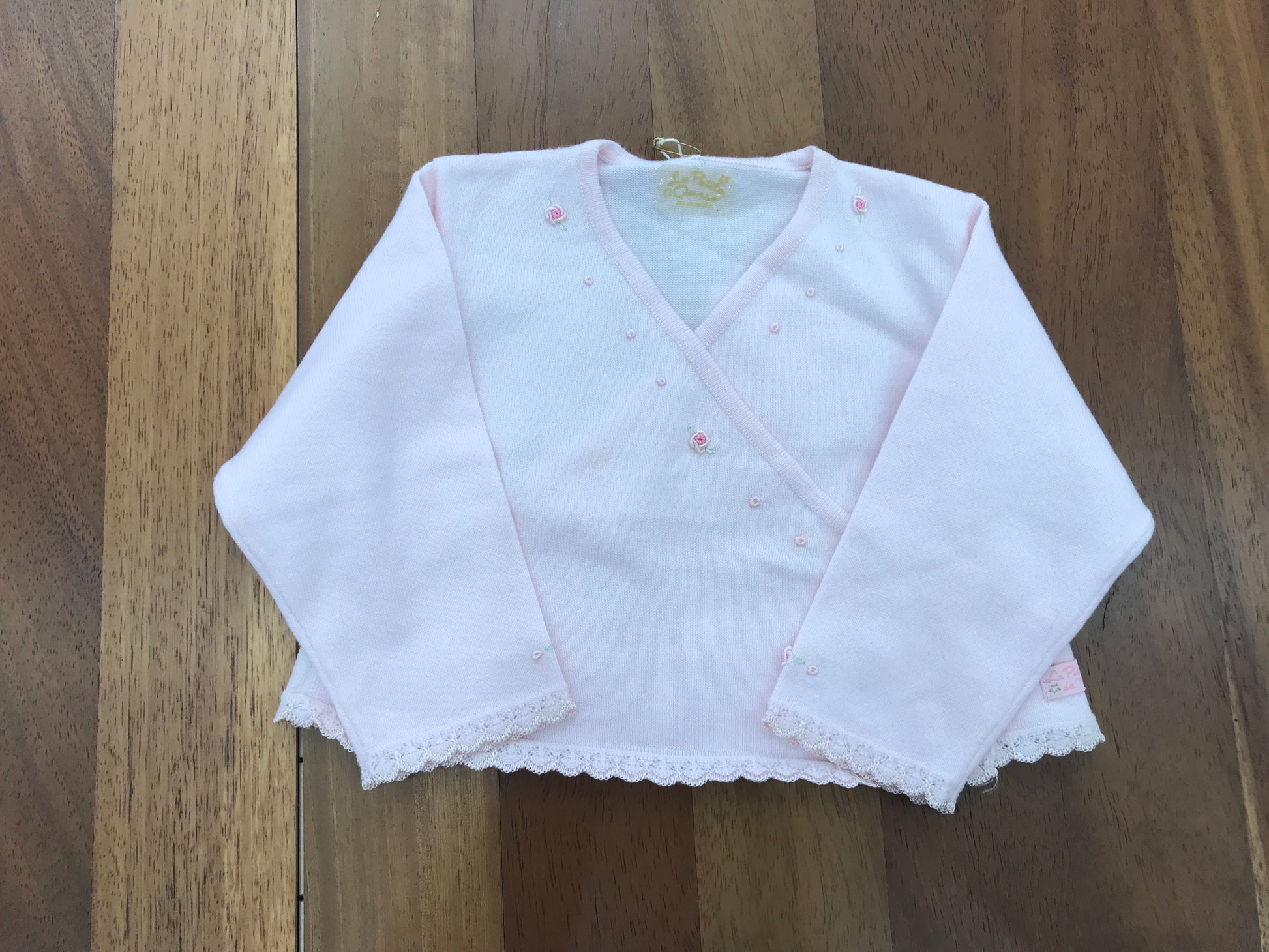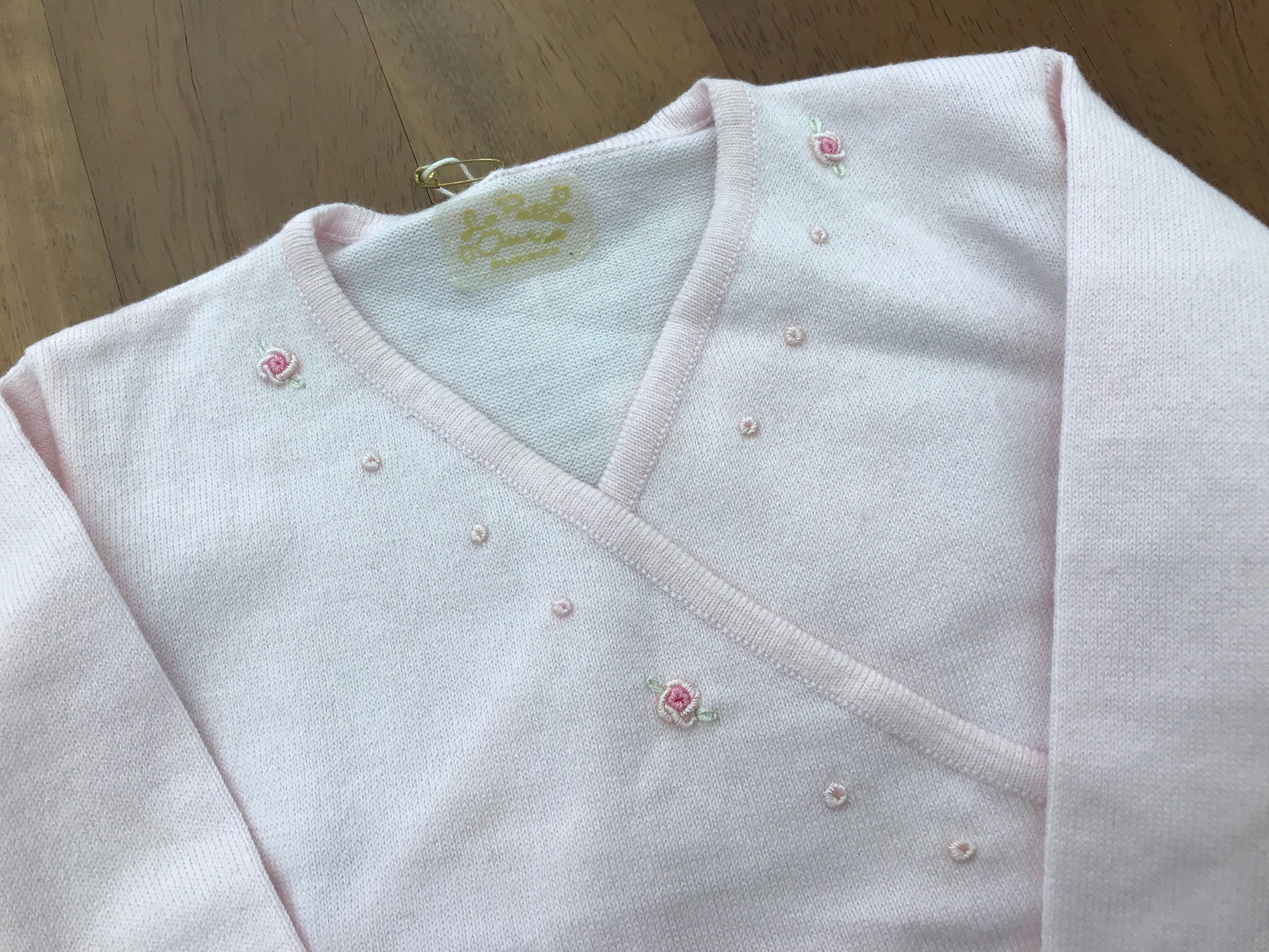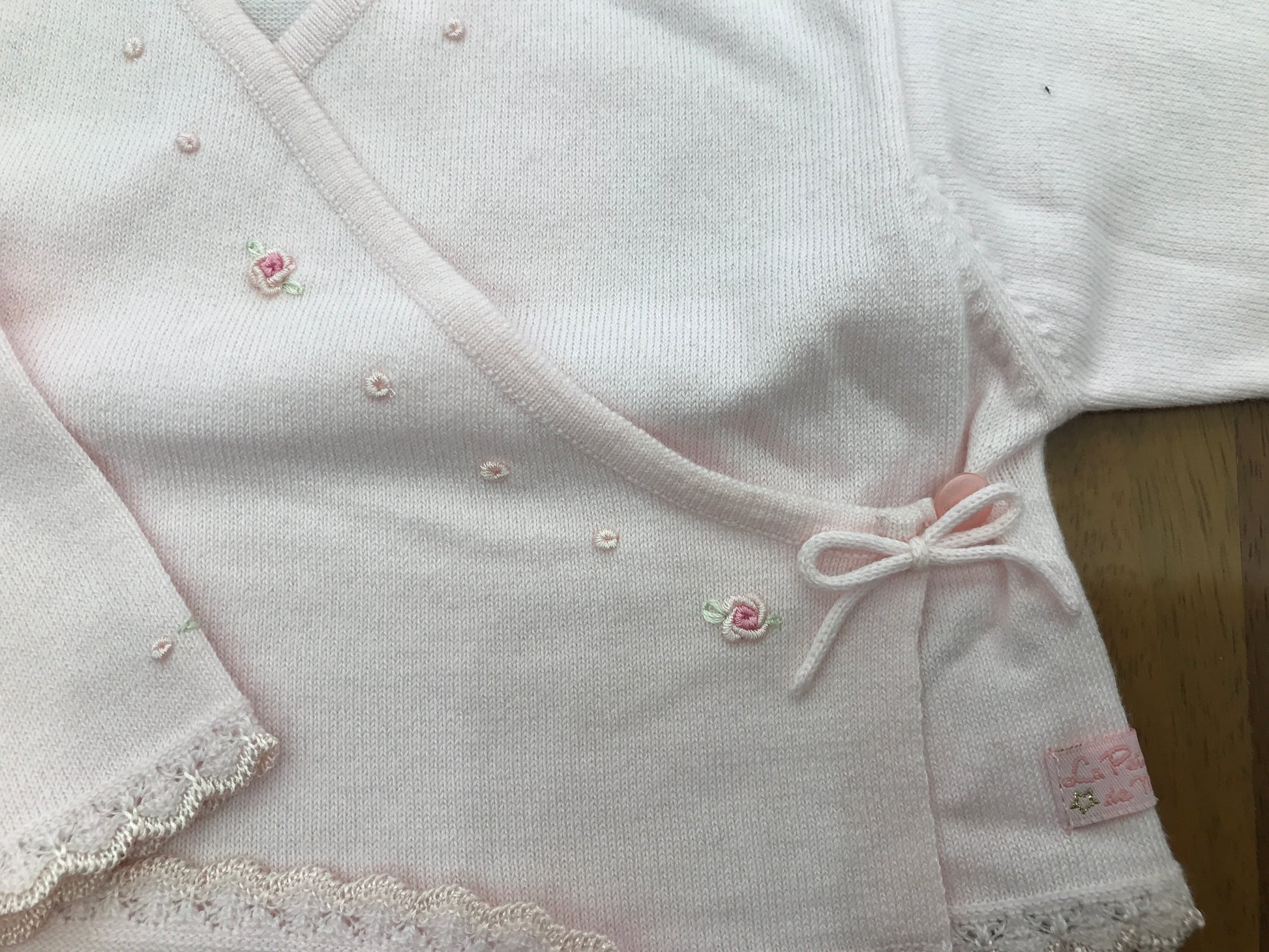 Cardigan in lana rosa dotato di chiusura incrociata, arricchito da delicate roselline ricamate a mano che ne esaltano l’eleganza. Il capo presenta uno smerlo rifinito lungo i bordi, conferendo un tocco raffinato e sofisticato al design classico.