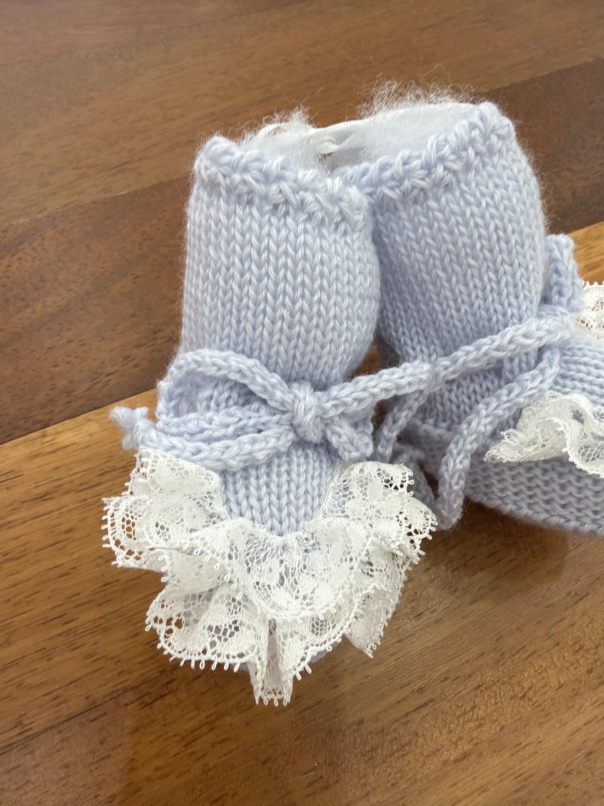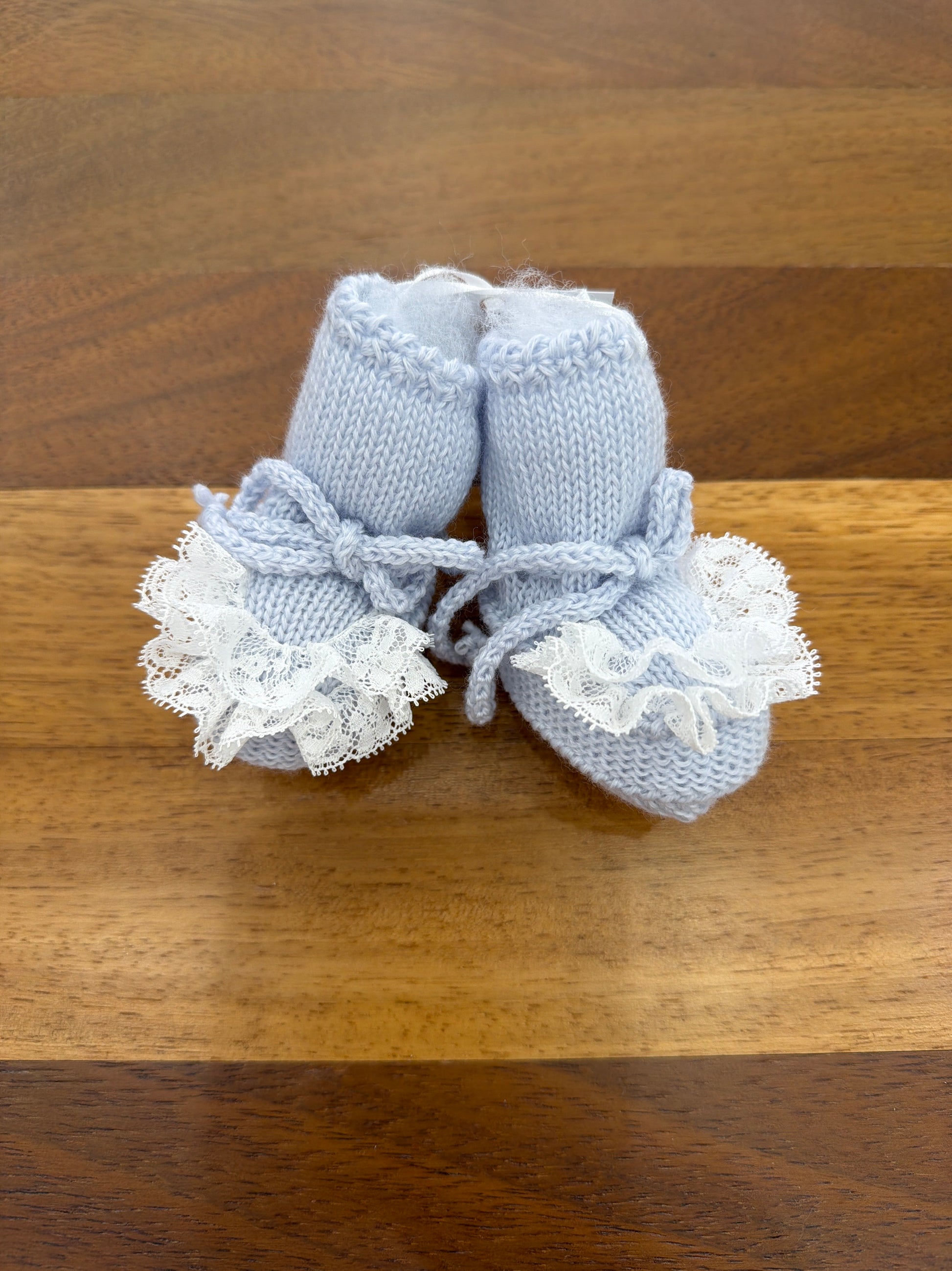 Babbucce in lana color cielo, decorate con pizzo sulla parte anteriore e dotate di chiusura con un piccolo fiocchetto, che permette anche di regolare la vestibilità.