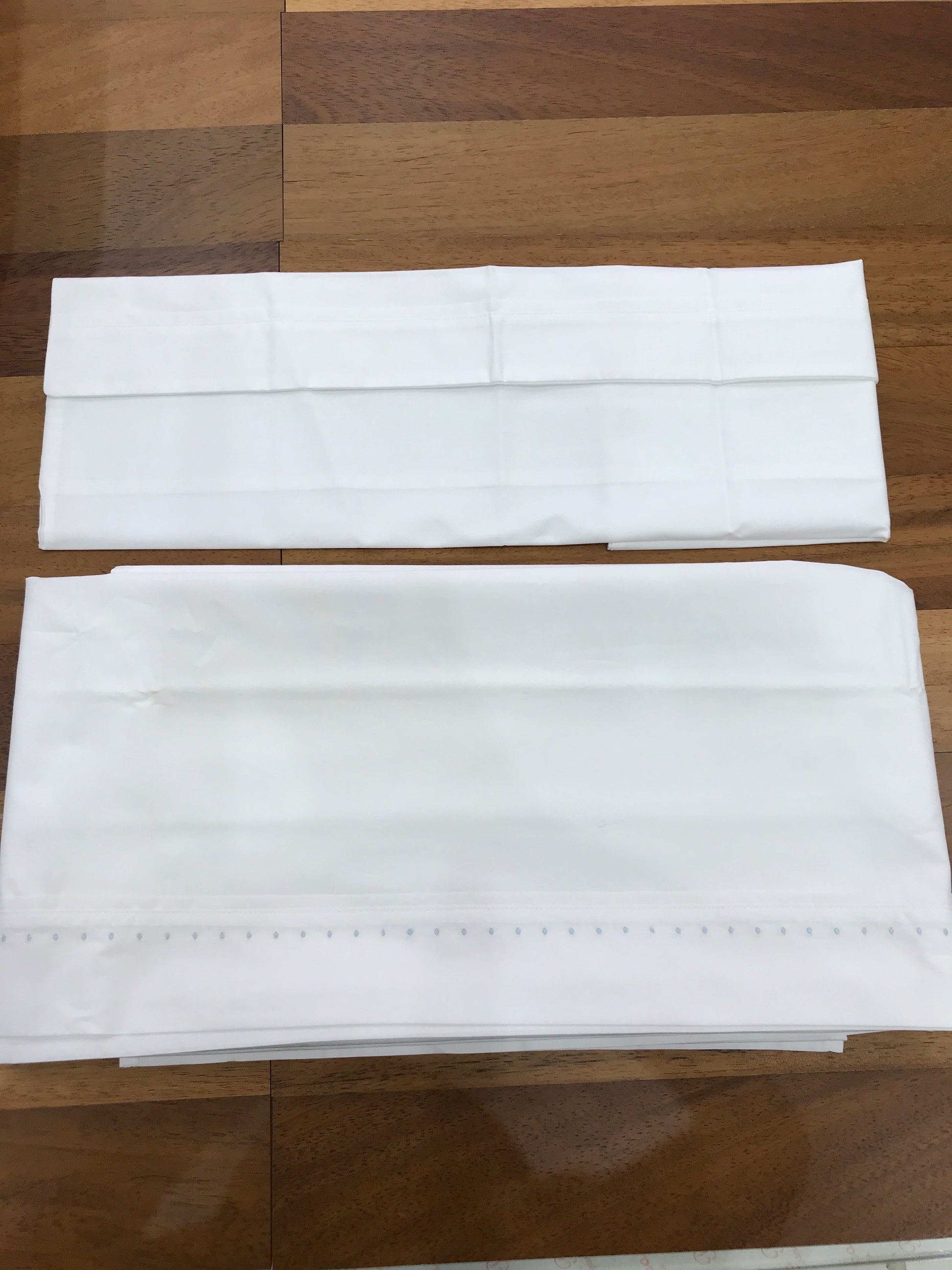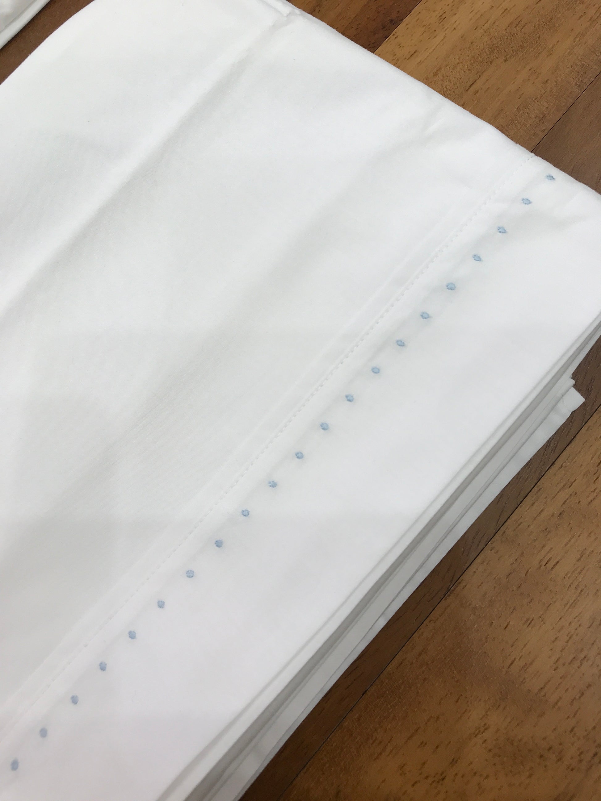 Lenzuola bianche essenziali con piccoli pois celesti delicati, mentre la federa del cuscino mantiene un design completamente bianco e sobrio.