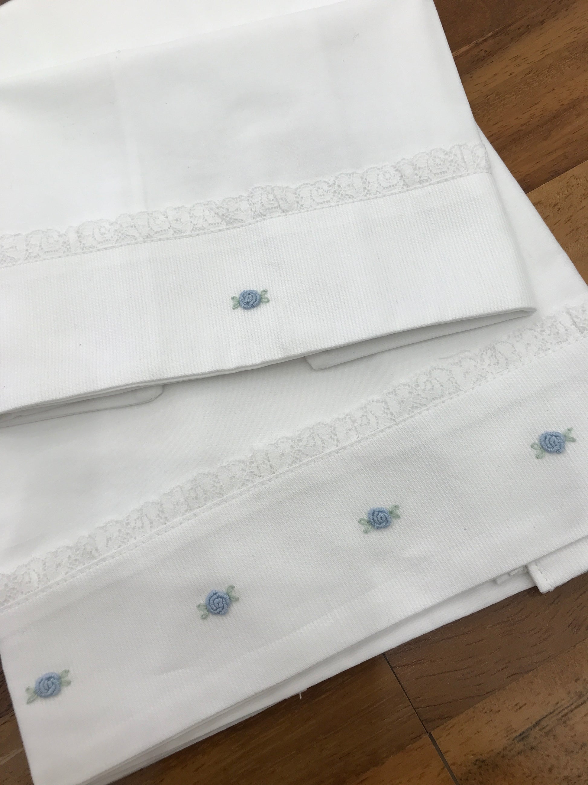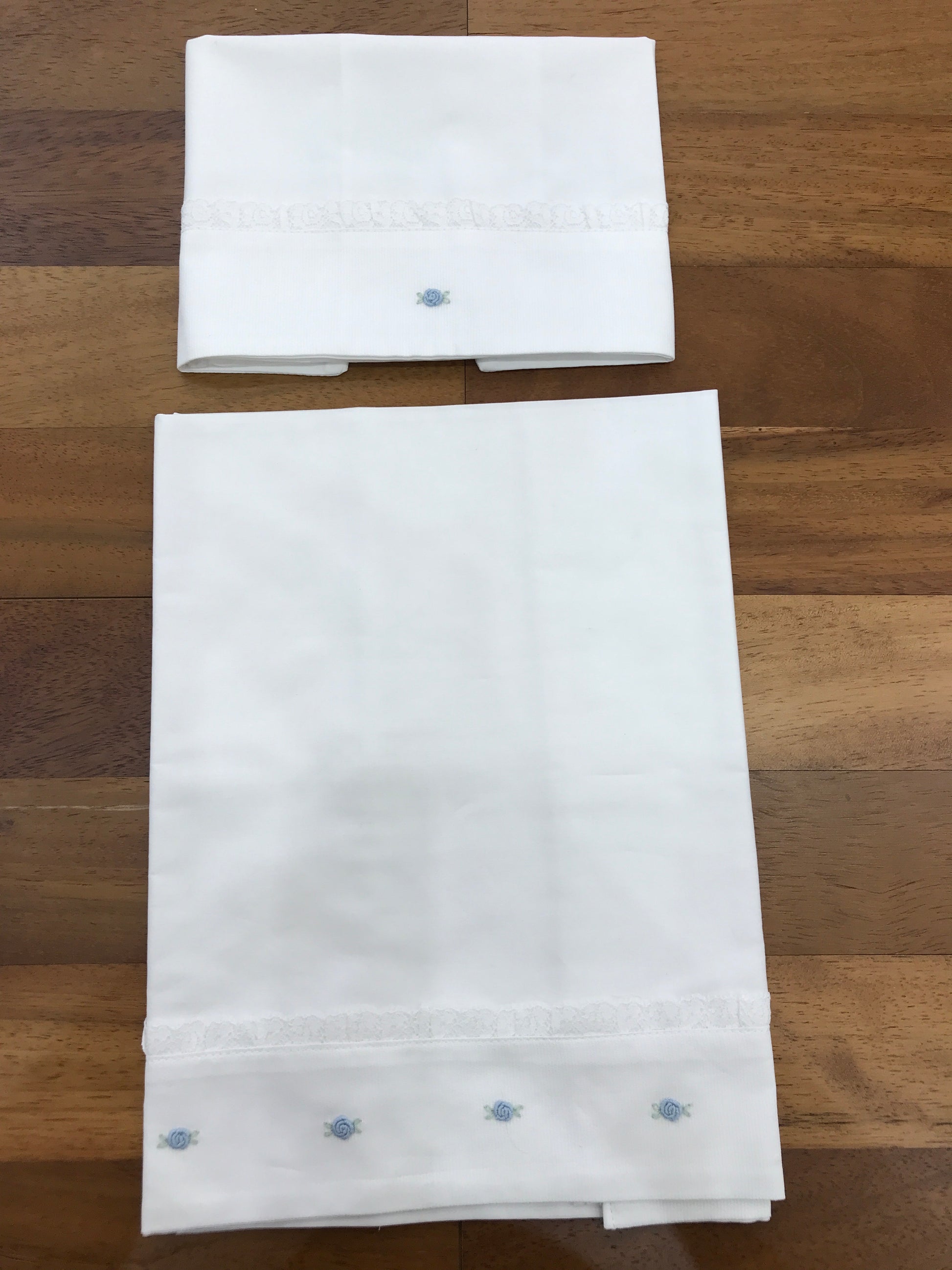 Lenzuola bianche arricchite da un merletto ricamato e delicate roselline celesti , con lo stesso motivo decorativo presente anche sulla federa del cuscino.