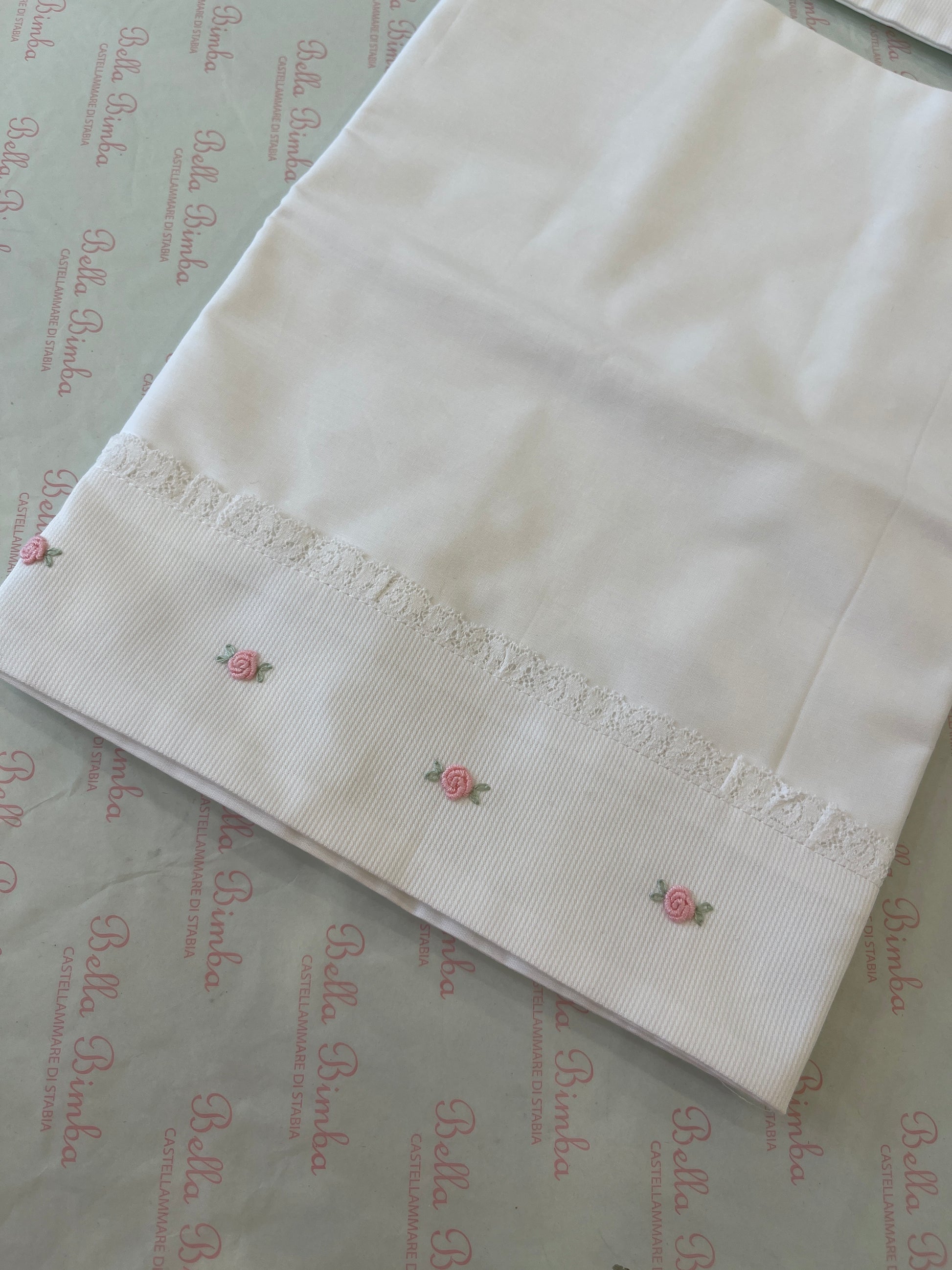 Lenzuola bianche arricchite da un merletto ricamato e delicate roselline rosa , con lo stesso motivo decorativo presente anche sulla federa del cuscino.