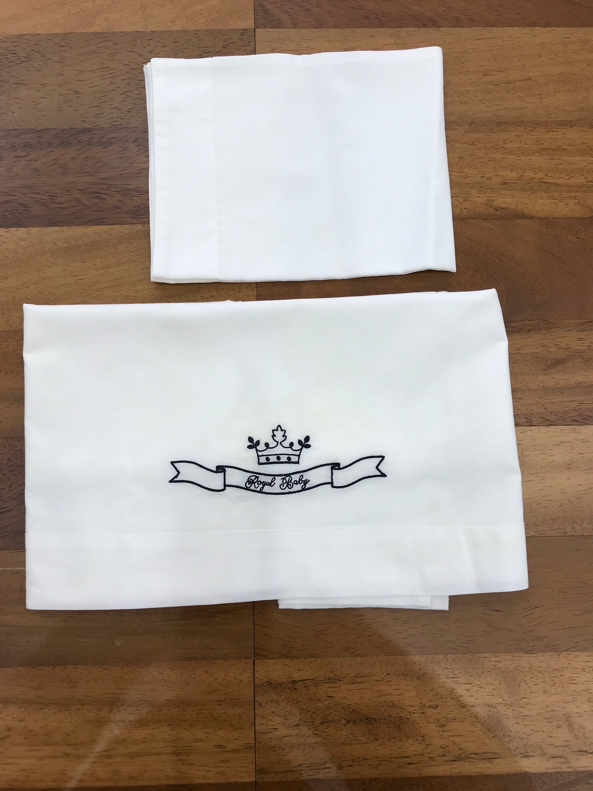 Set di lenzuola caratterizzato da un elegante ricamo a forma di coroncina blu, abbinato a una federa bianca dal design semplice e raffinato, ideale per aggiungere un tocco di classe e comfort al letto.