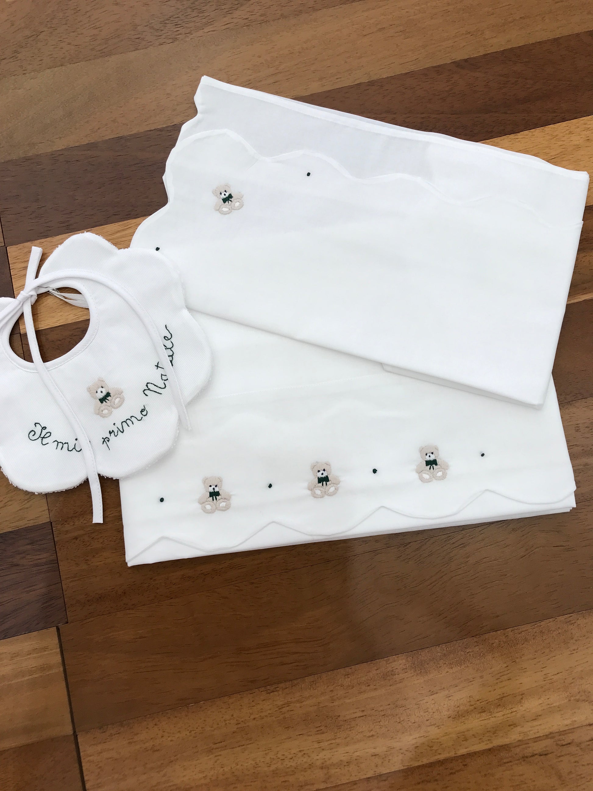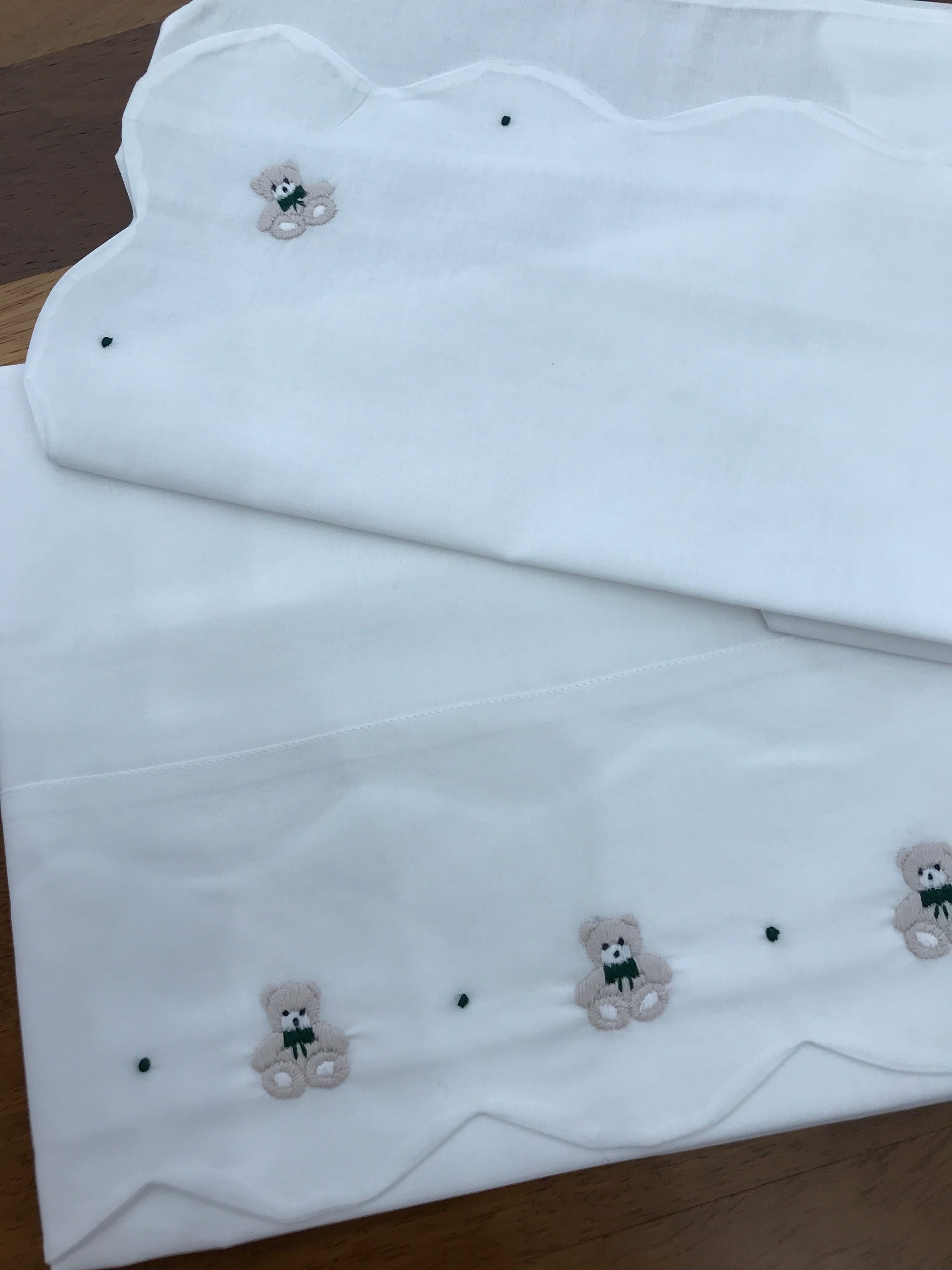 Lenzuolino realizzato in battista di cotone, con bordo smerlo e orsetti ricamati adornati da fiocchetti verdi. Presenta inoltre dettagli a pois verdi , con ricami e decorazioni che si estendono anche sulla federa.