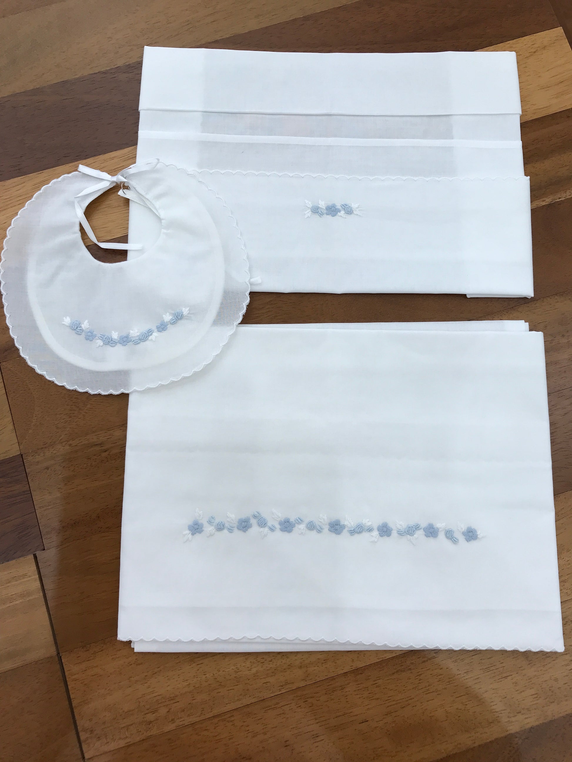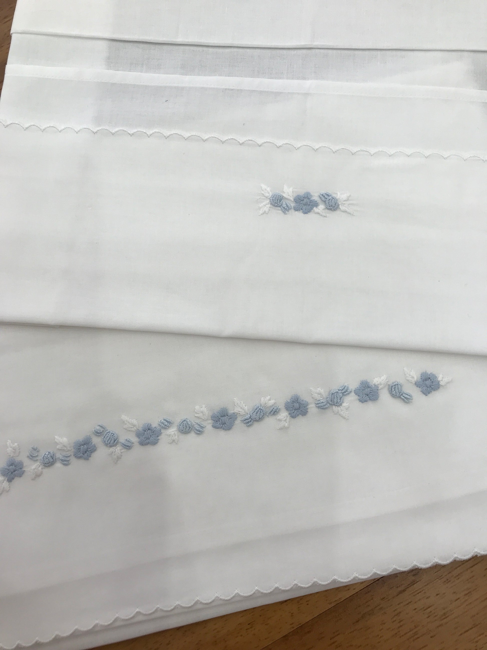 Lenzuolino realizzato in battista di cotone smerlato, arricchito da una decorazione di piccoli fiori in due sfumature di celeste, presente sia sul lenzuolo che sulla federa.