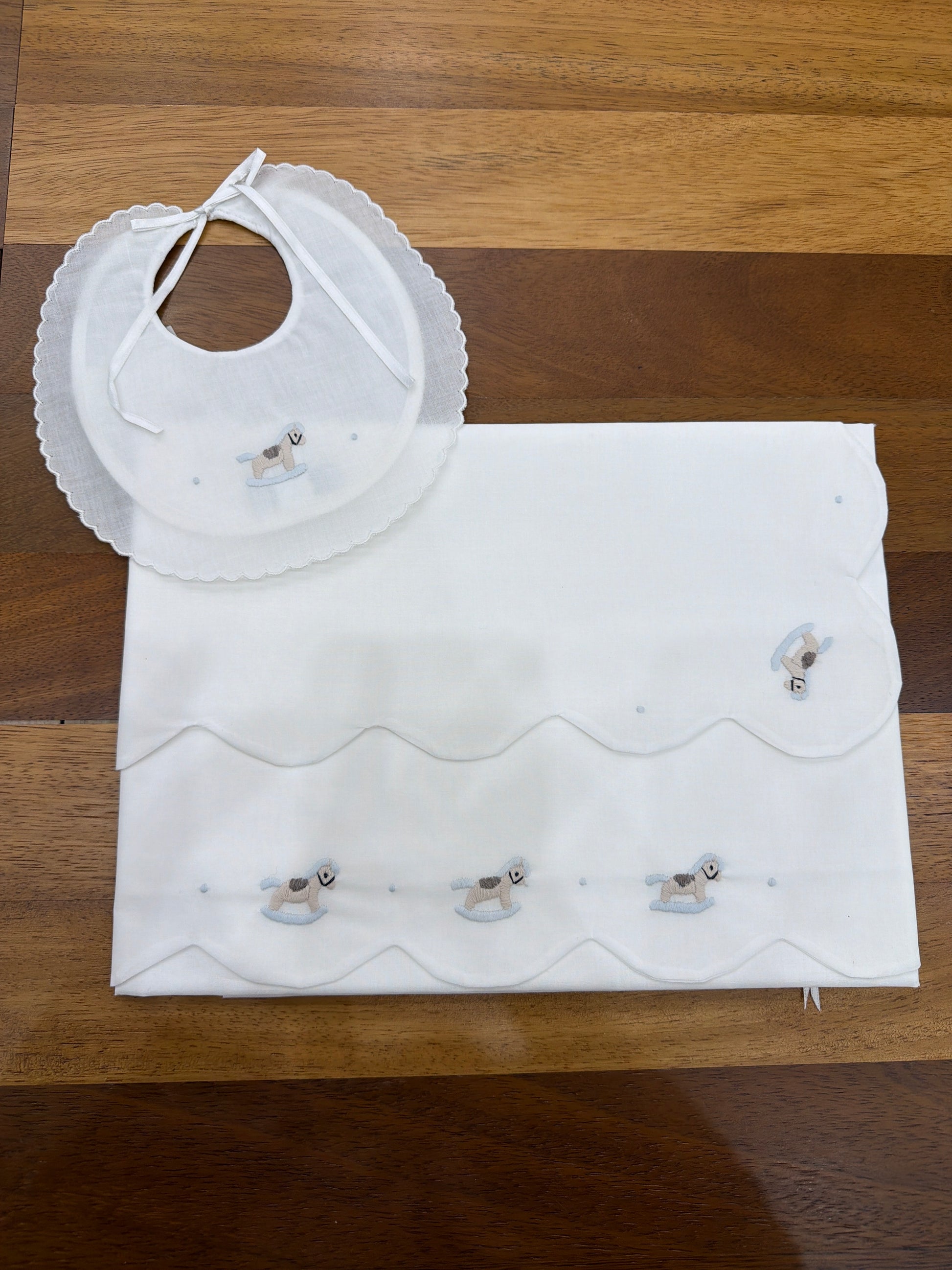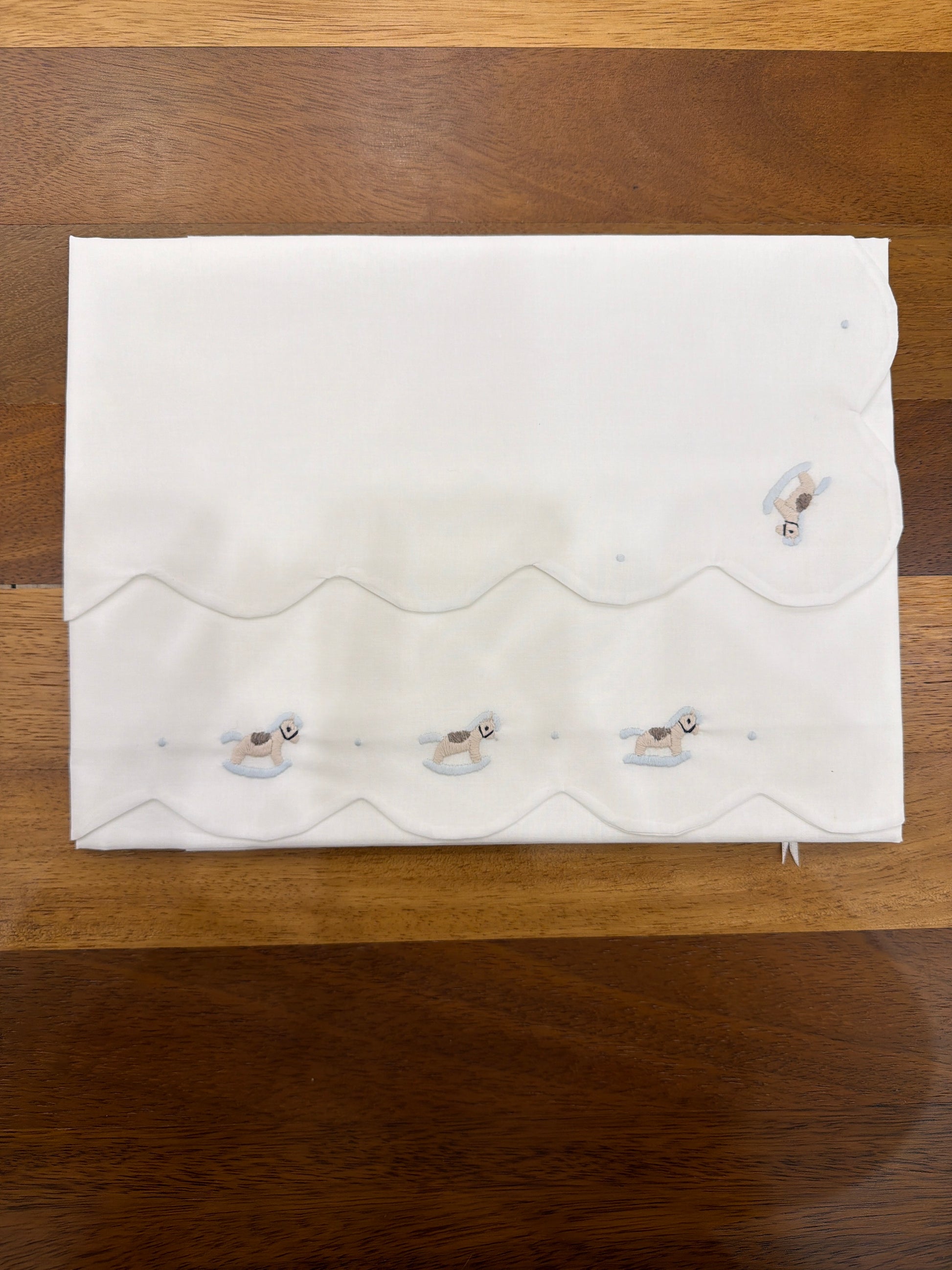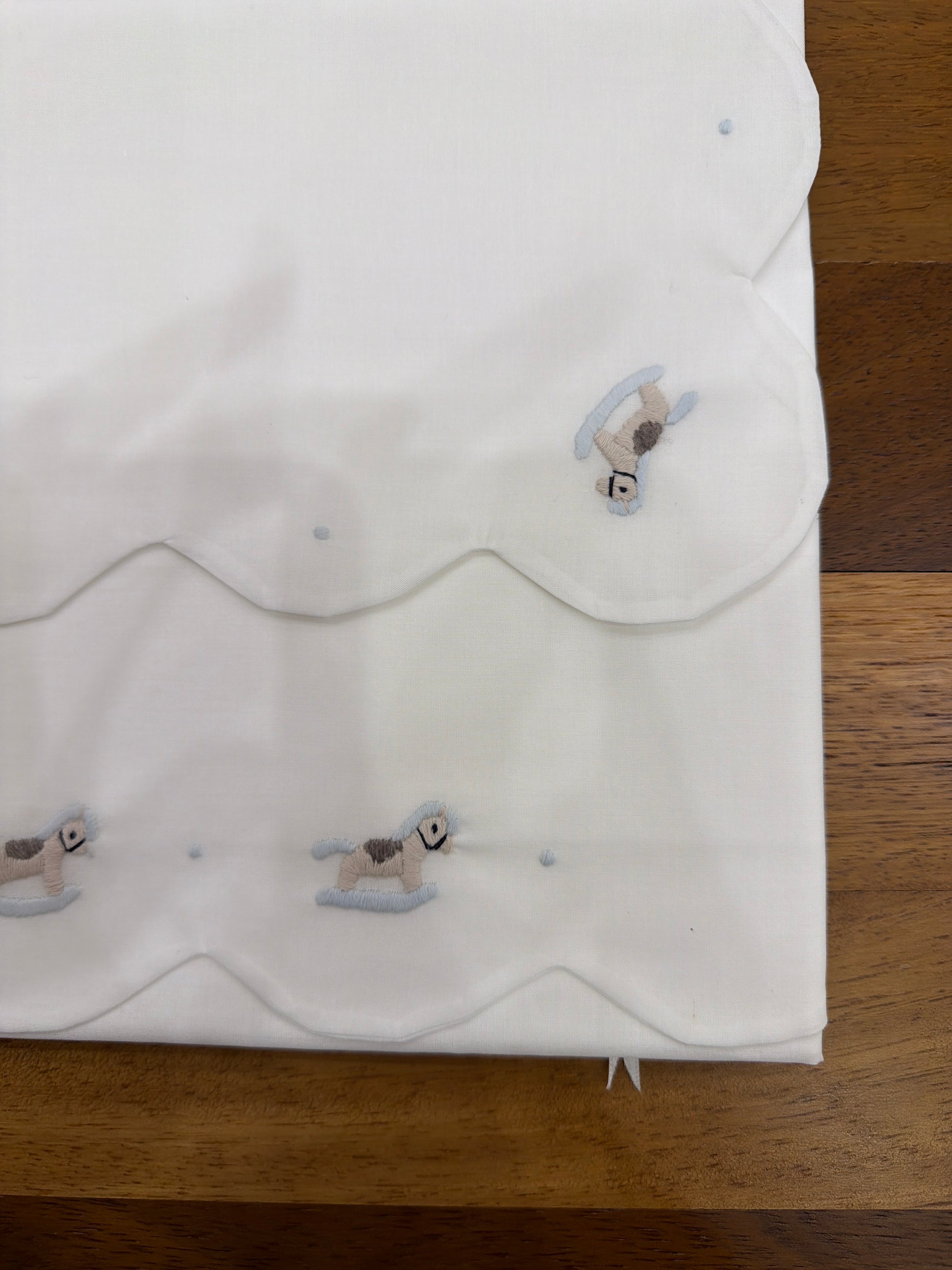 Realizzato in morbido cotone, questo lenzuolino presenta un delicato motivo di colibrì ed è rifinito con un bordo smerlato che aggiunge un tocco di raffinatezza. La superficie è decorata con piccoli cavalli a dondolo celesti, conferendo un aspetto giocoso ed elegante. La federa del cuscino riprende la stessa decorazione, creando un coordinato armonioso e curato in ogni dettaglio, ideale per chi cerca qualità e stile in un capo tessile per la camera dei bambini.