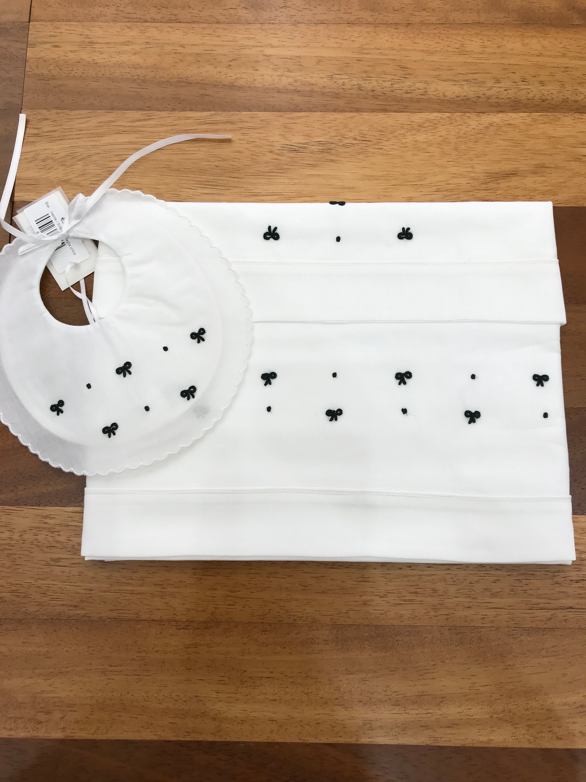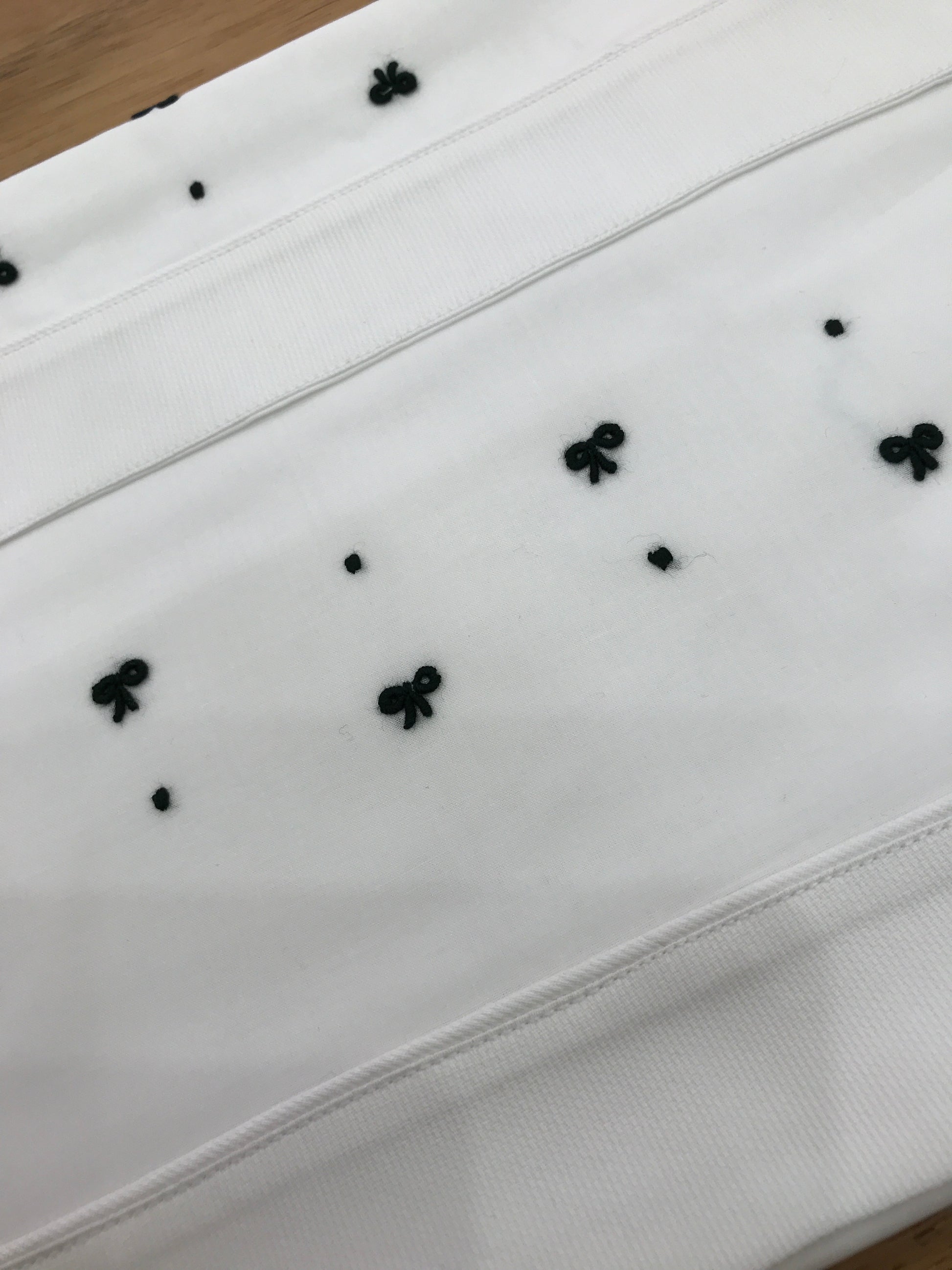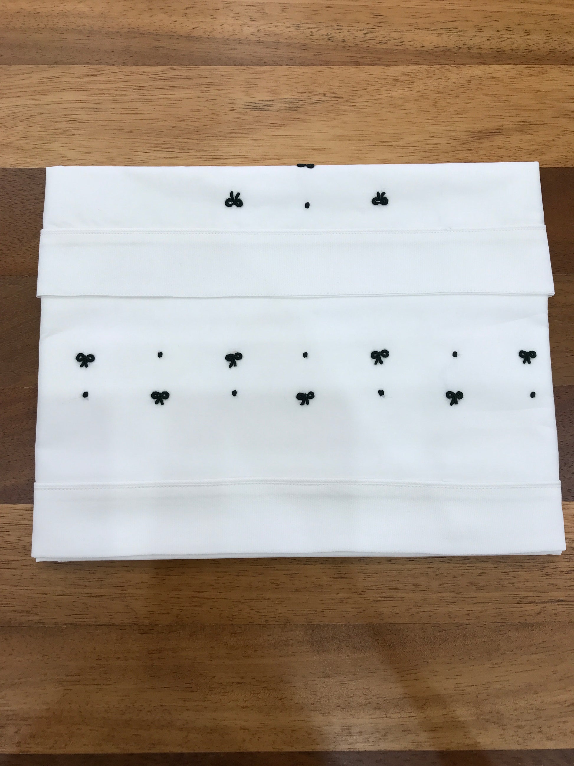Lenzuola bianche decorate con pois verdi ricamati e fiocchetti verdi ricamati, con federa coordinata dallo stesso motivo.