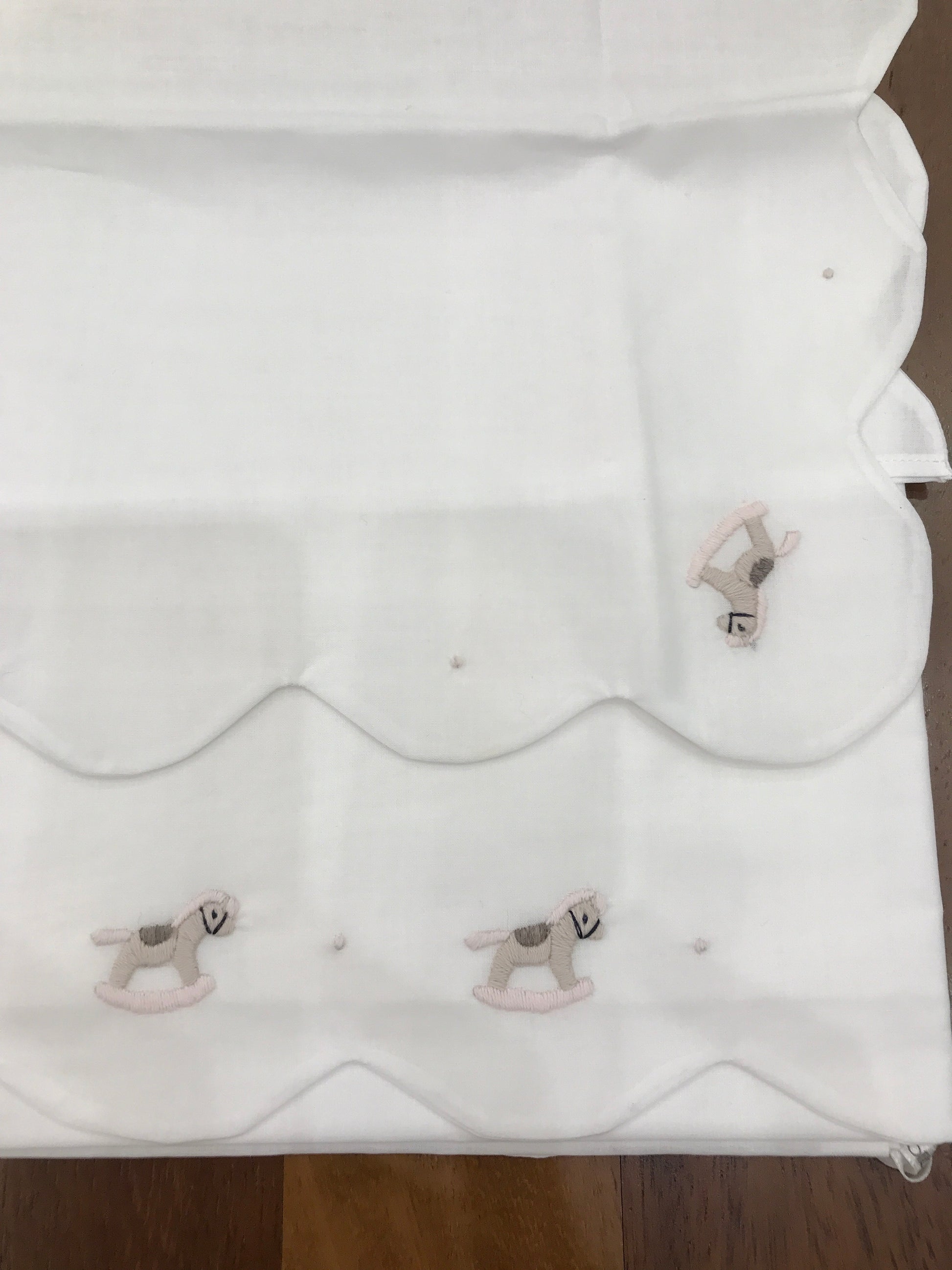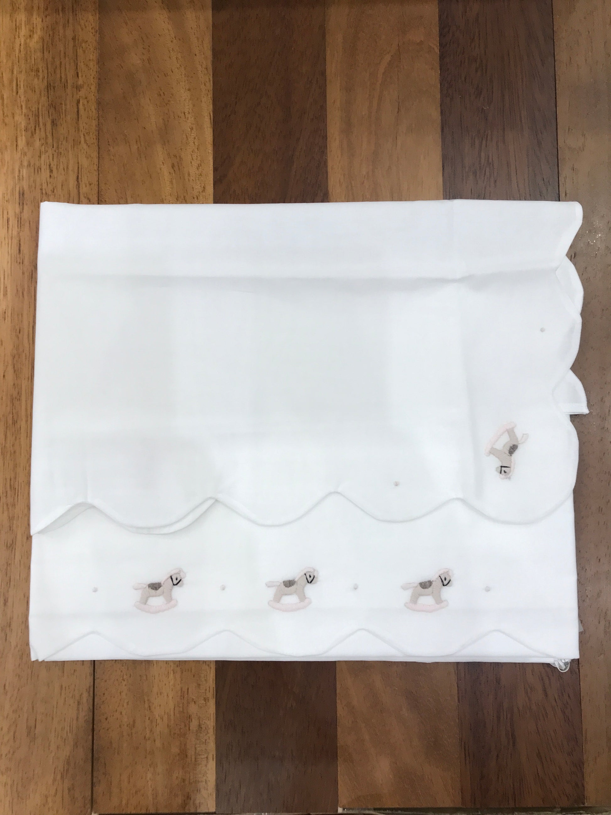Delicato lenzuolino in puro cotone bianco arricchito da un ricamo raffinato di cavalli a dondolo sul fronte. Il bordo smerlato conferisce un tocco elegante e tradizionale, mentre i dettagli in rosa e toro completano il design. La federa abbinata riprende la medesima decorazione, creando un set coordinato e armonioso. Ideale per la cameretta, combina qualità tessile e cura estetica in ogni dettaglio.