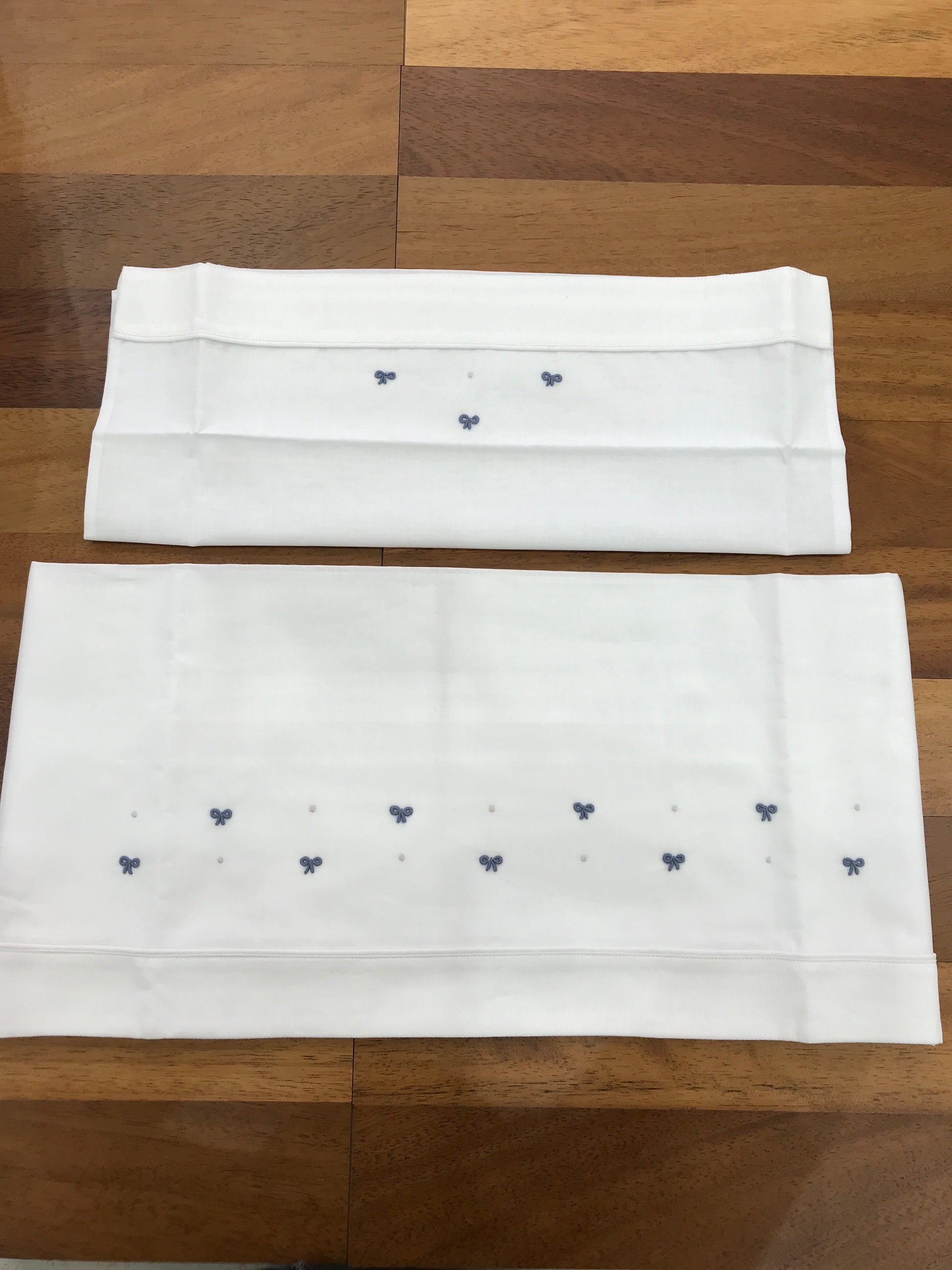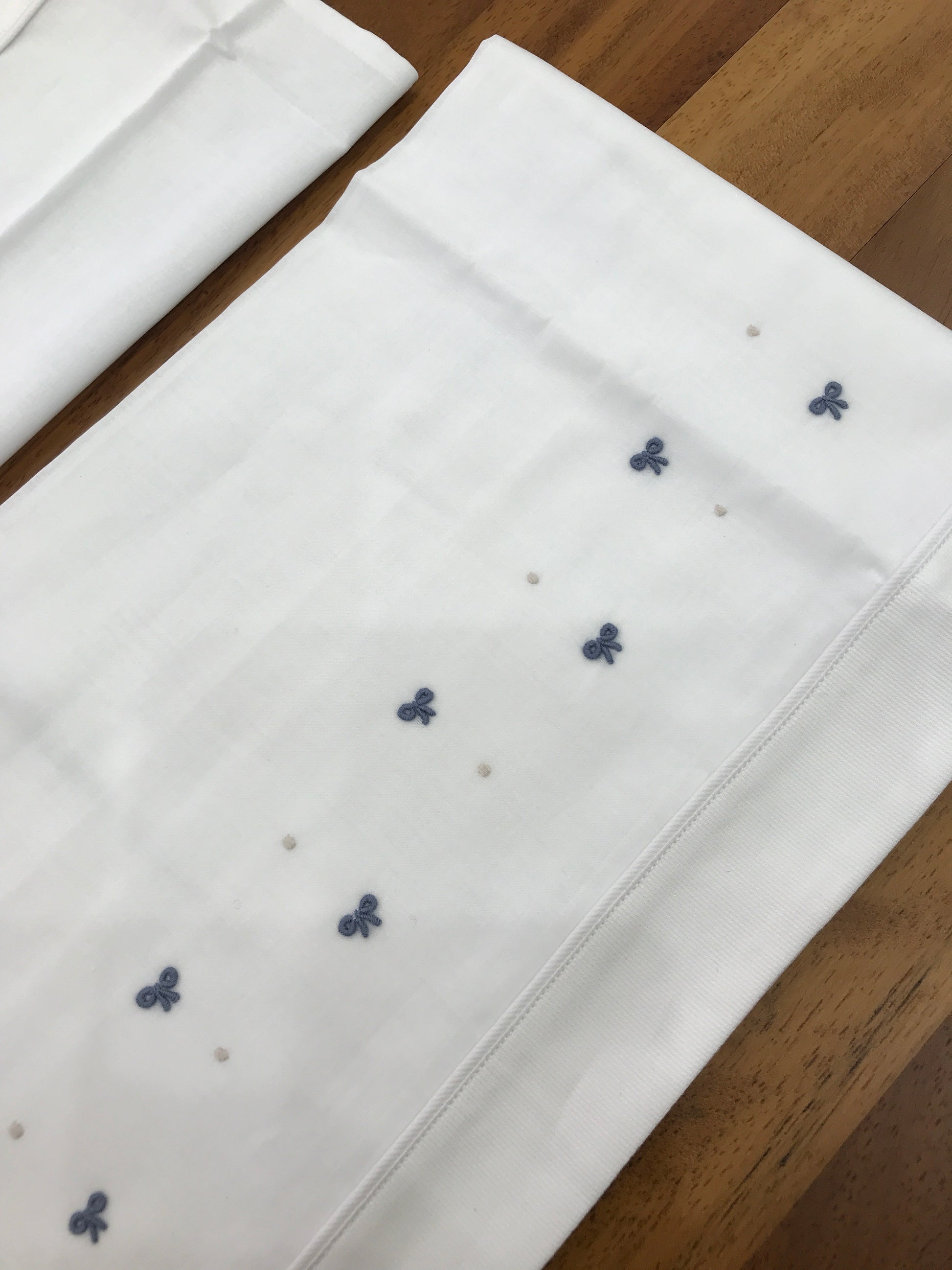 Lenzuola bianche decorate con pois bianchi ricamati e fiocchetti blu ricamati, con federa coordinata dallo stesso motivo.