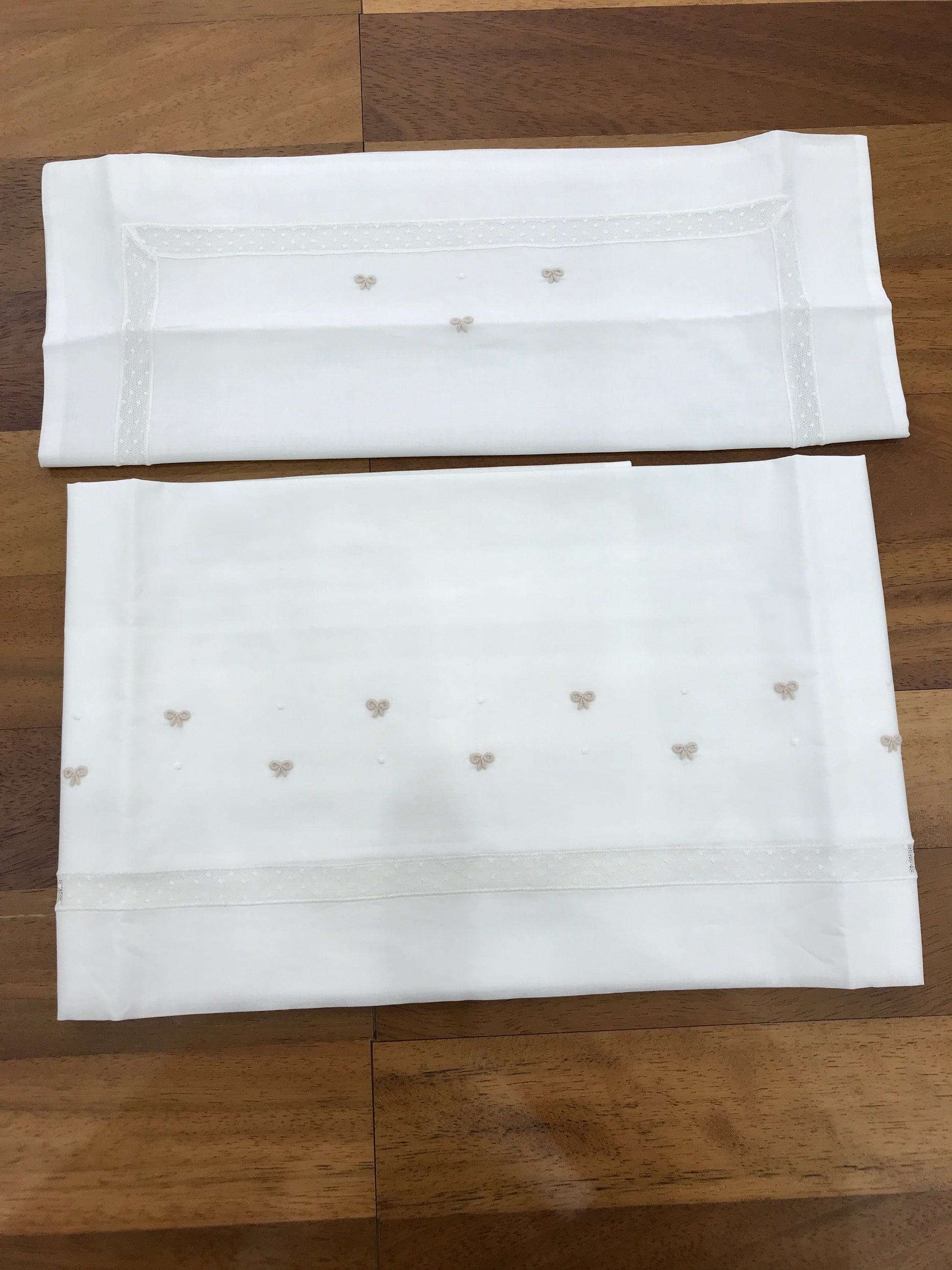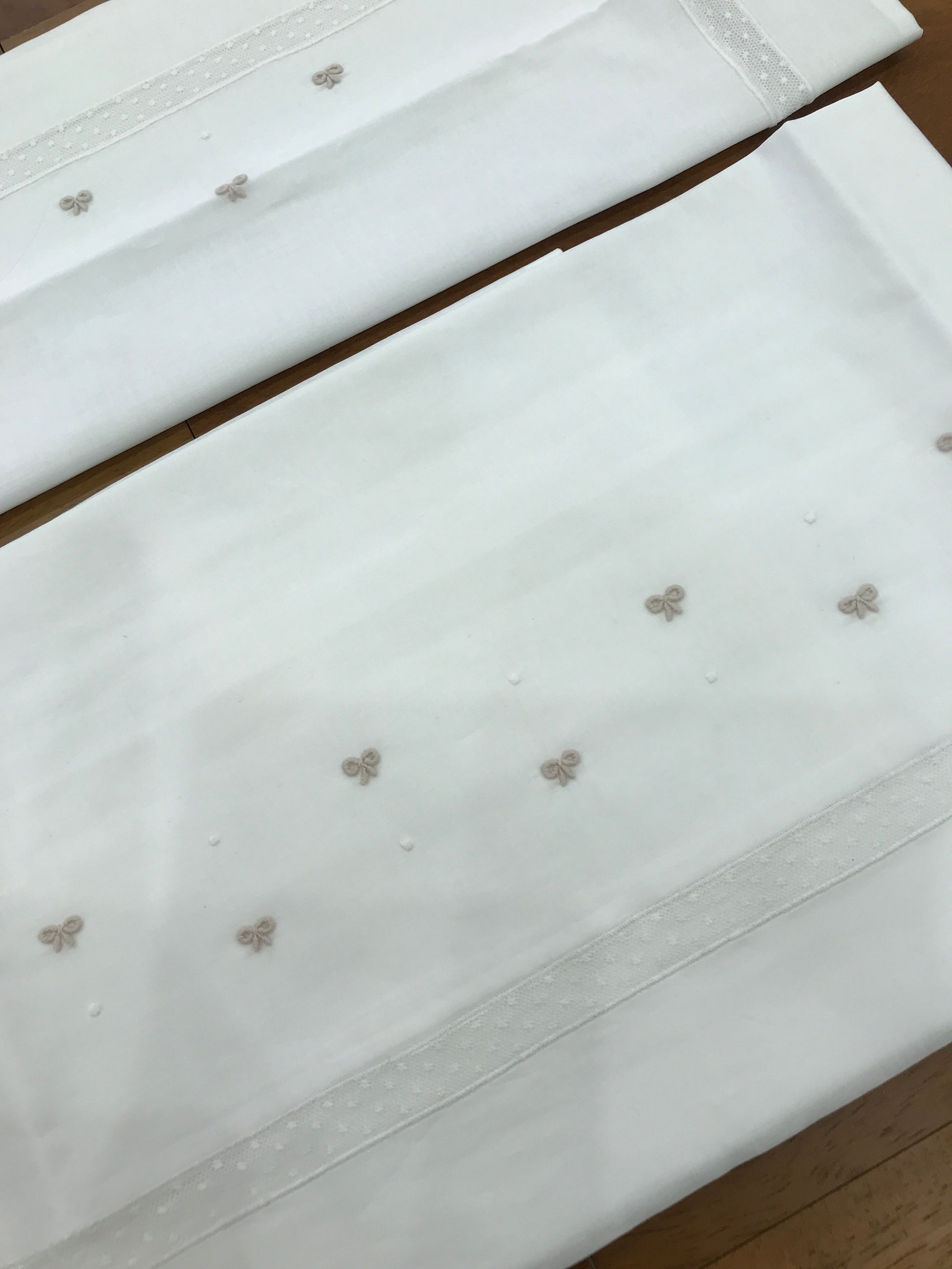 Lenzuola bianche arricchite da un delicato merletto ricamato, con fiocchetti beige e pois ricamati; la federa del cuscino presenta la medesima raffinata decorazione.