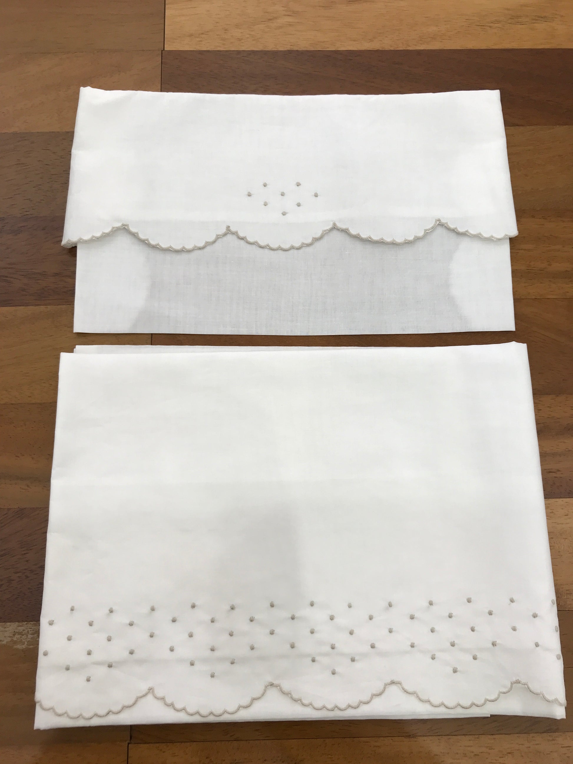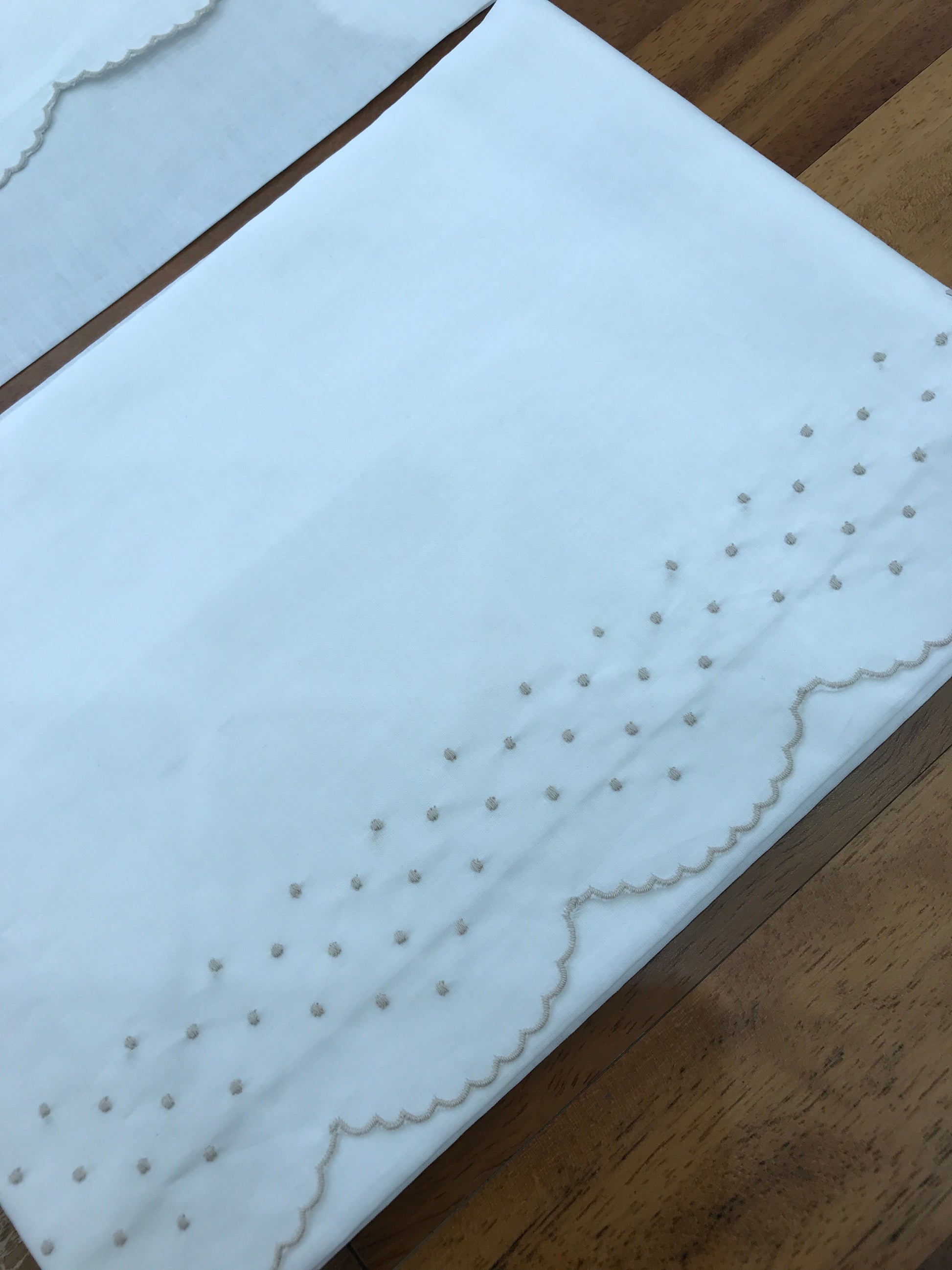 Lenzuola bianche con bordo smerlato beige, arricchite da pois beige ricamati come dettaglio decorativo; la stessa lavorazione è presente anche sulla federa del cuscino.