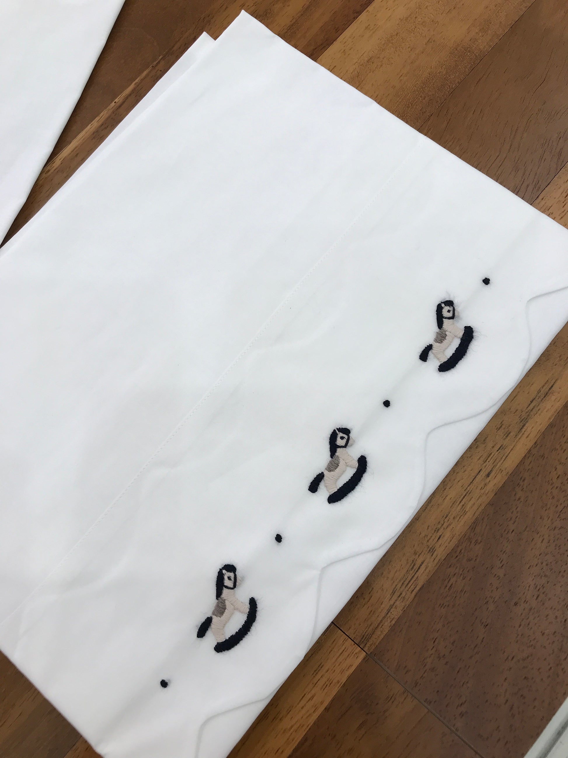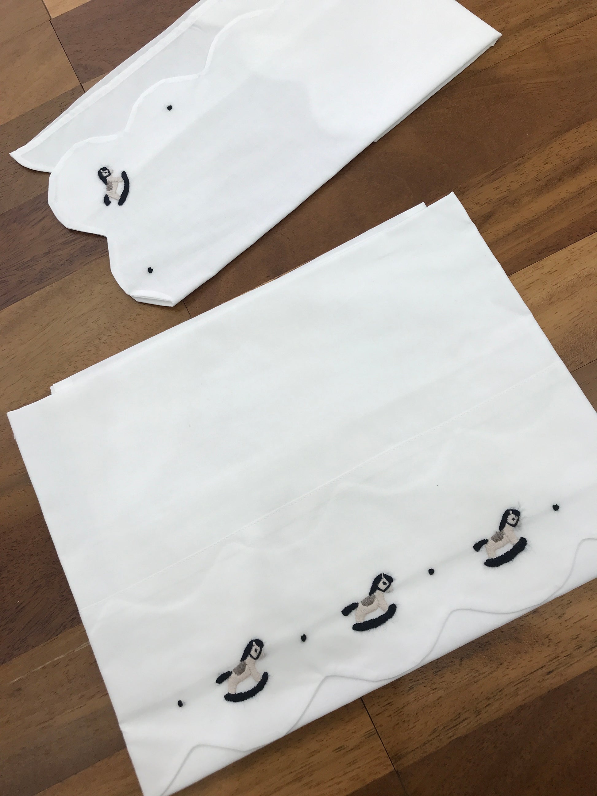 Lenzuola bianche con bordo smerlato, decorate con eleganti cavalli blu scuro; anche la federa presenta un bordo smerlato e un motivo con cavallo blu.