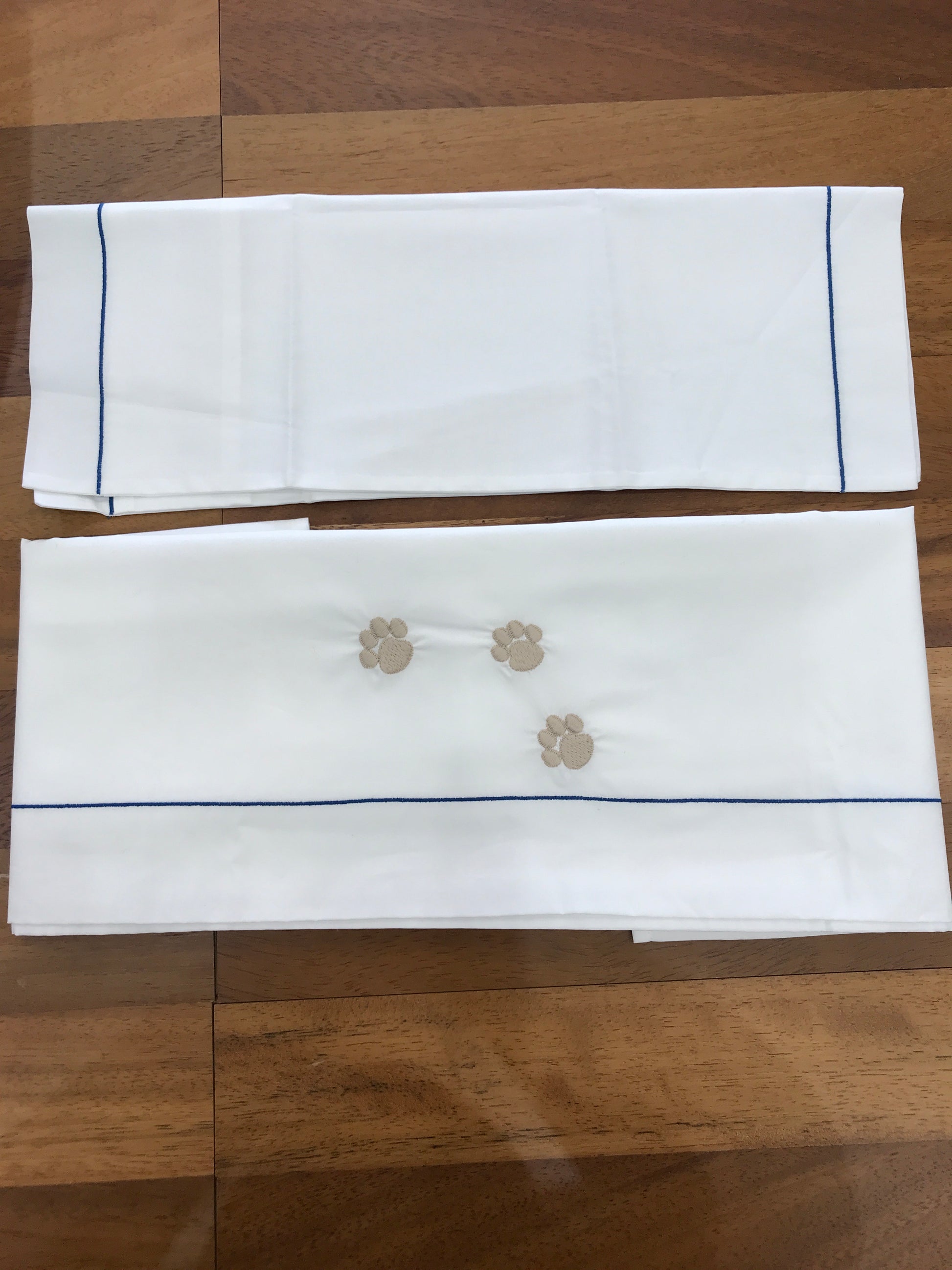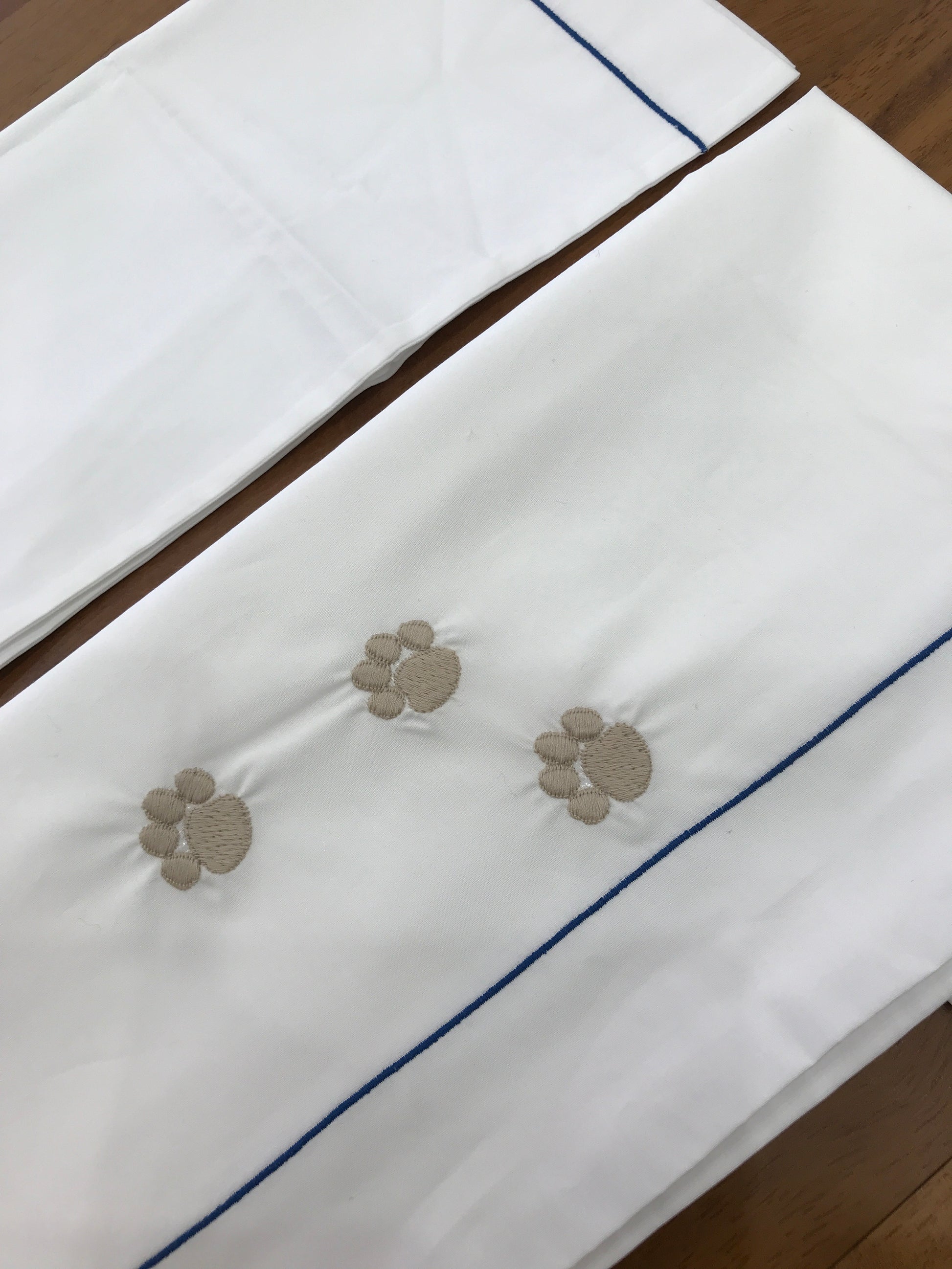 Lenzuola bianche con una linea blu essenziale e una decorazione di zampine color tortora, mentre la federa del cuscino è decorata esclusivamente con sottili linee blu.