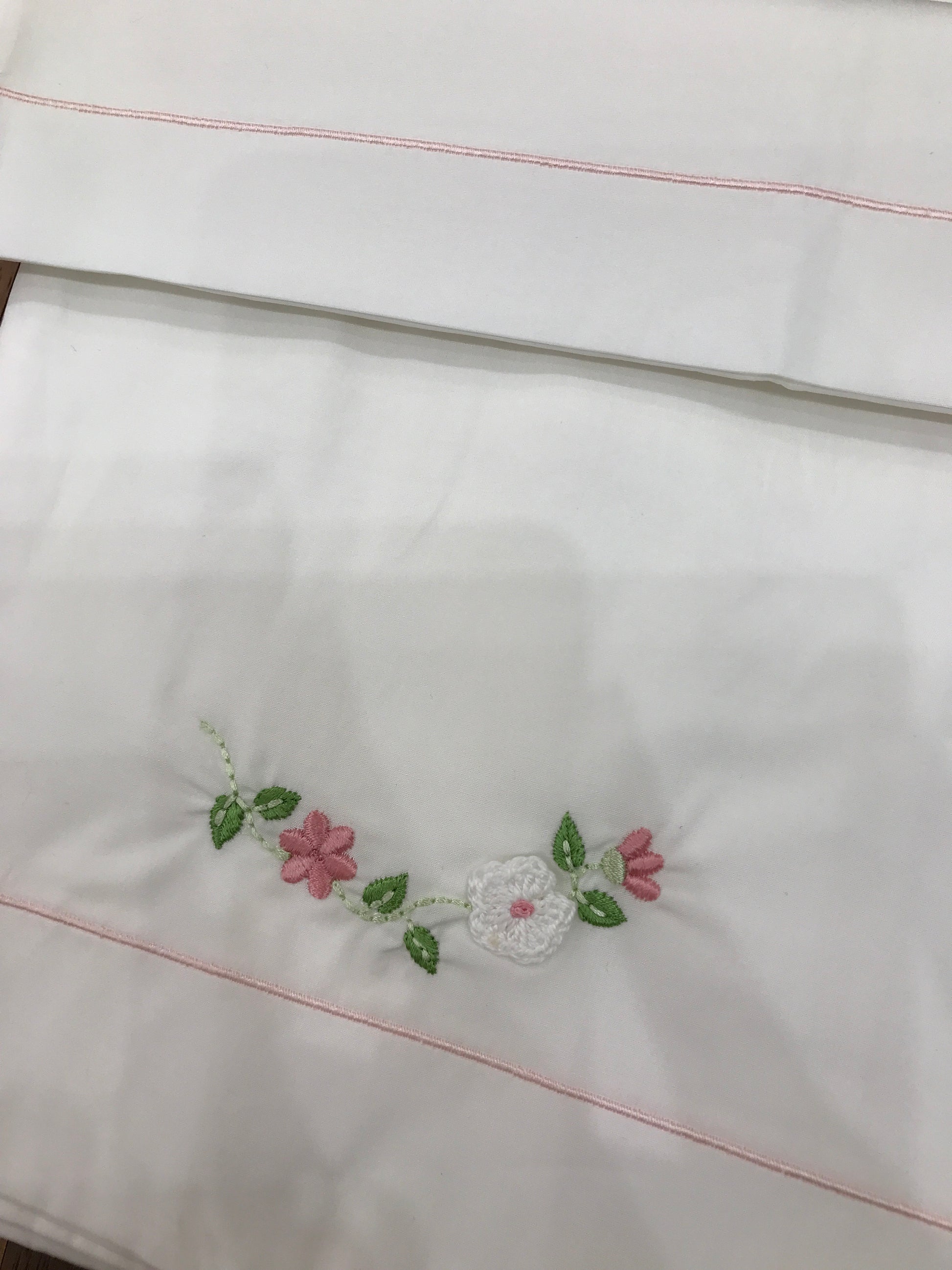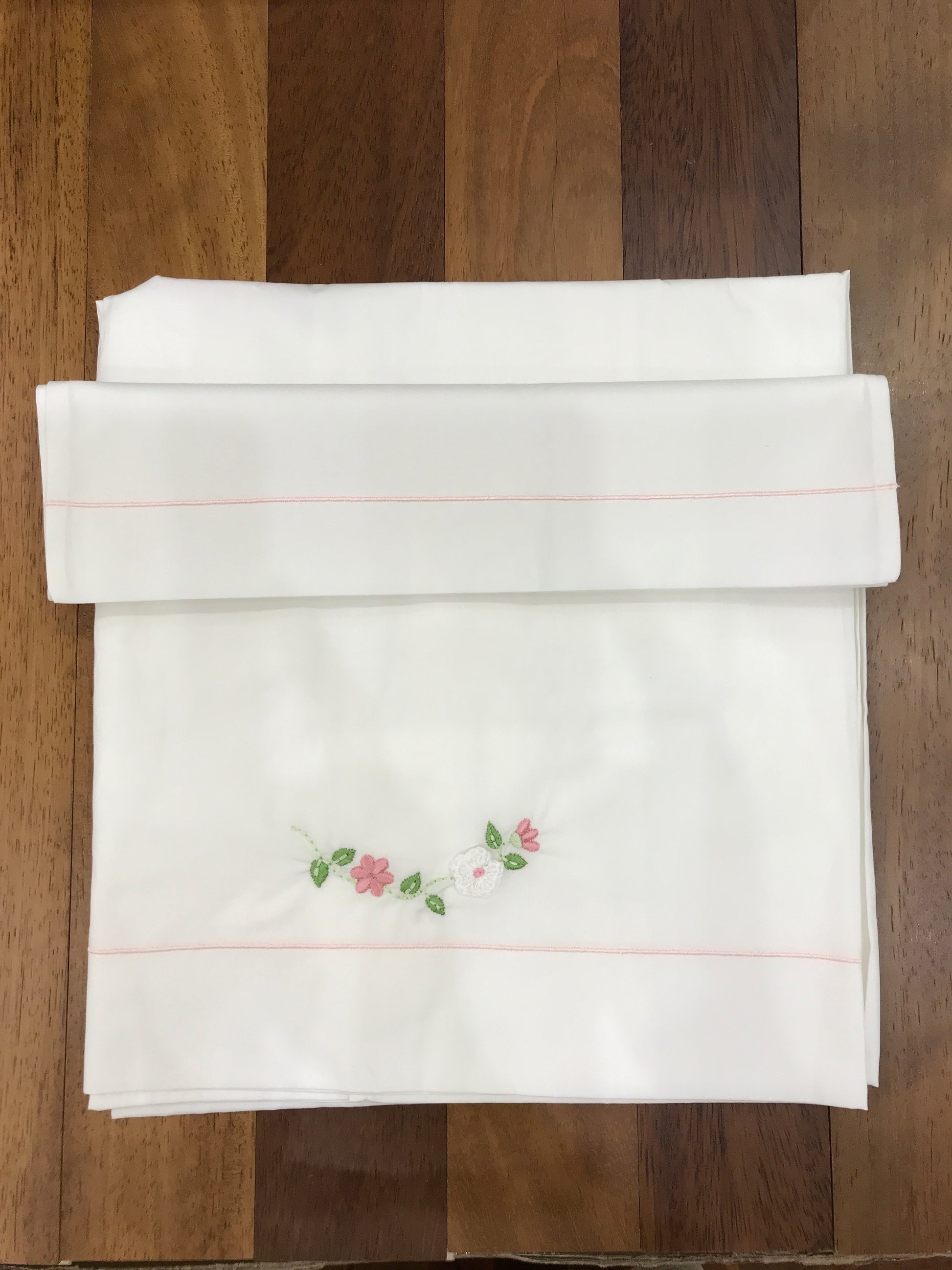 Lenzuolino in puro cotone bianco arricchito da un delicato ricamo centrale che decora il fronte con motivi floreali: fiori bianchi e rosa circondati da foglie verdi, completati da una sottile linea rosa. La federa coordina perfettamente con lo stesso ricamo rosa, creando un insieme elegante e raffinato per la cameretta.