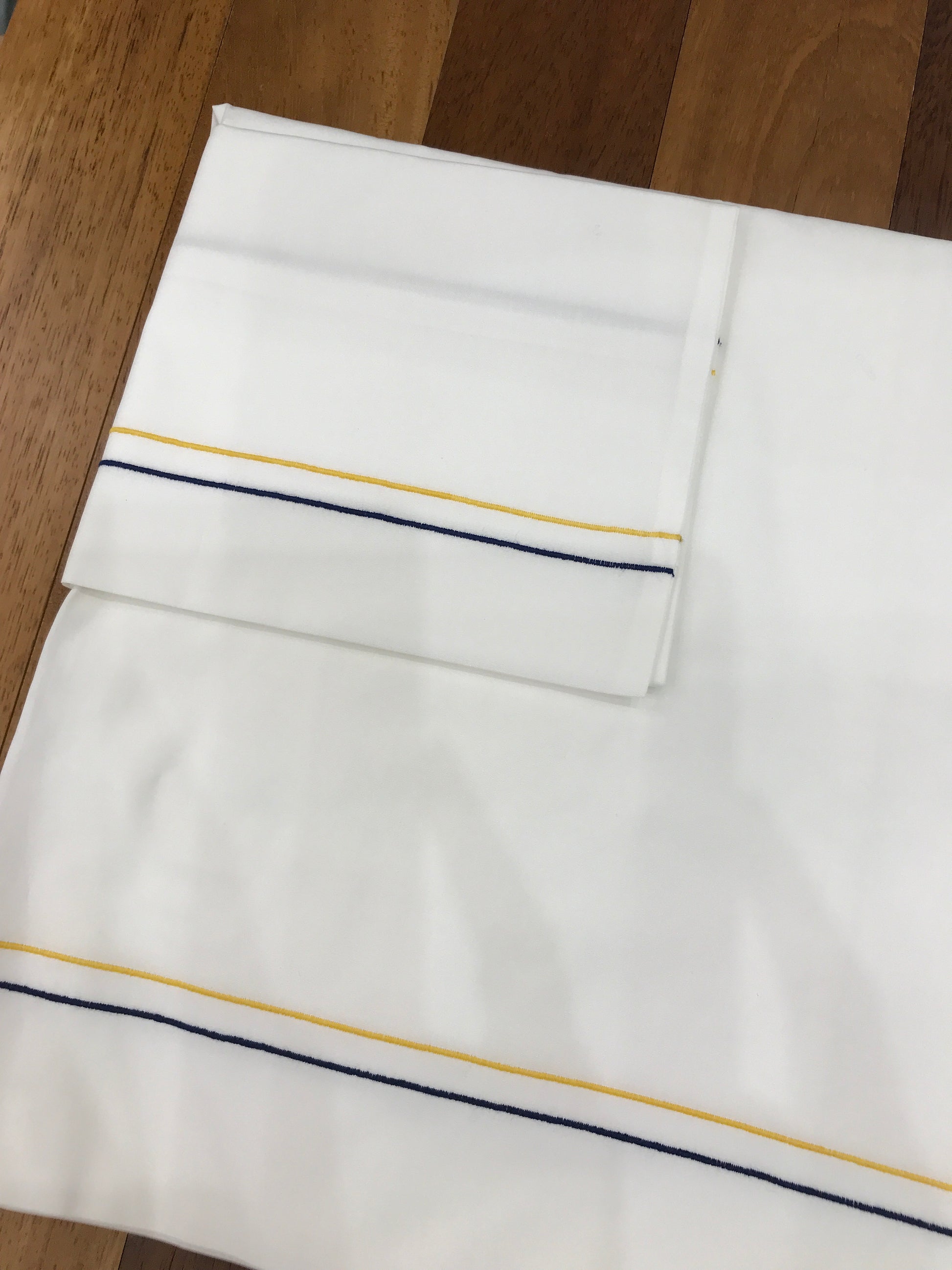 Delicato lenzuolino in cotone puro di tonalità bianca, arricchito da raffinate linee ricamate in giallo e blu che decorano elegantemente sia il bordo del lenzuolo che della federa coordinata. Un dettaglio di pregio che conferisce carattere e raffinatezza alla biancheria da letto.