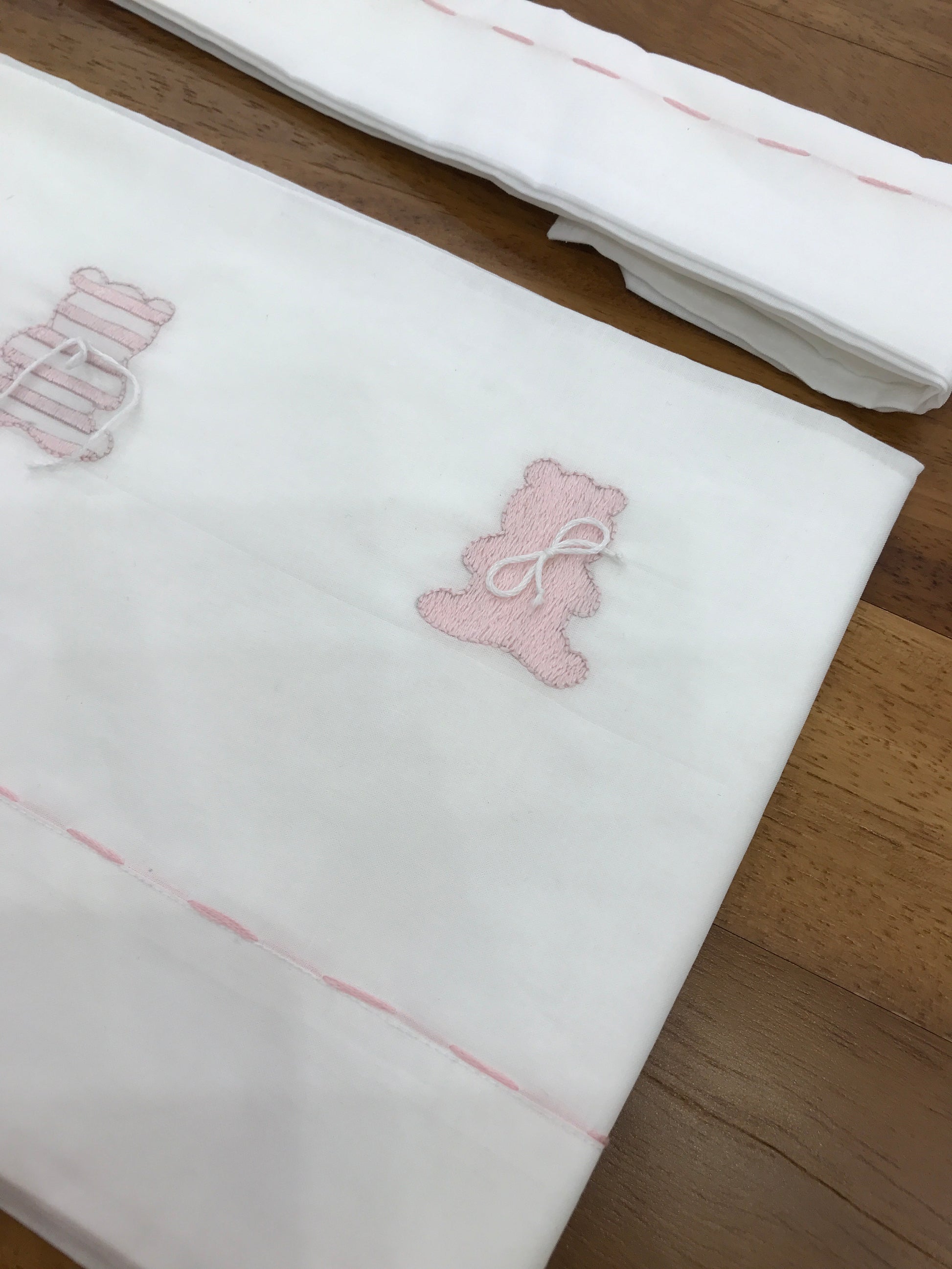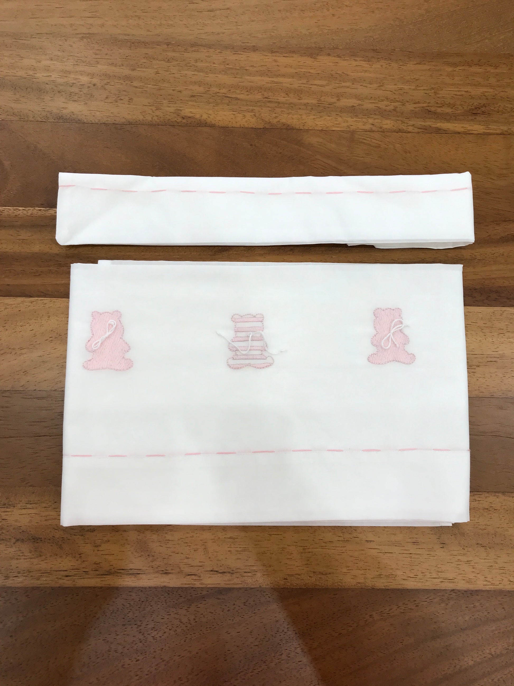 Lenzuola bianche caratterizzate da una delicata linea rosa ricamata sia sulla federa che sul lenzuolo, arricchite da orsetti ricamati in rosa per un tocco raffinato e distintivo.