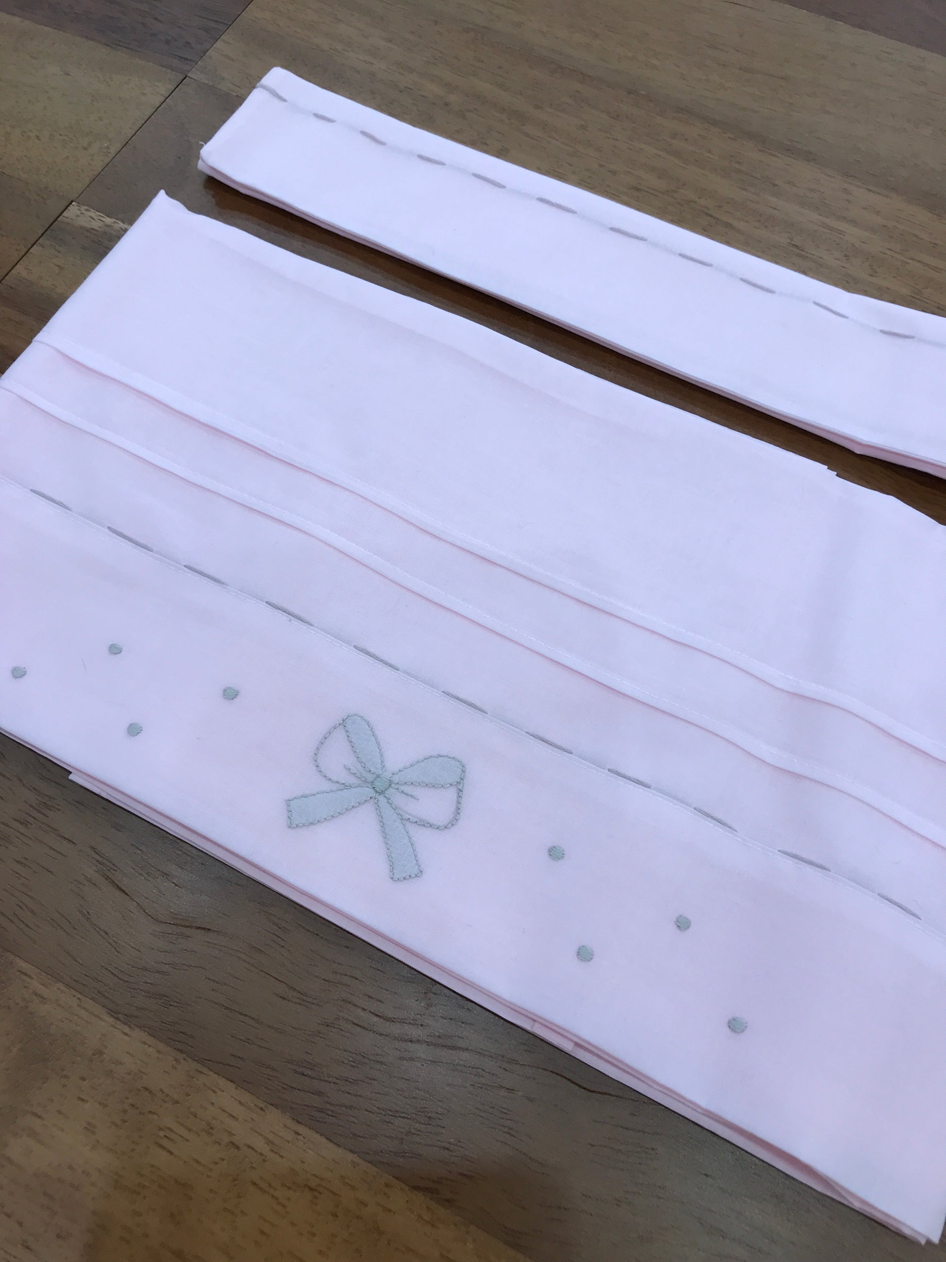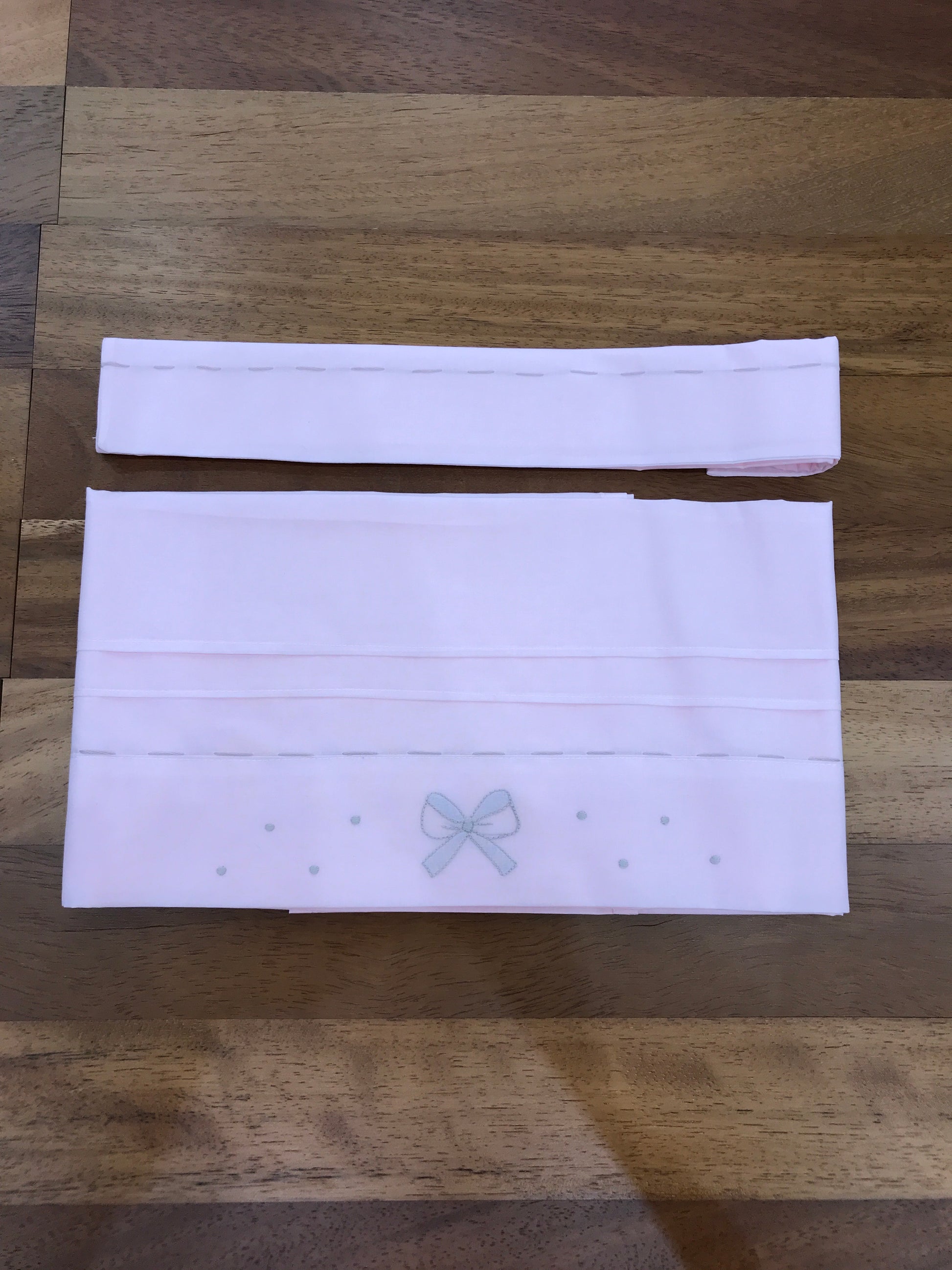 Lenzuolino rosa decorato con ricami beige, caratterizzato da pois e un delicato fiocco. La linea beige ricamata è molto sottile, così come la federa, che presenta anch’essa un raffinato ricamo beige.