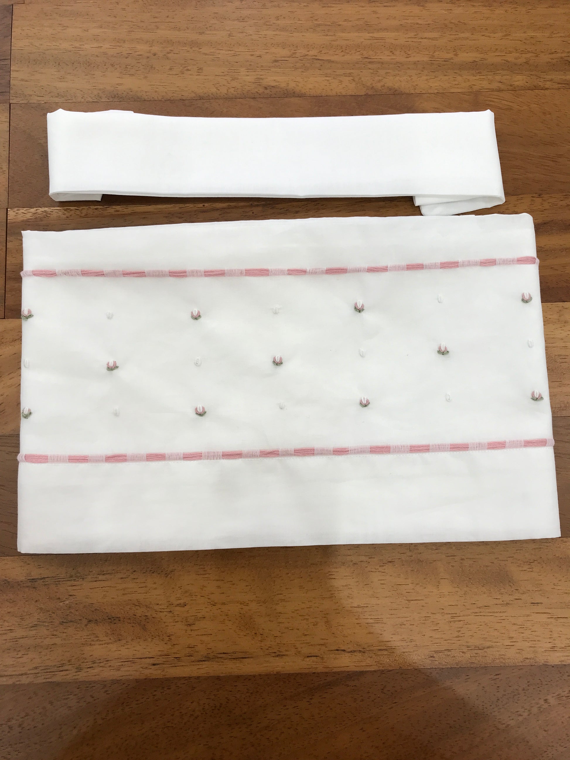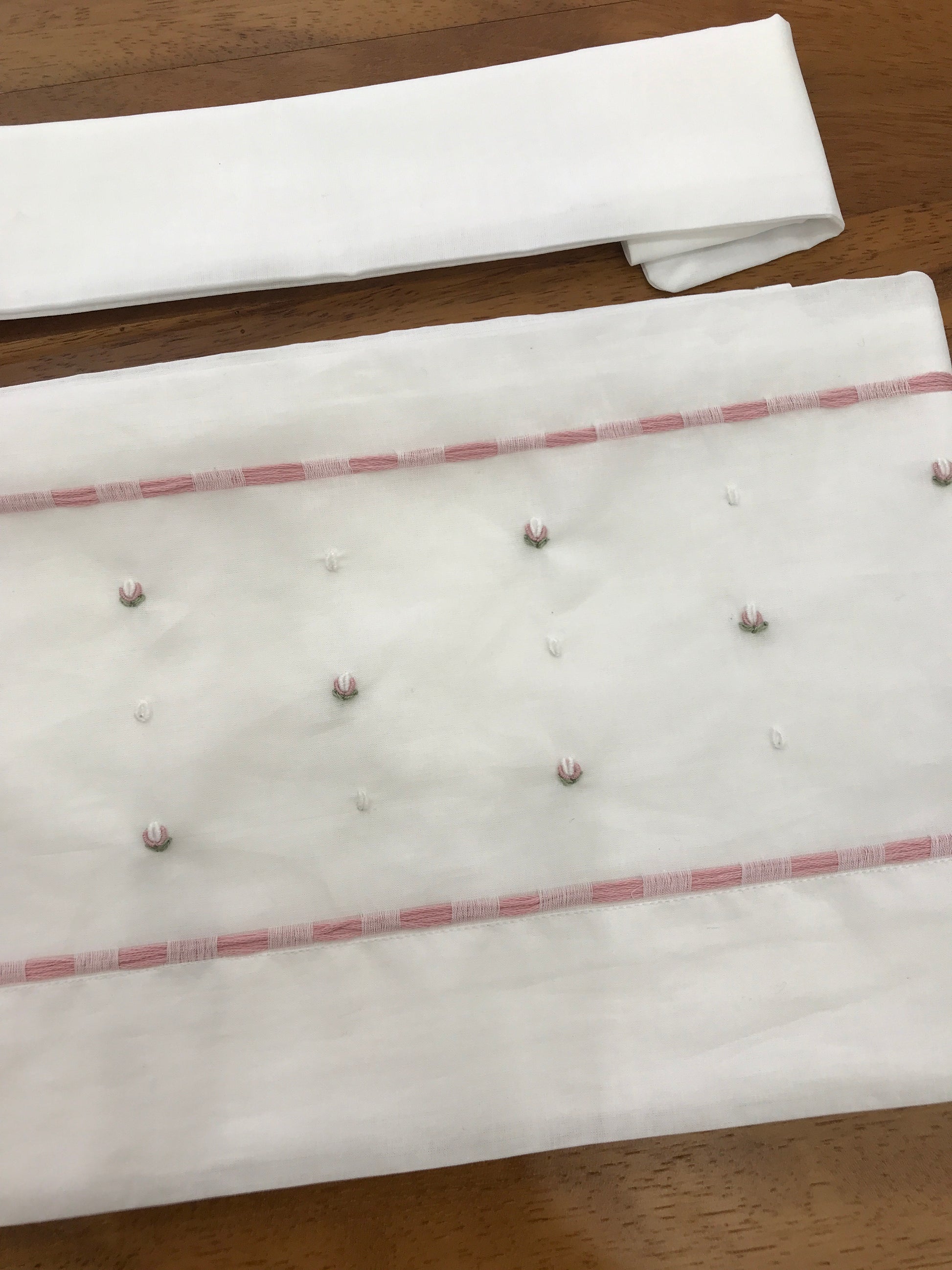 Lenzuola bianche decorate con sottili linee rosa e un motivo centrale di roselline ricamate.
