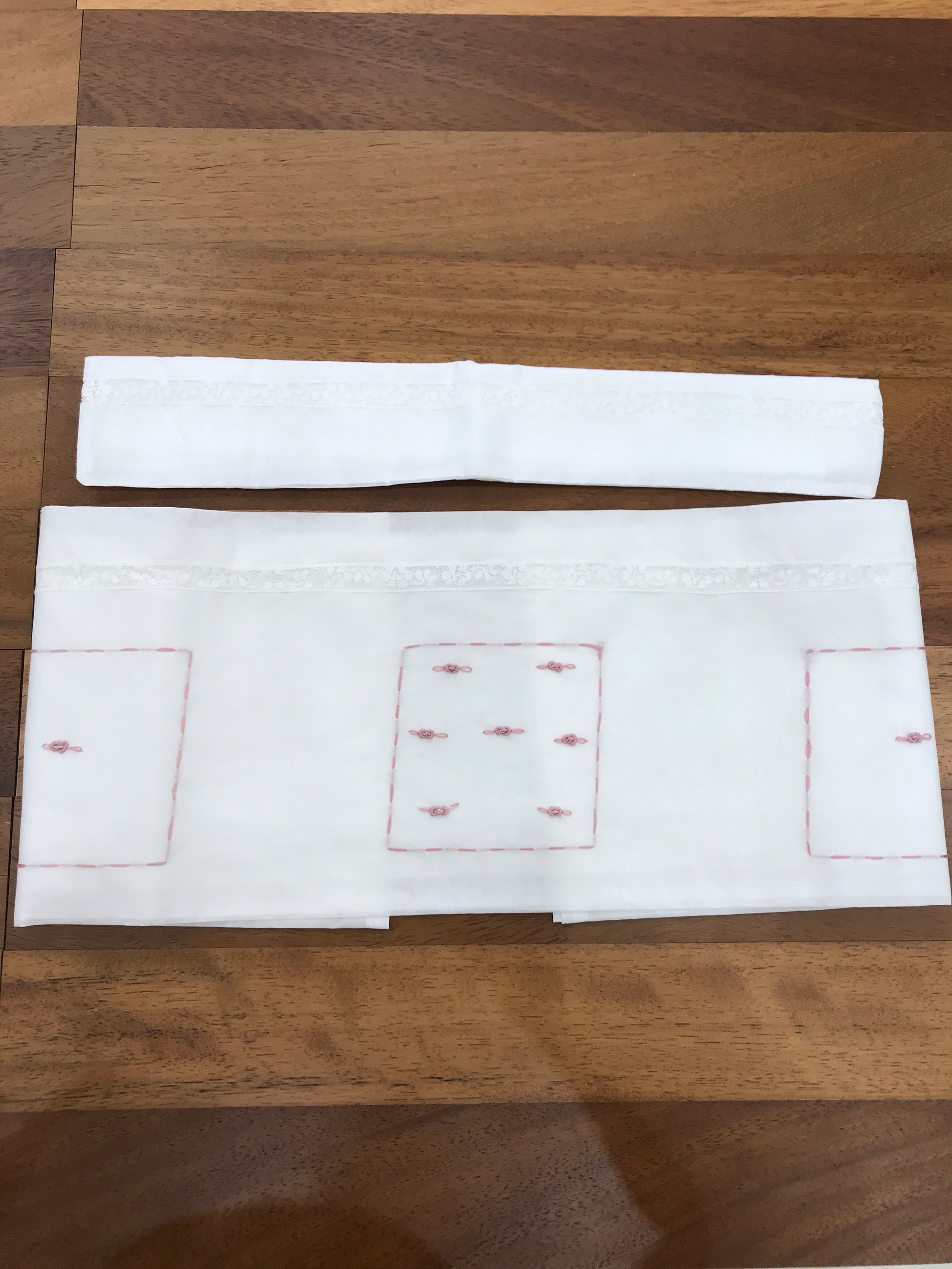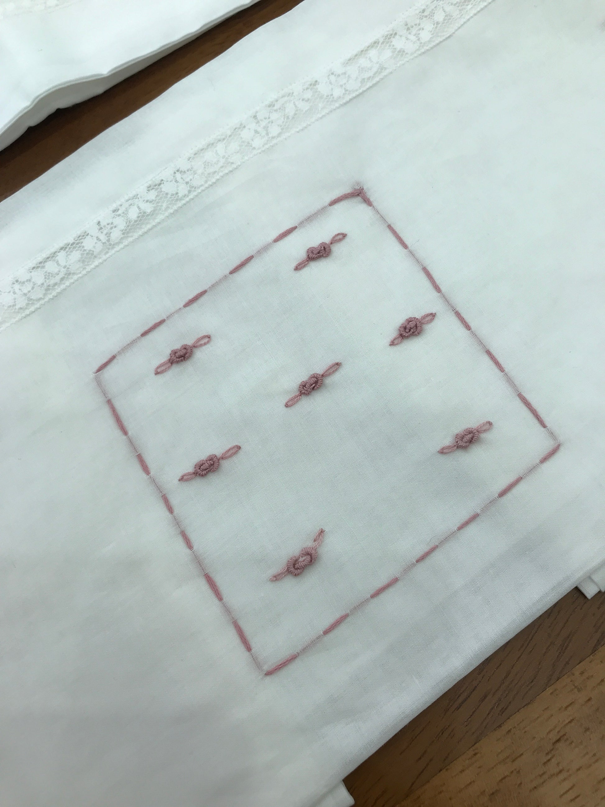 Lenzuolino bianco decorato con motivi a quadretti e delicati ricami di roselline.