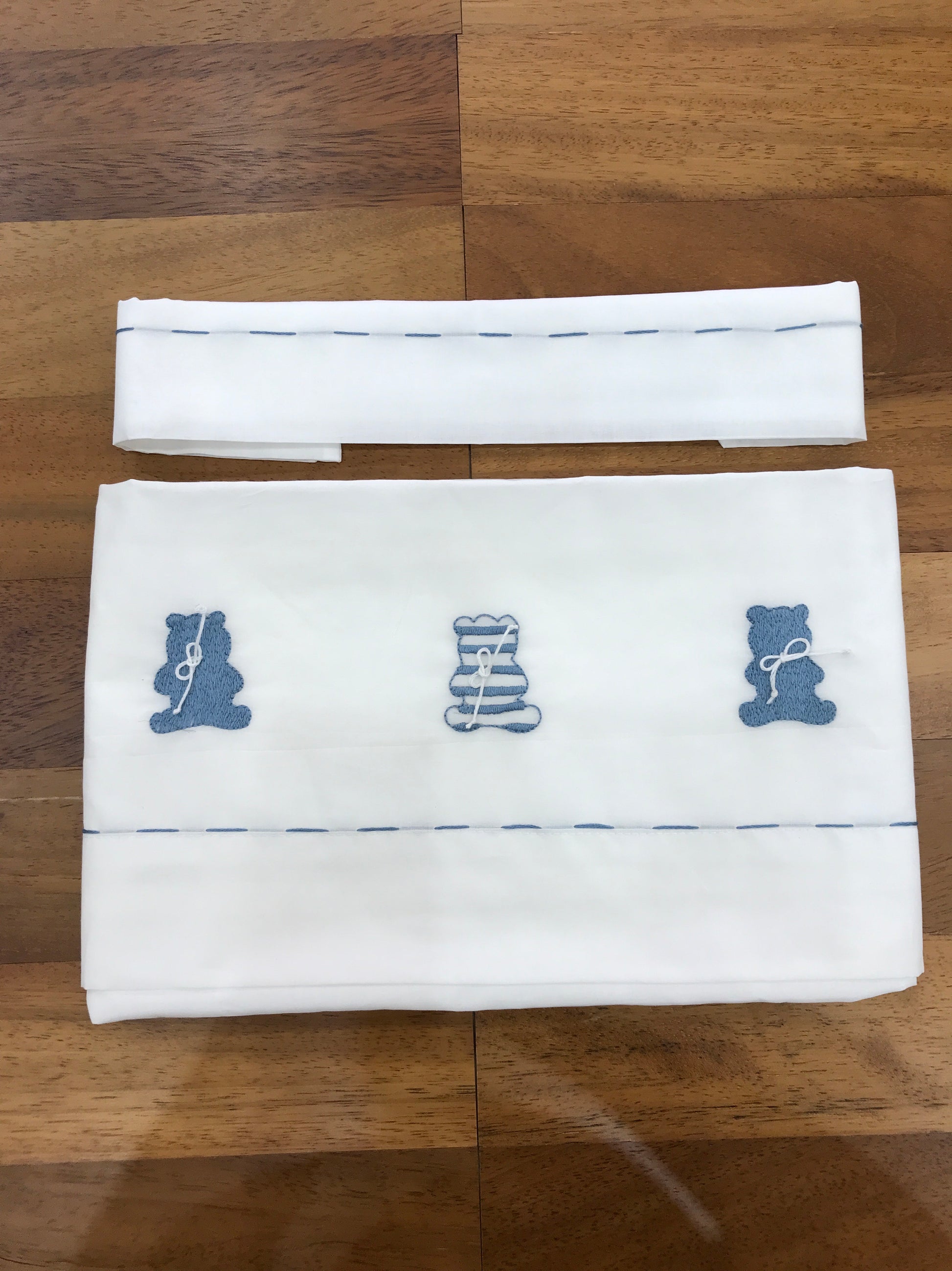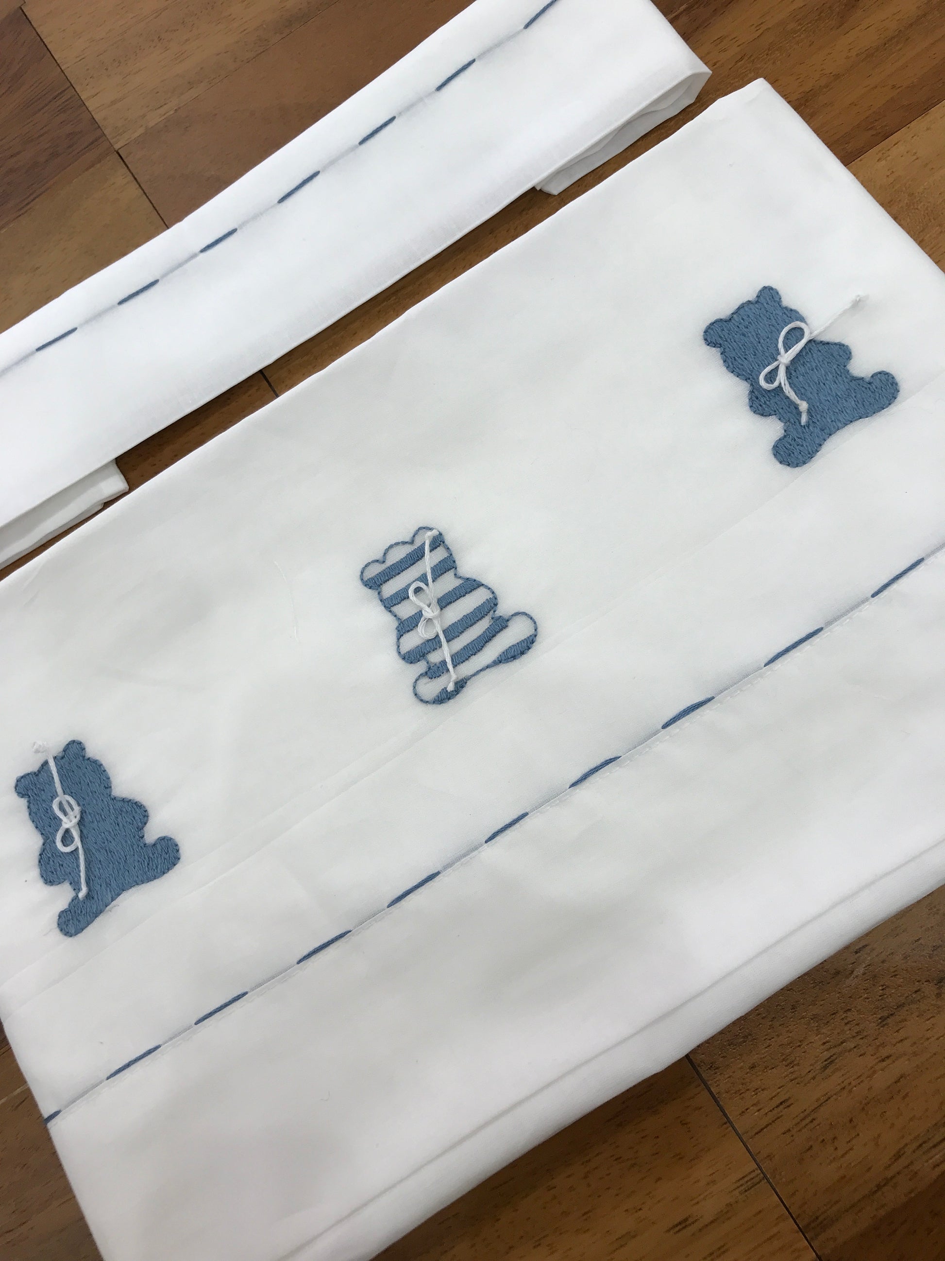 Lenzuolo bianco con una sottile striscia blu ricamata e orsetti ricamati in blu. La federa è decorata con una linea sottile blu ricamata, che completa elegantemente il set.