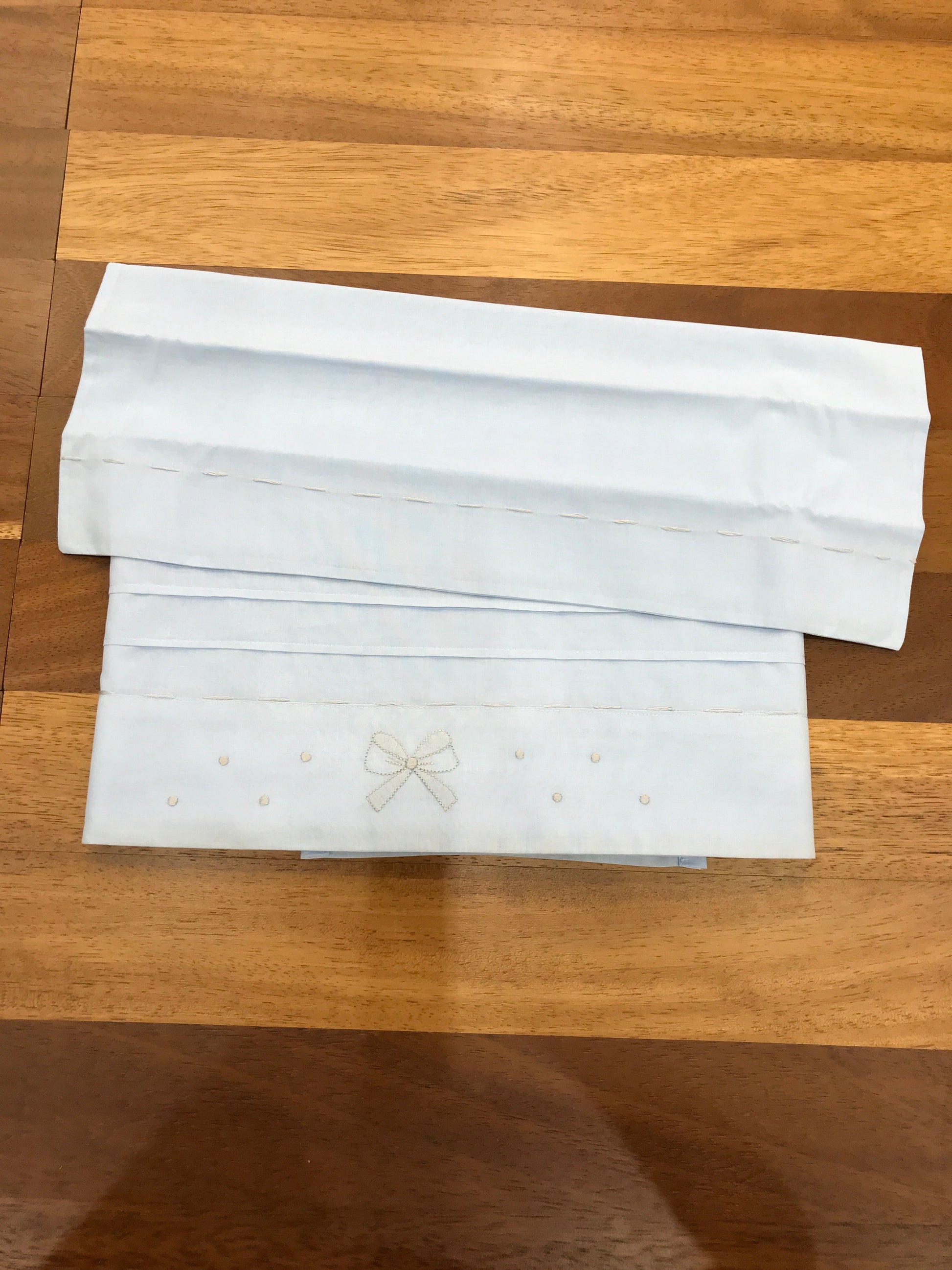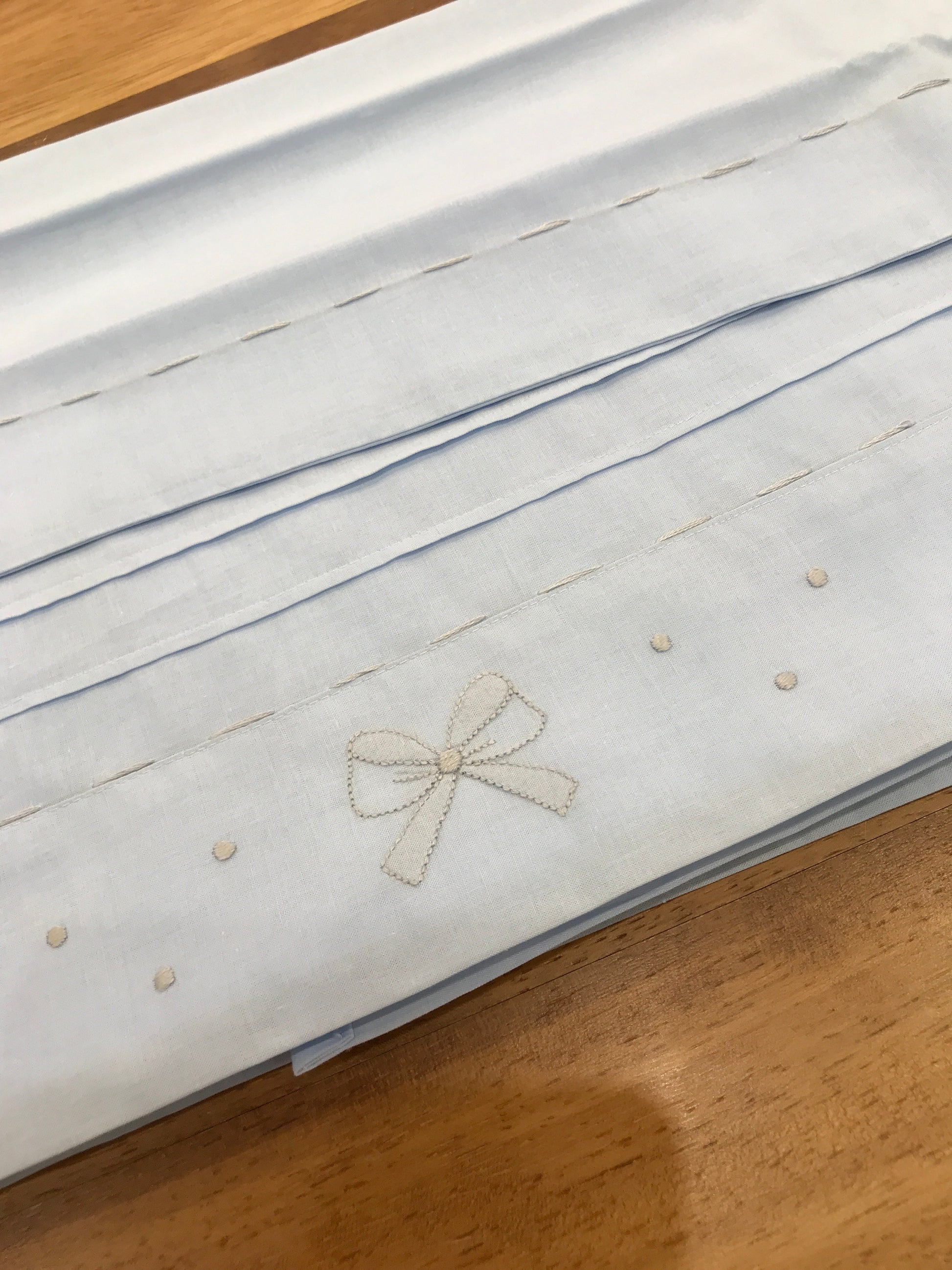 Lenzuolino in cotone azzurro, decorato con ricami grigi, presenta un fiocco ricamato e motivi a pois sul davanti. La federa abbinata è celeste con dettagli ricamati in grigio.