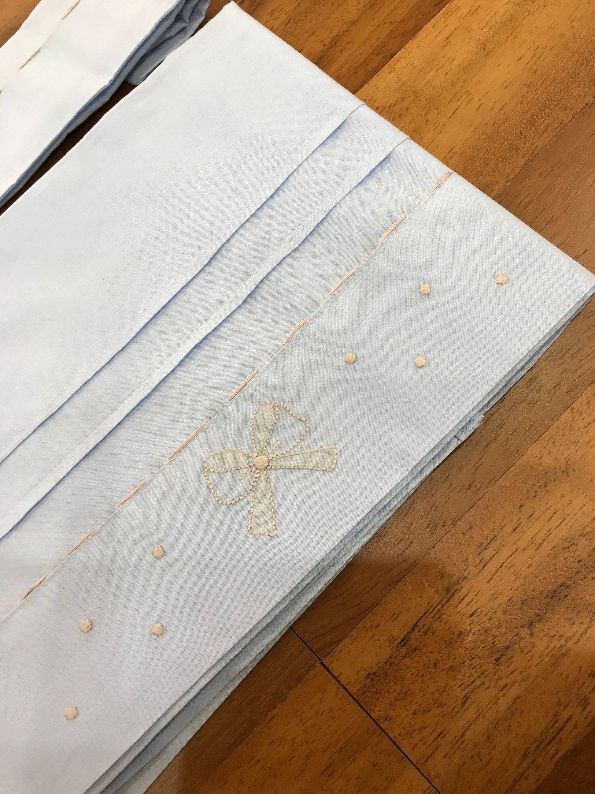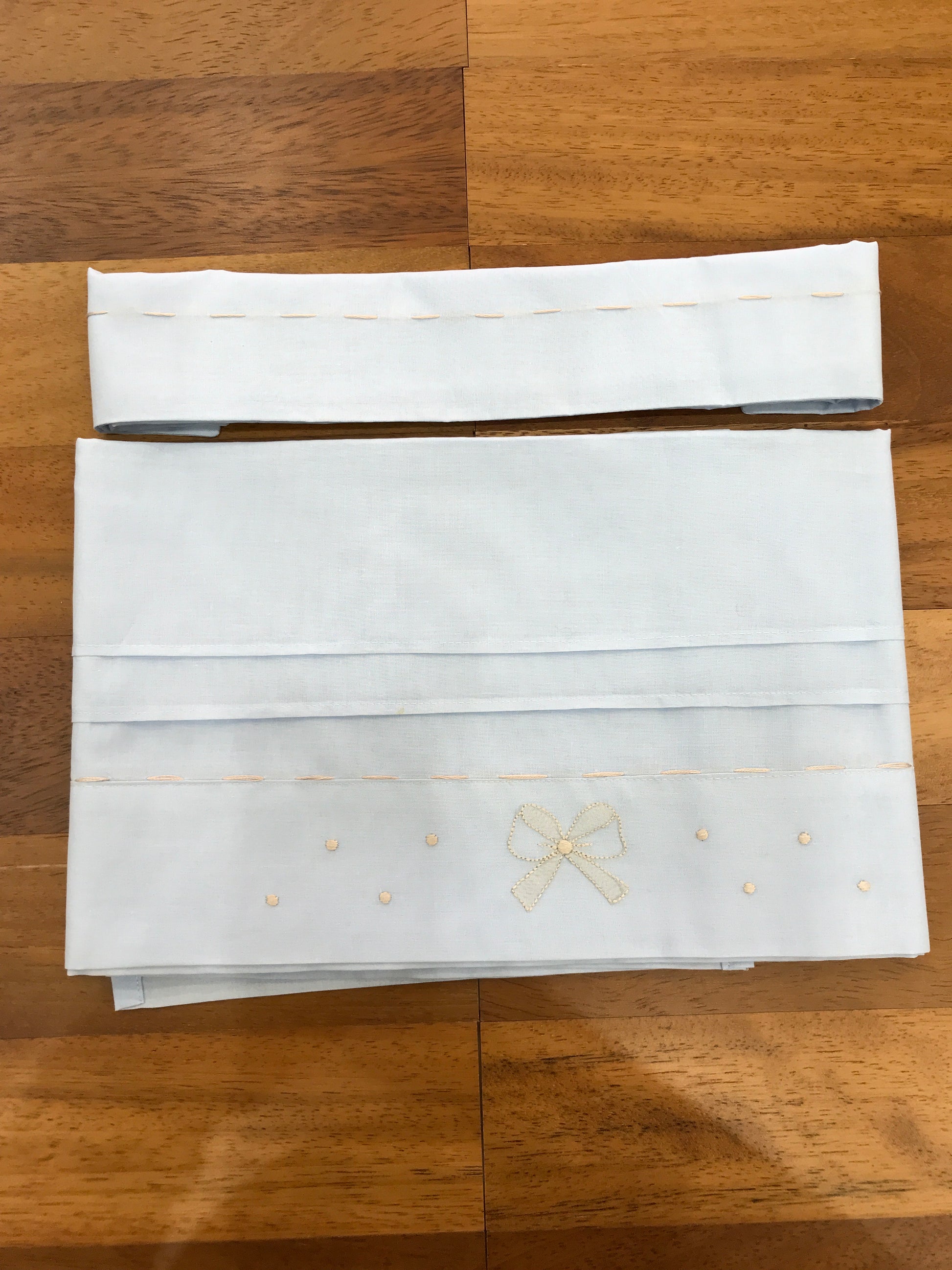Lenzuolino celeste decorato con ricami beige, caratterizzato da pois e un delicato fiocco. La linea beige ricamata è molto sottile, così come la federa, che presenta anch’essa un raffinato ricamo beige.