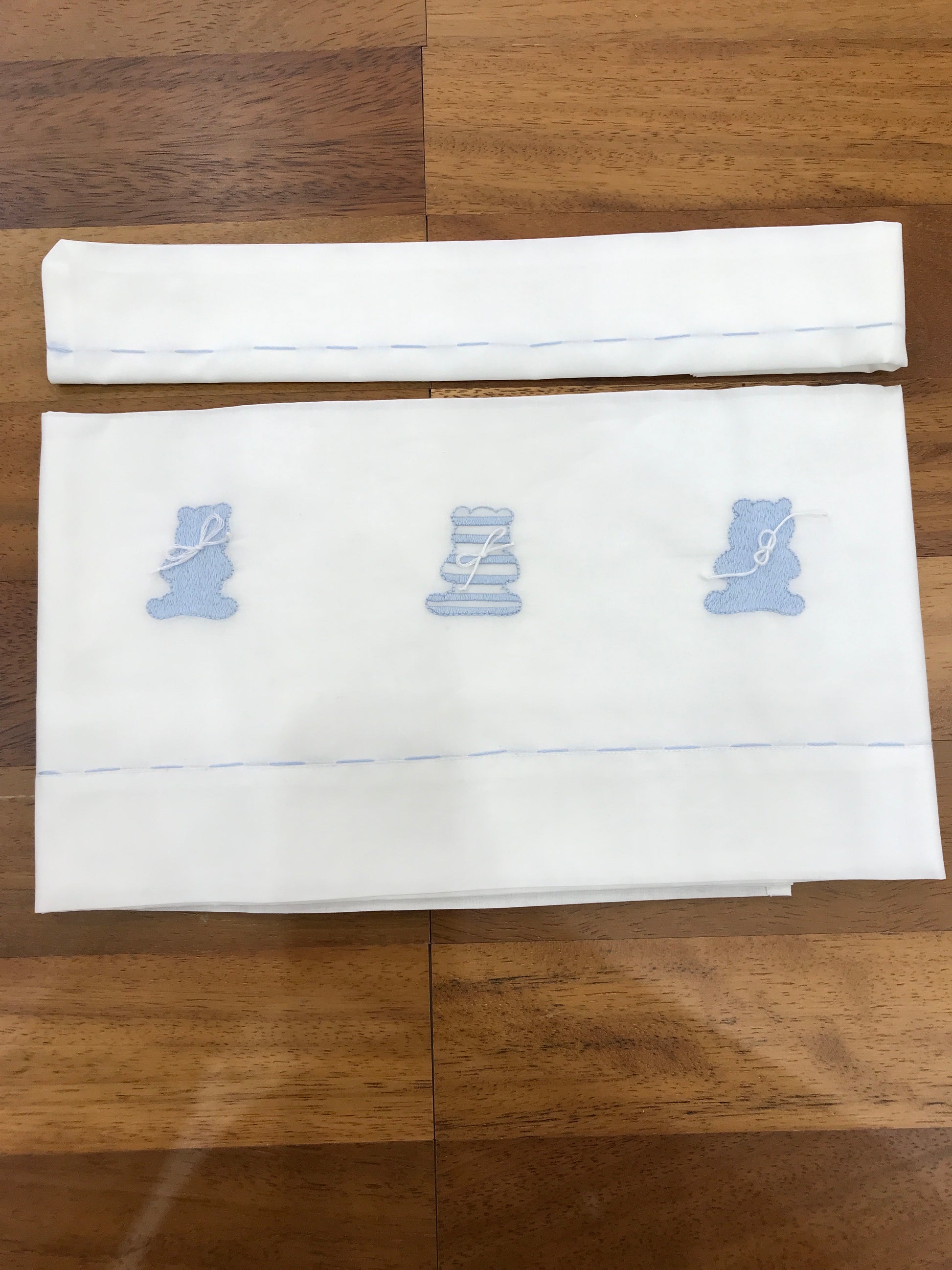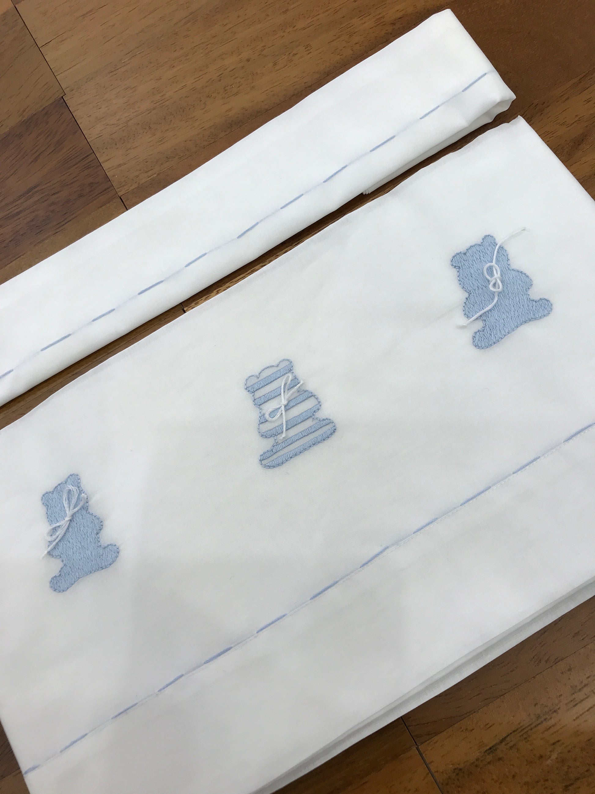 Lenzuola bianche caratterizzate da una delicata linea celeste ricamata sia sulla federa che sul lenzuolo, arricchite da orsetti ricamati in celeste per un tocco raffinato e distintivo.