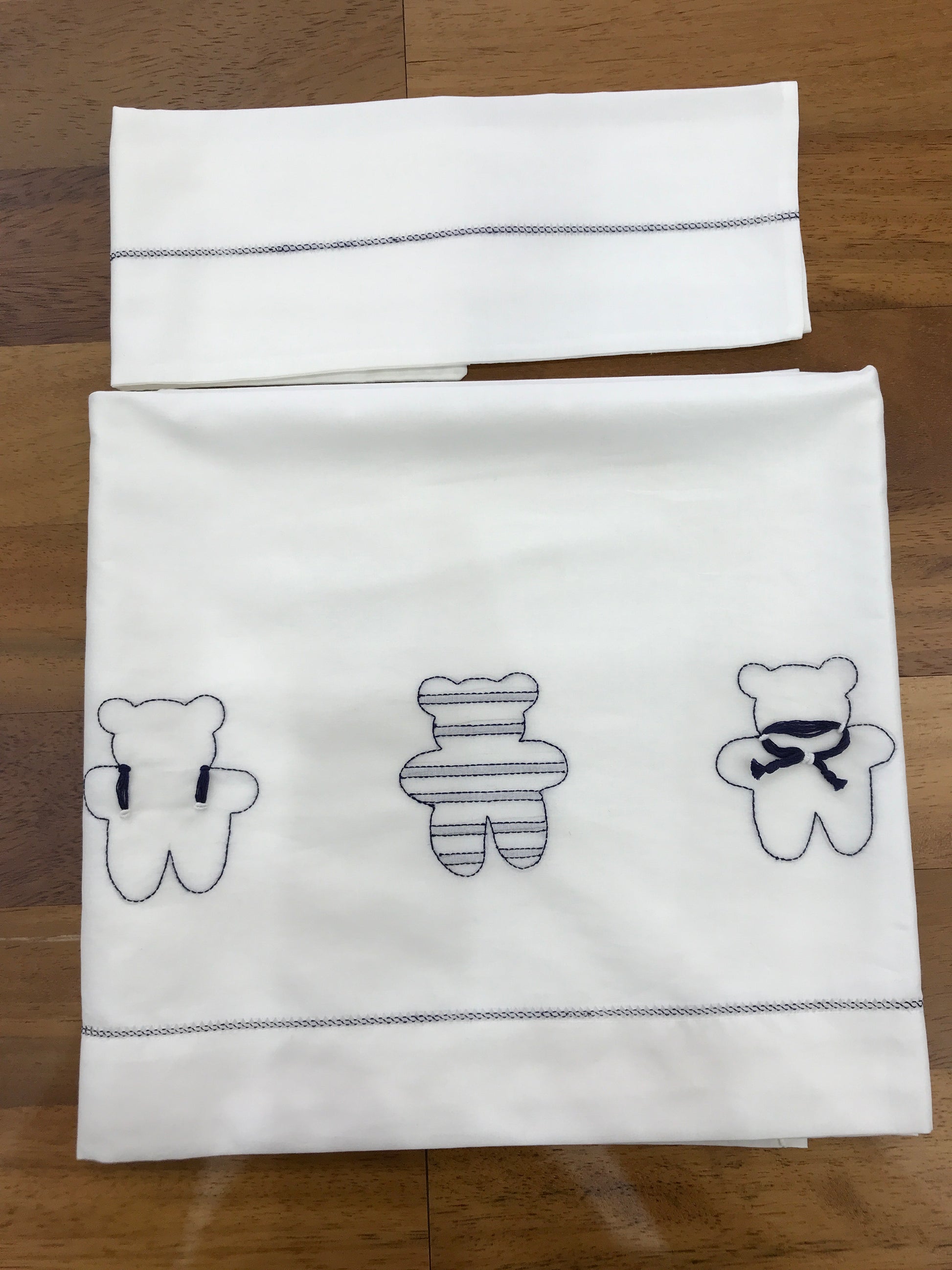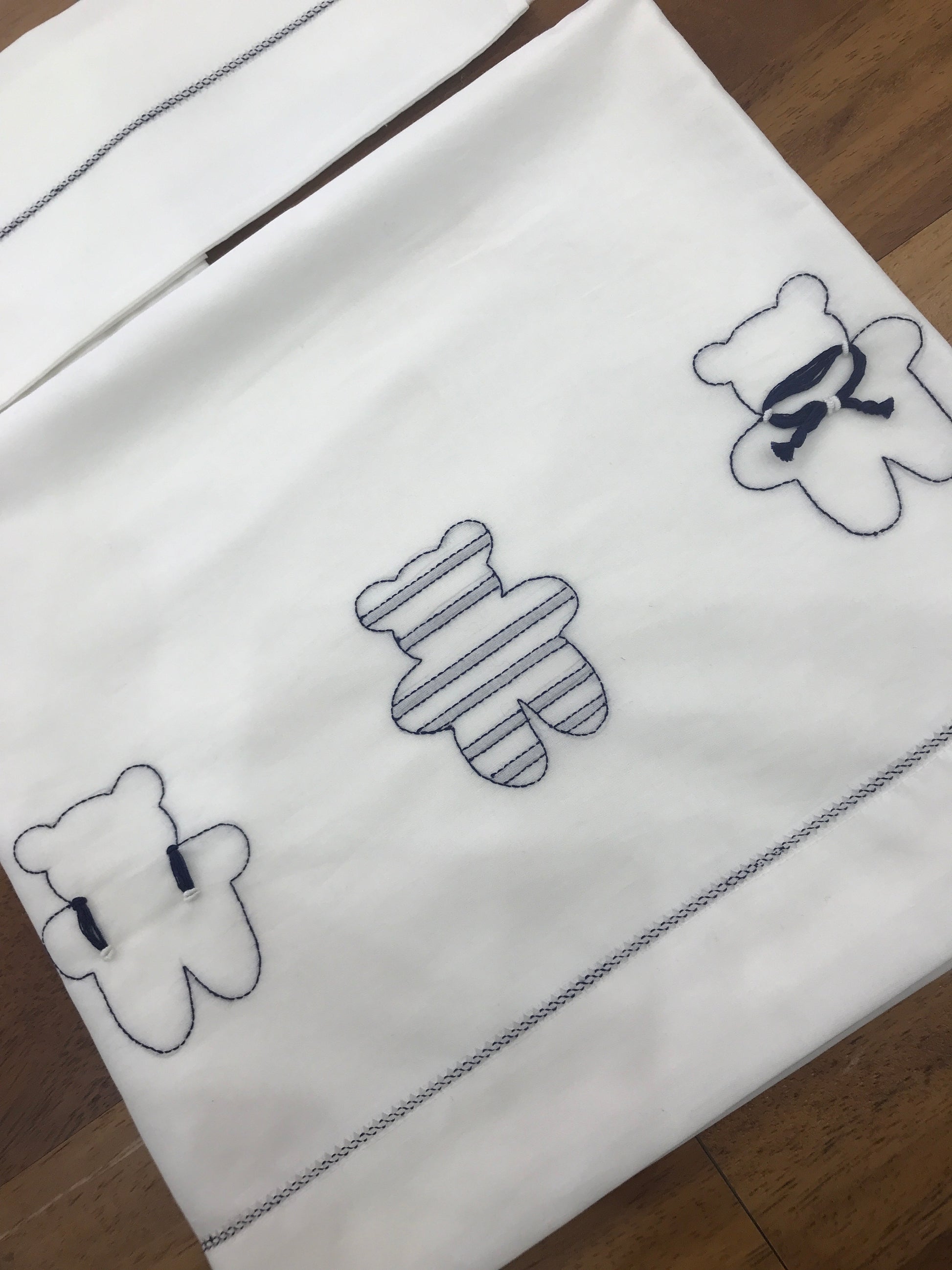 Set di lenzuola bianche caratterizzato da un ricamo delicato in blu scuro sulla federa e sul lenzuolo, arricchito da tre orsetti ricamati nello stesso colore. Un design sobrio e raffinato, ideale per un tocco di eleganza discreta nella biancheria da letto.