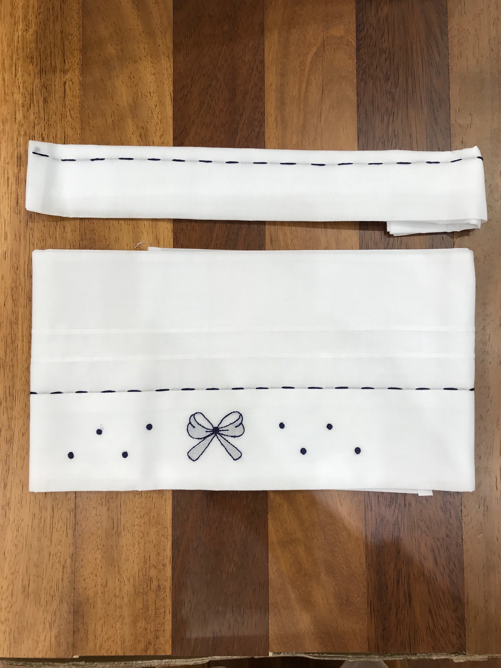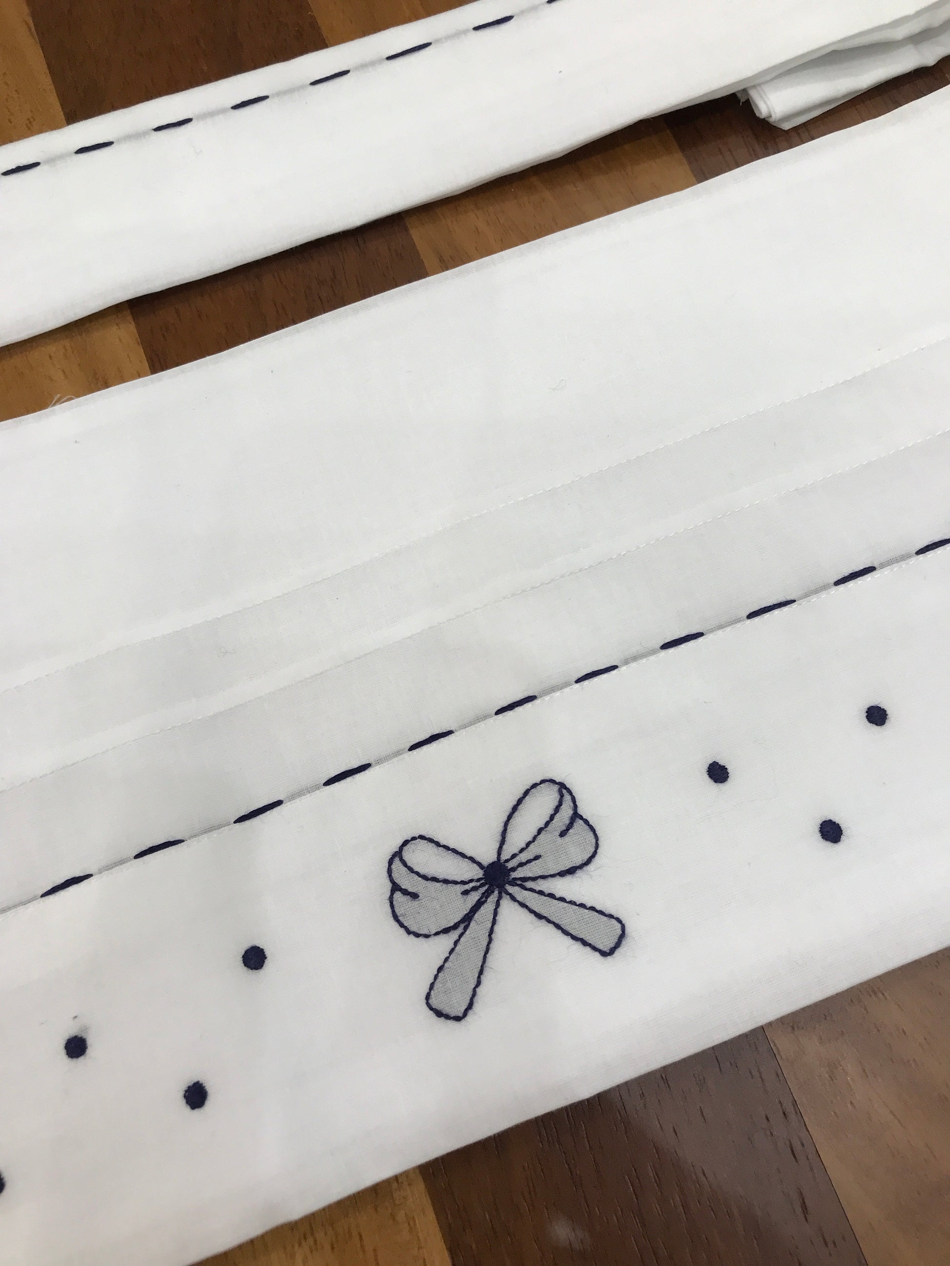Delicato lenzuolino in puro cotone bianco, arricchito da dettagli ricamati in blu che conferiscono eleganza e personalità. La federa presenta un raffinato fiocco ricamato e un motivo a pois coordinato, mentre i ricami blu sulla federa completano una composizione armoniosa. Ideale per creare un ambiente sereno e sofisticato nella cameretta.