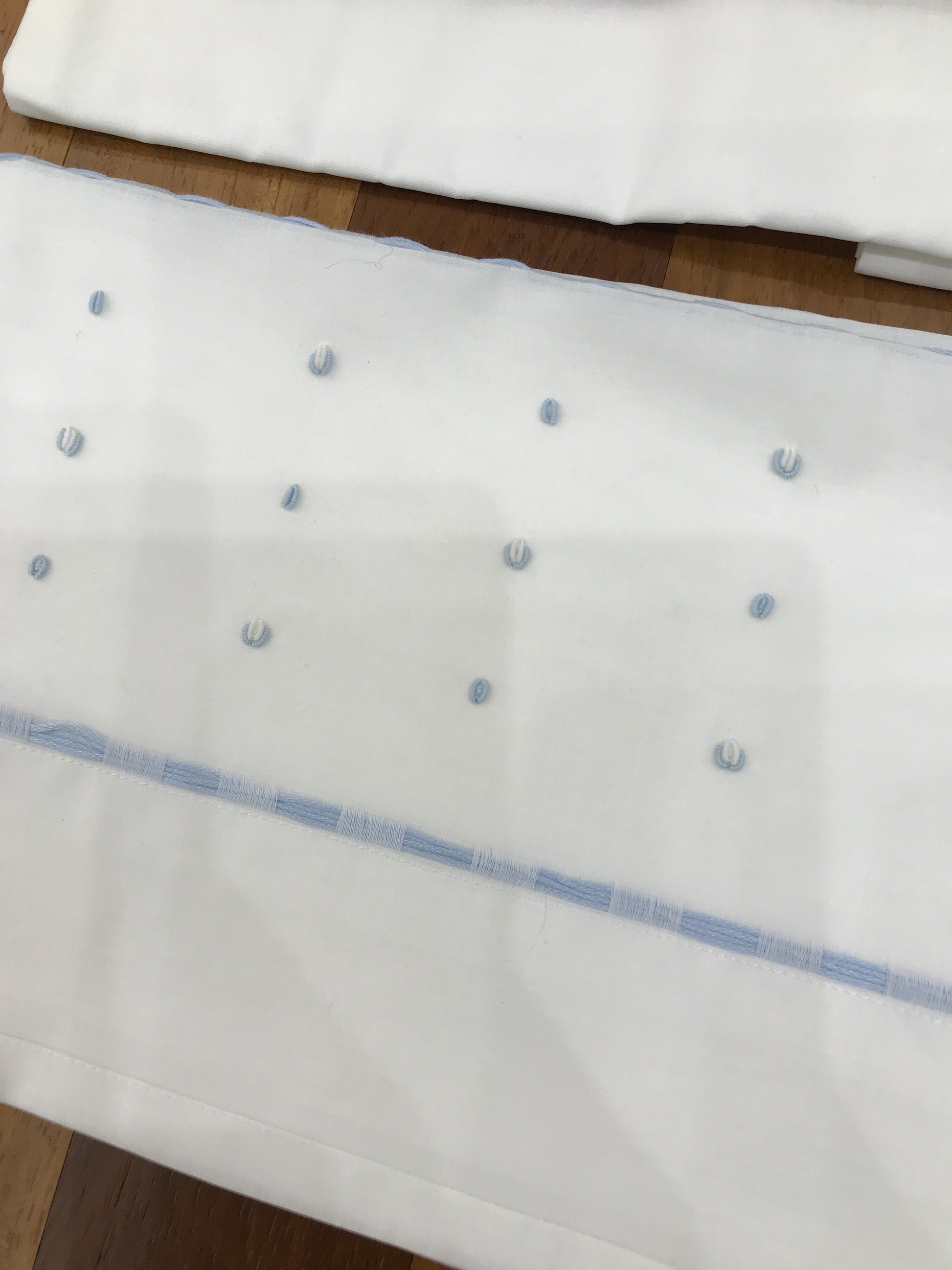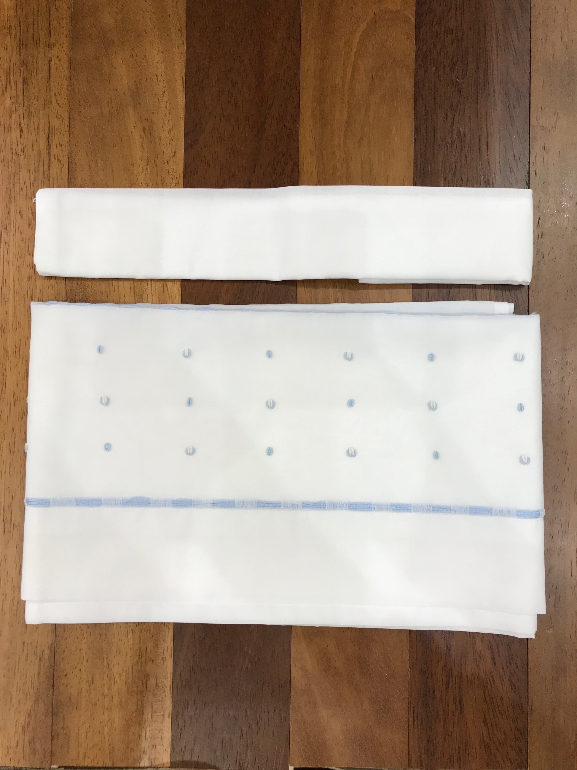 Questo delicato lenzuolino presenta una base bianca impreziosita da una sottile linea celeste e da ricami floreali al centro, creando un effetto elegante e sofisticato. Un dettaglio di qualità che aggiunge carattere e raffinatezza a qualsiasi ambiente.
