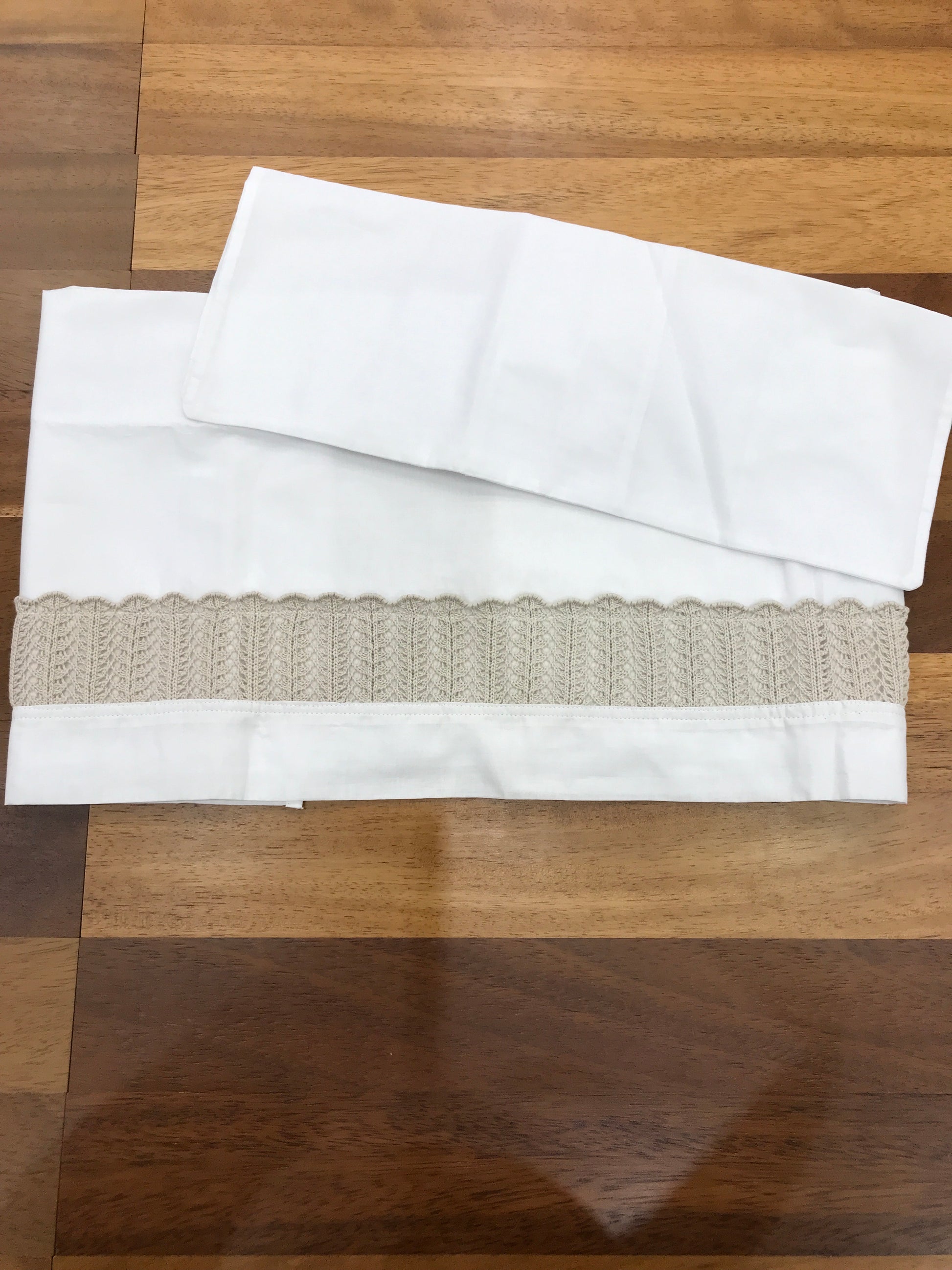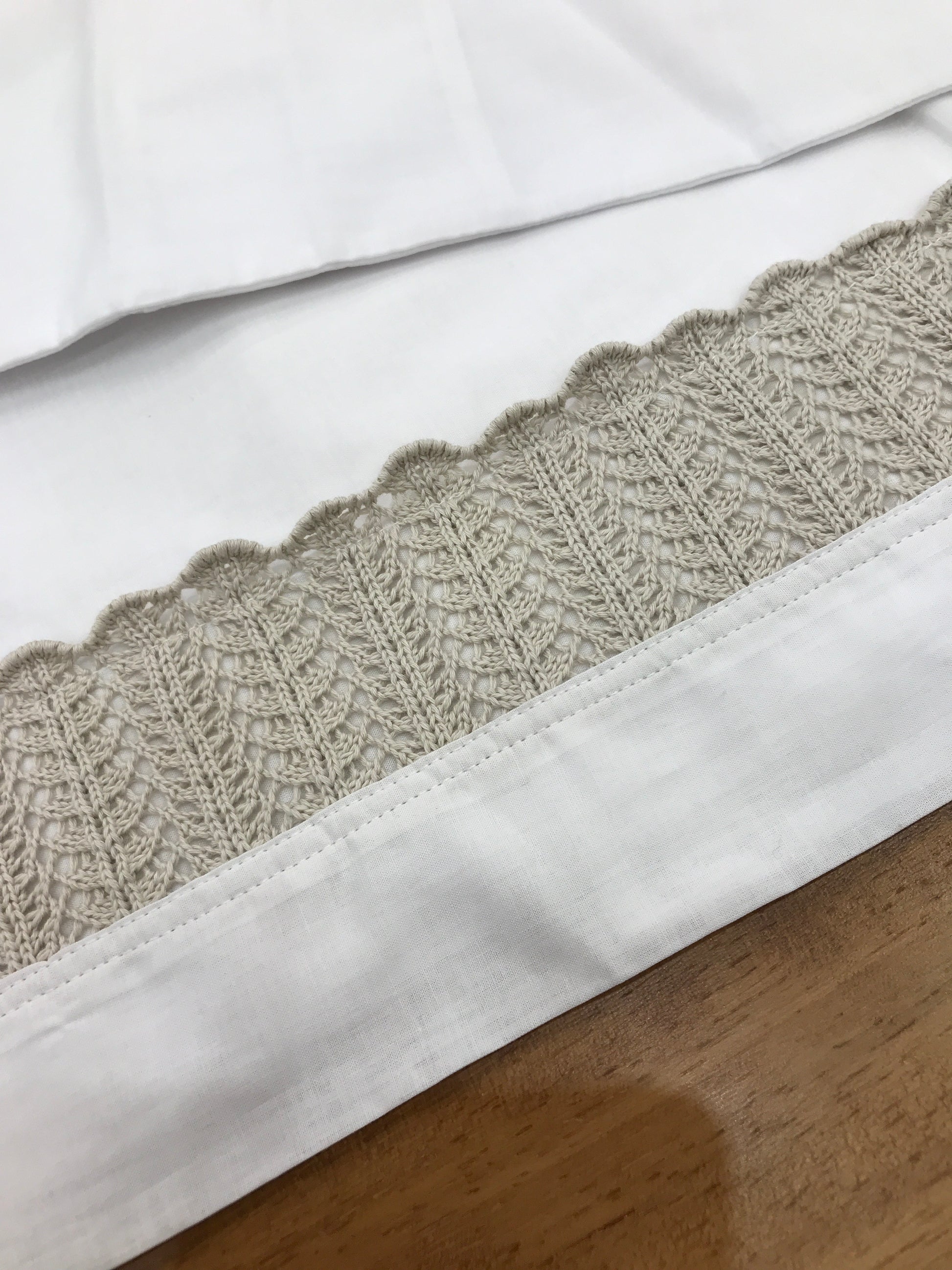 Lenzuola in cotone con ruches applicate sul davanti in colore tortora, completate da una federa per cuscino basica bianca.