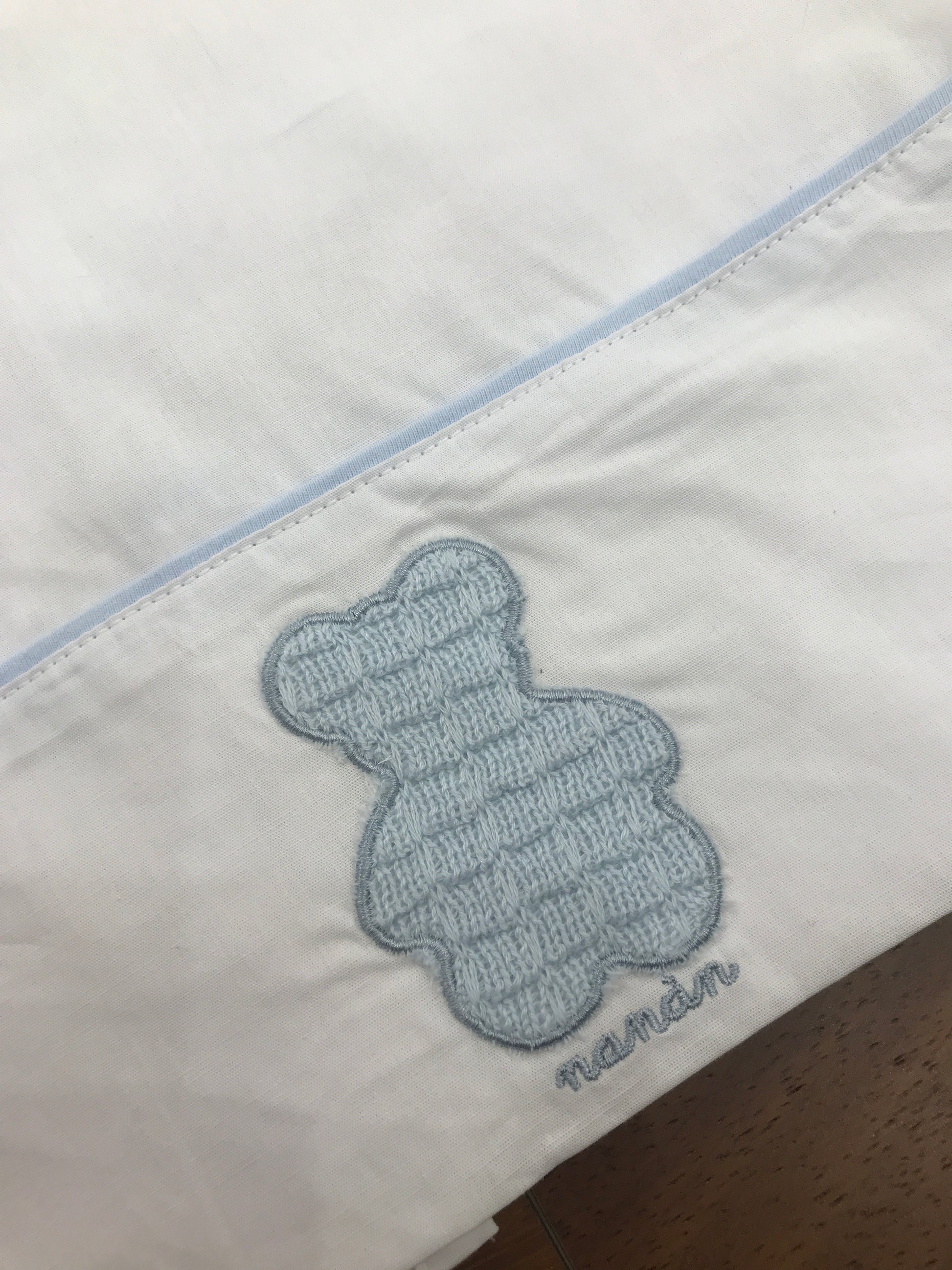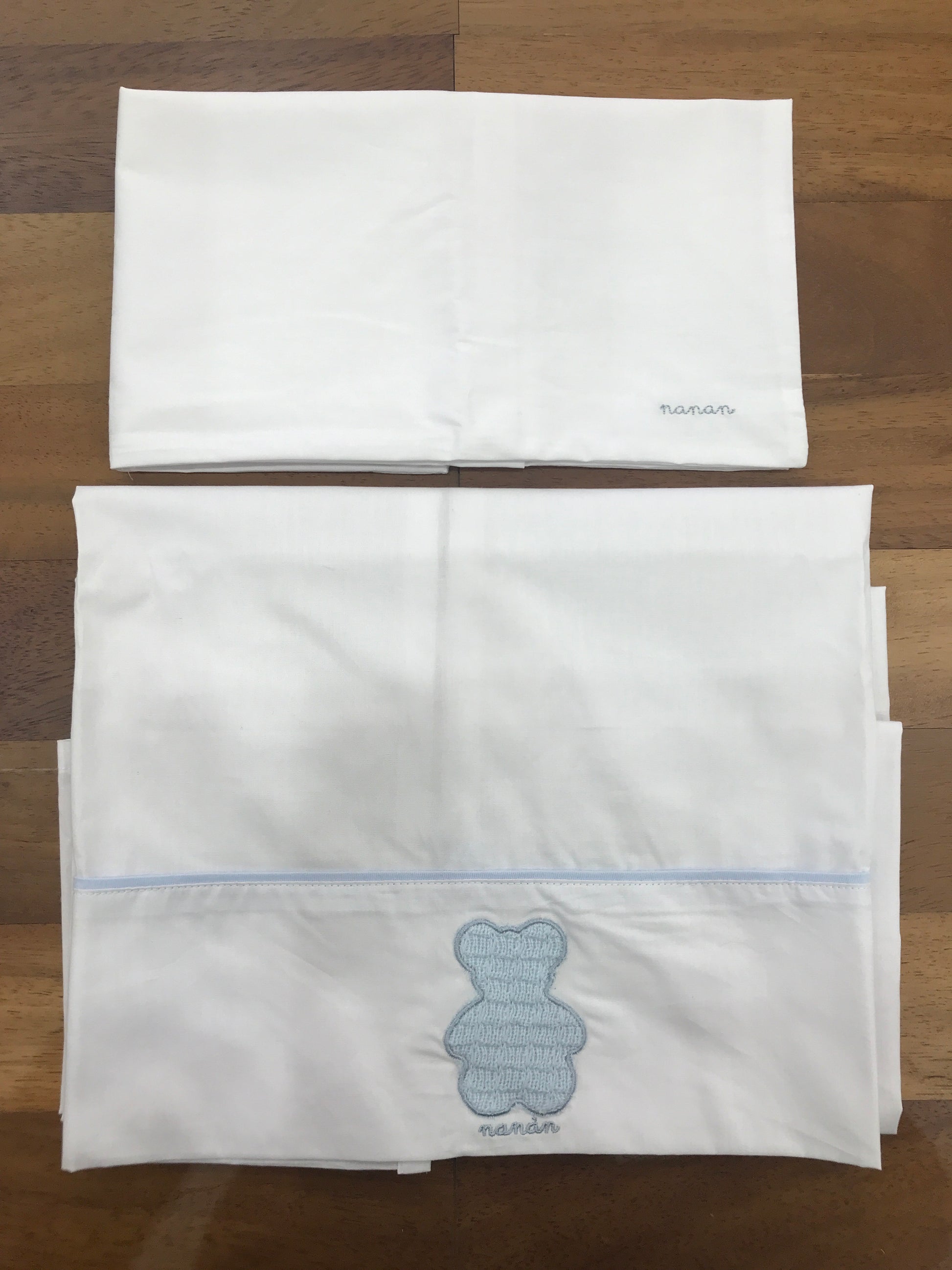 Lenzuola bianche essenziali con un orsetto blu ricamato e una linea blu sobria. La federa del cuscino è minimalista, con la sola scritta "nanan".