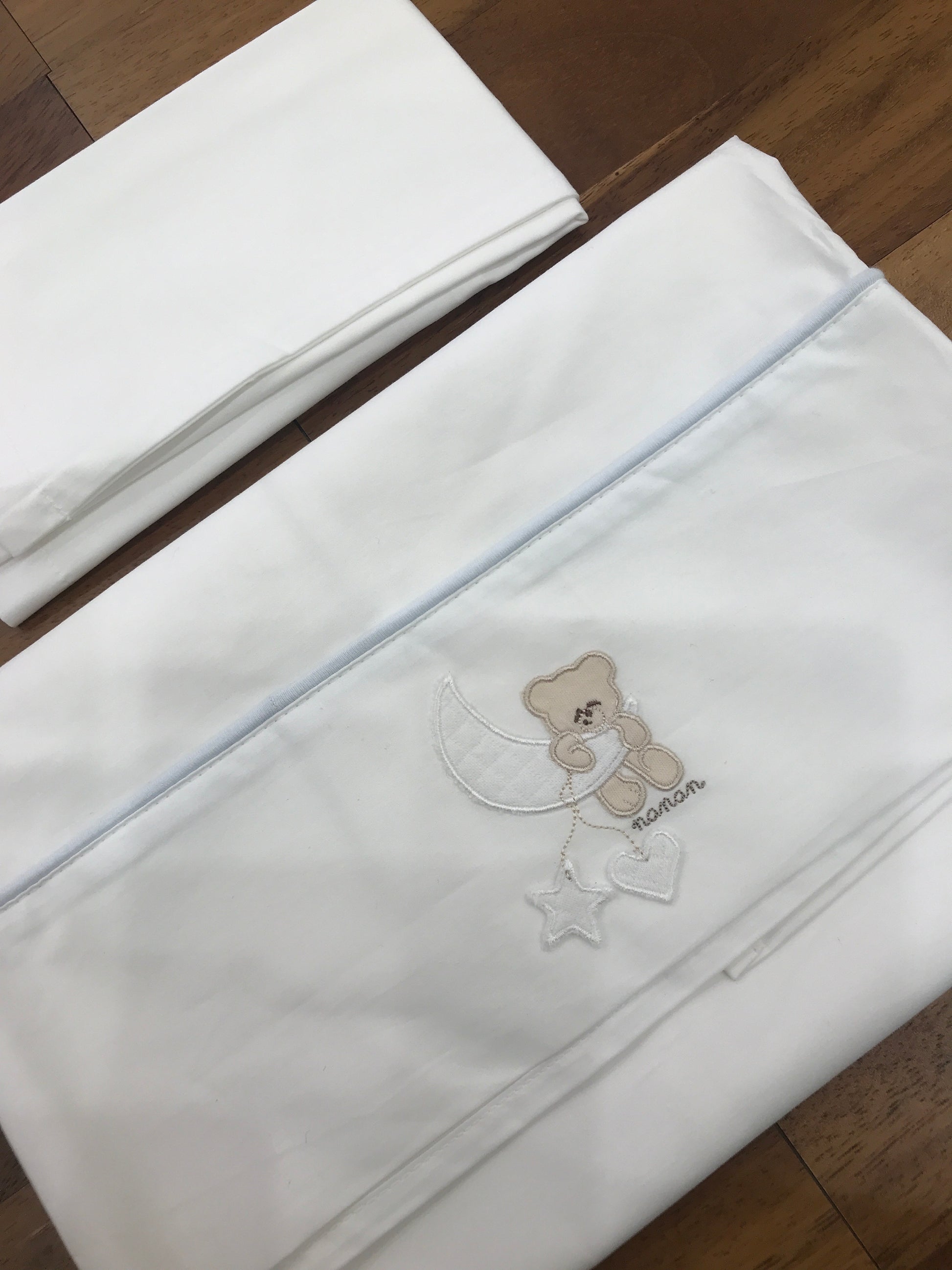 Lenzuola bianche decorate con un orsetto e una luna, accompagnate da una federa semplice di colore bianco.