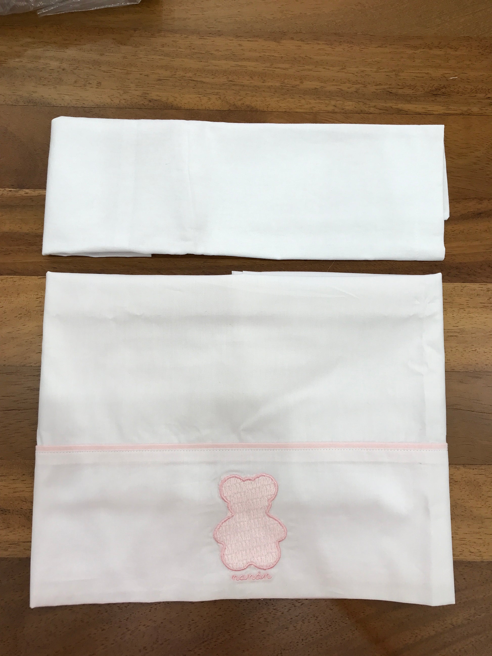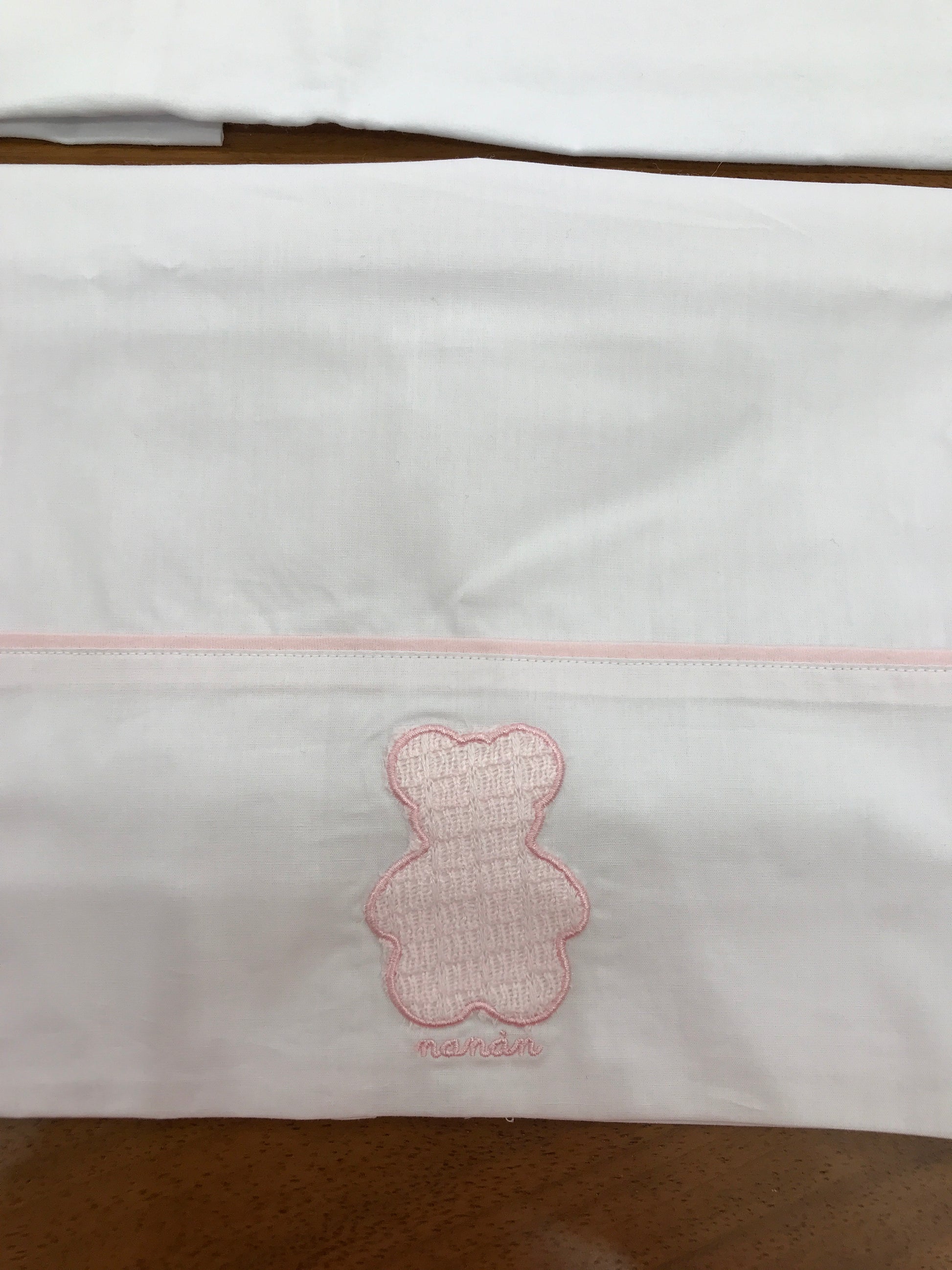 Lenzuola bianche essenziali con un orsetto ricamato e una linea rosa sobria. La federa del cuscino è minimalista, con la sola scritta "nanan".