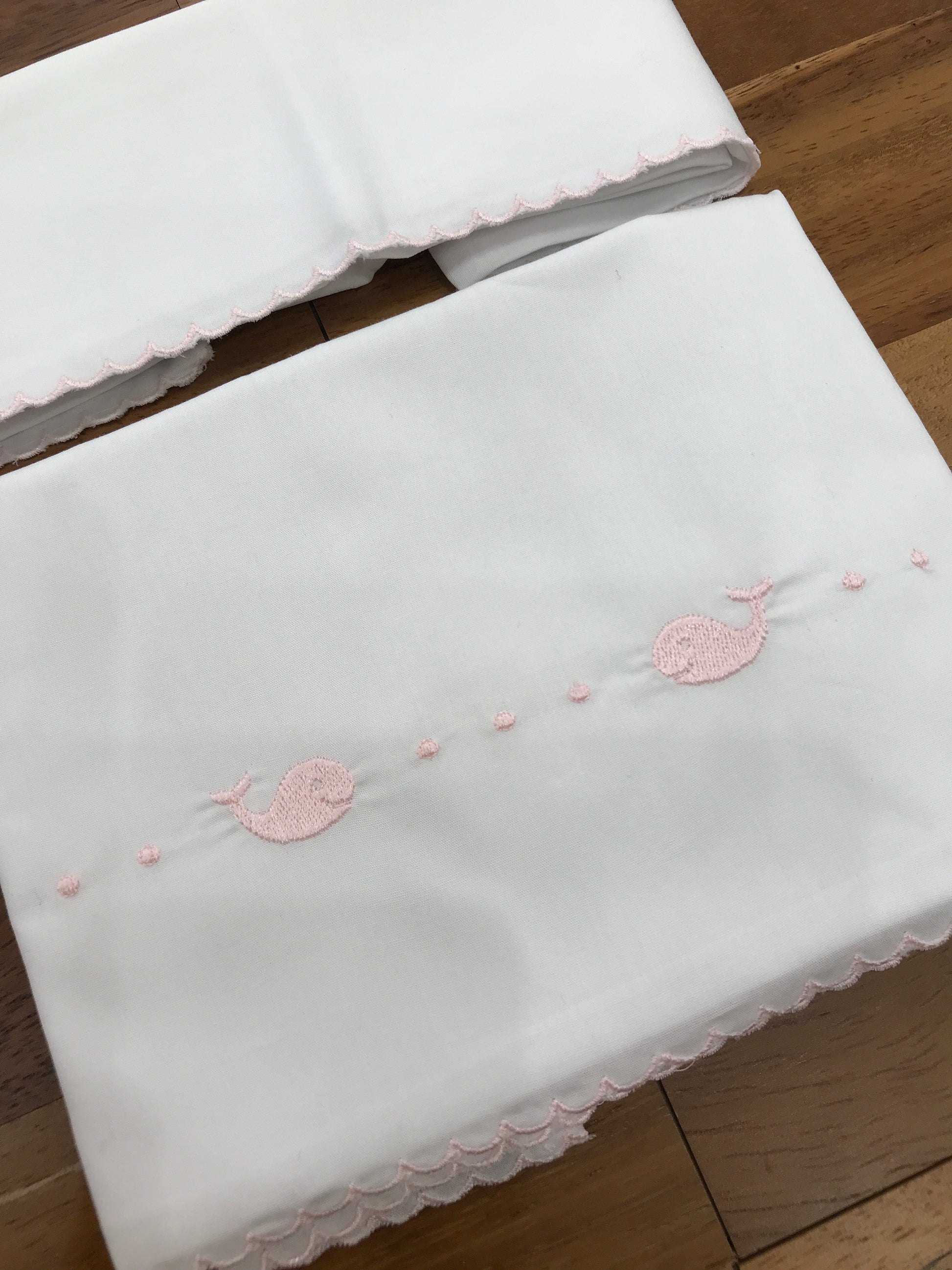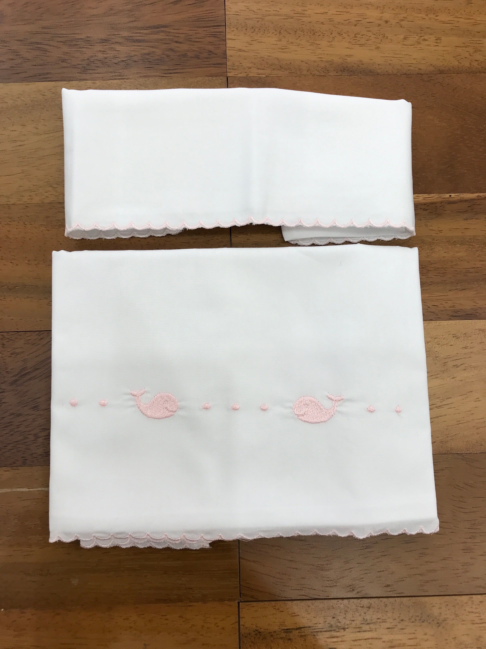 Lenzuolino con bordo smerlato rosa, decorato con un ricamo di delfini tono su tono.