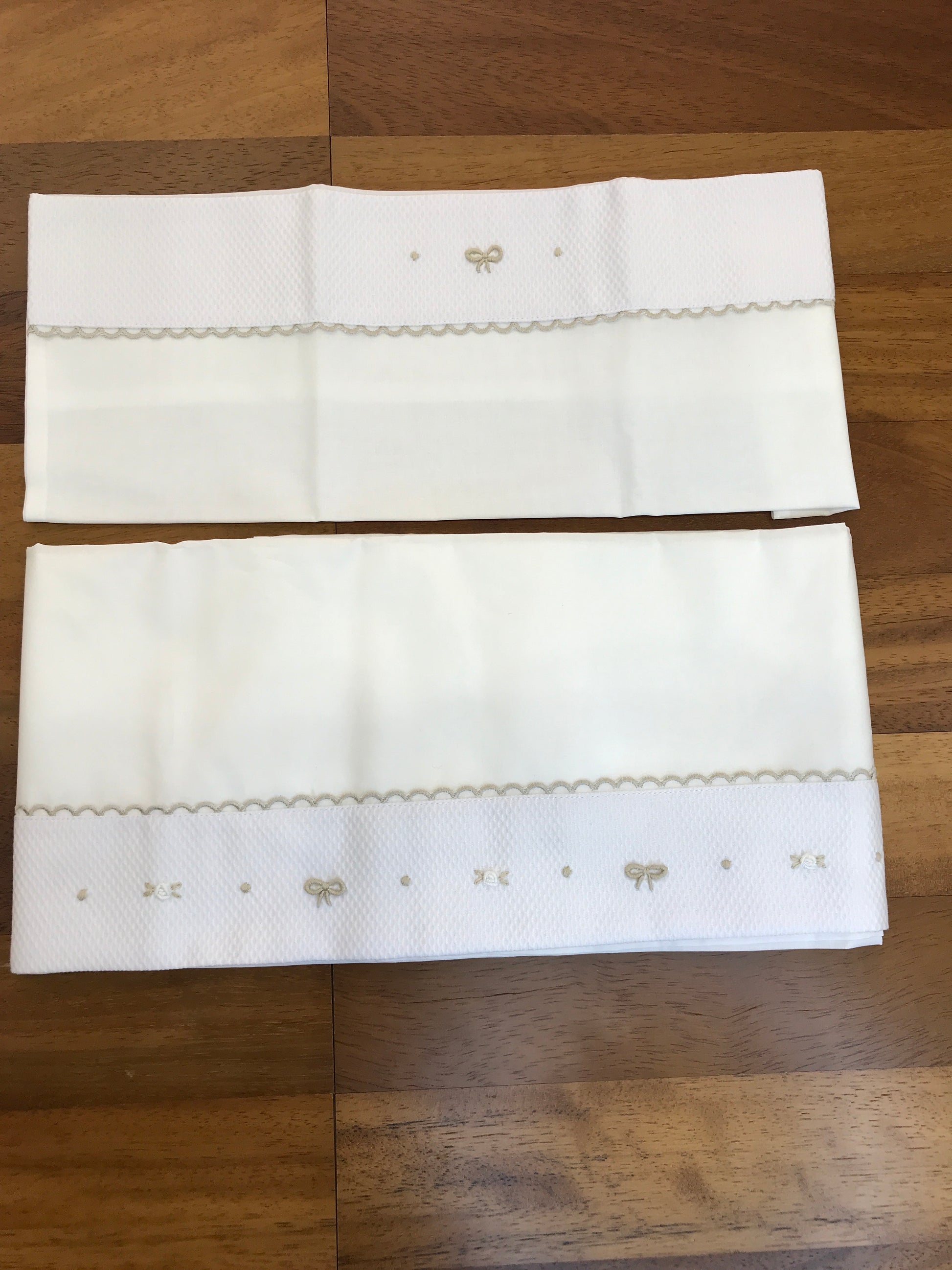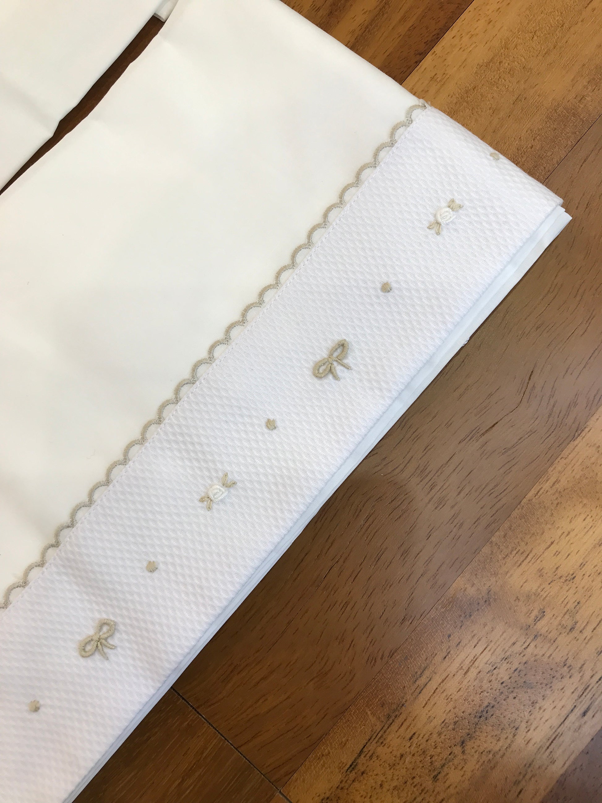 Lenzuola caratterizzate da ricami raffinati in tonalità beige, arricchite da un delicato motivo a pois, onde sinuose e piccoli fiocchetti, perfette per conferire un’eleganza discreta e un tocco di charme alla camera da letto.