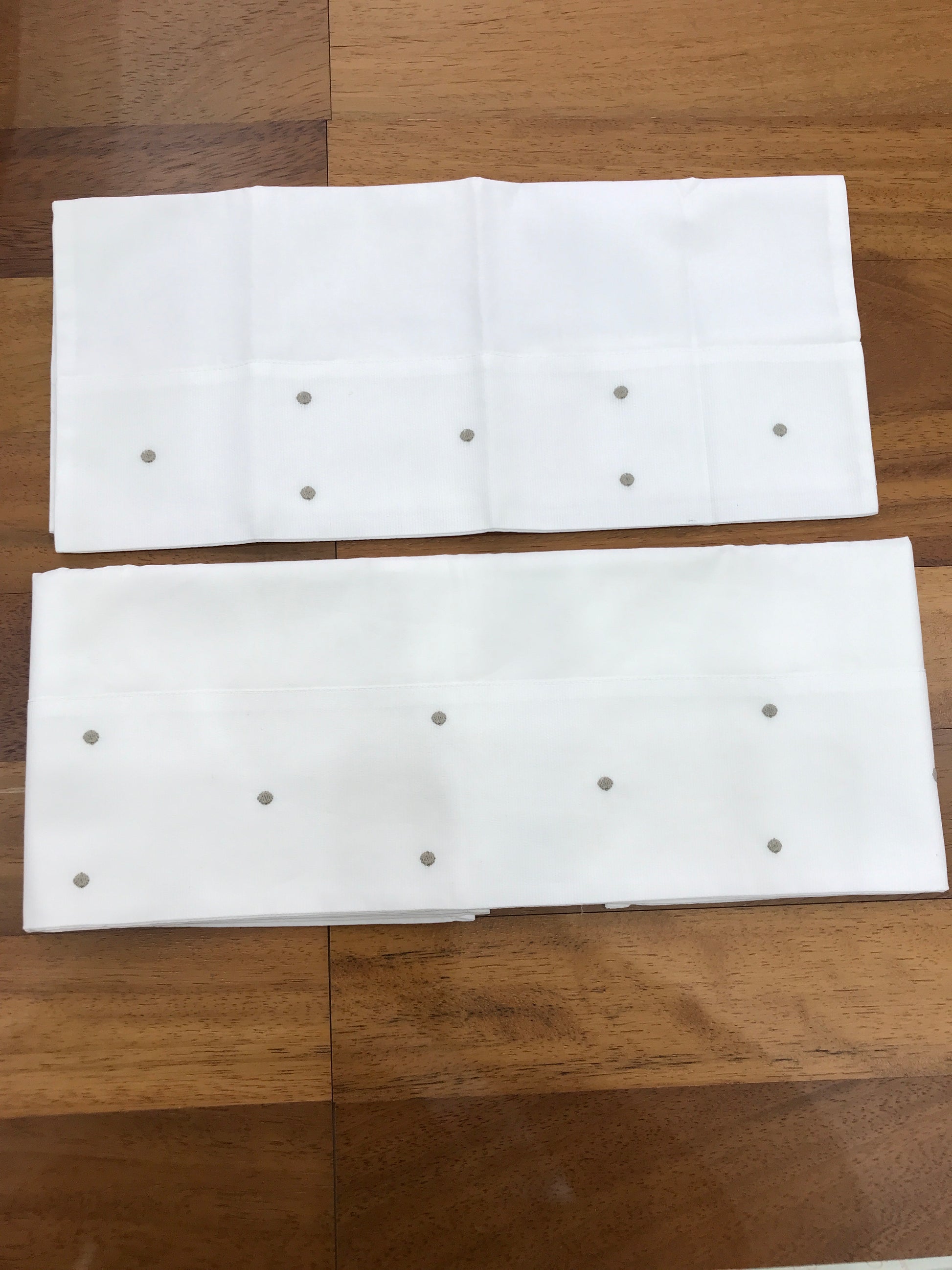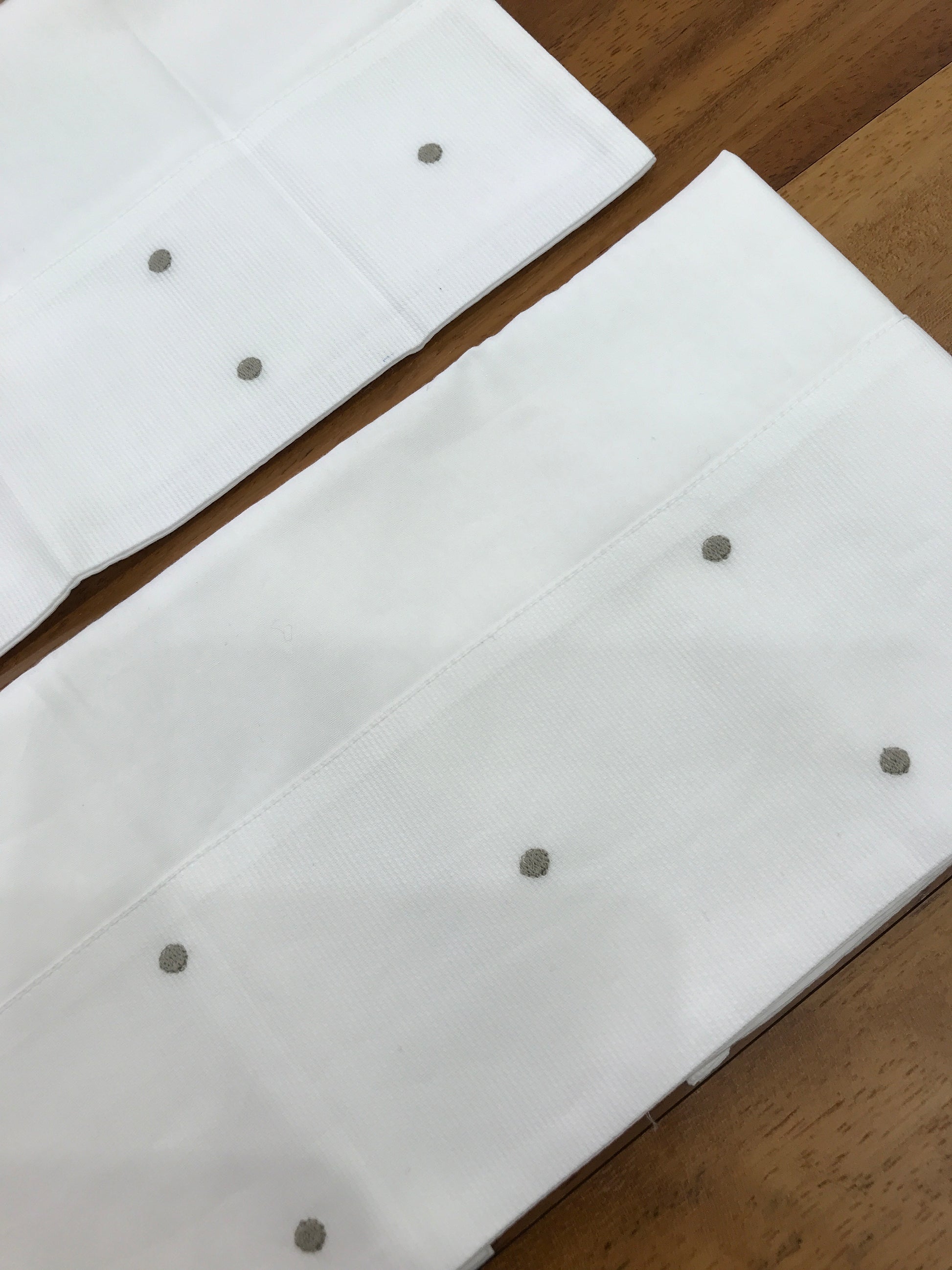 Lenzuola bianche con delicati pois grigi, arricchite da una decorazione coordinata anche sulla federa del cuscino.