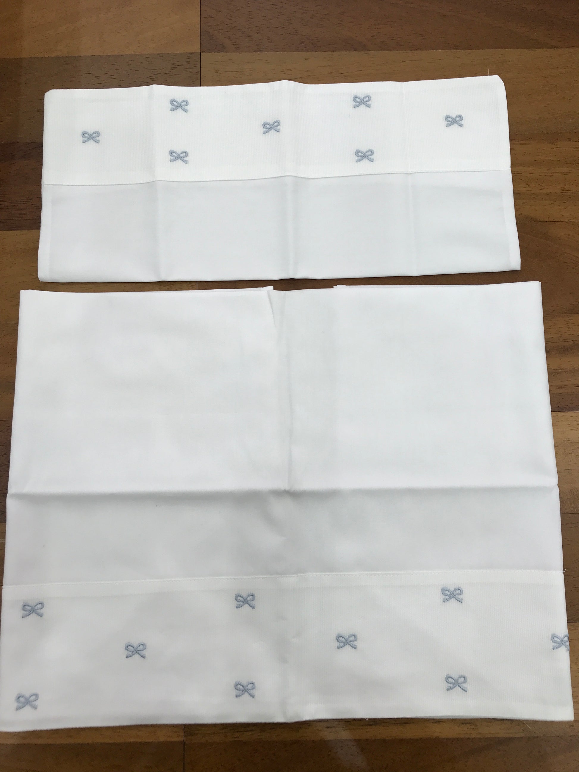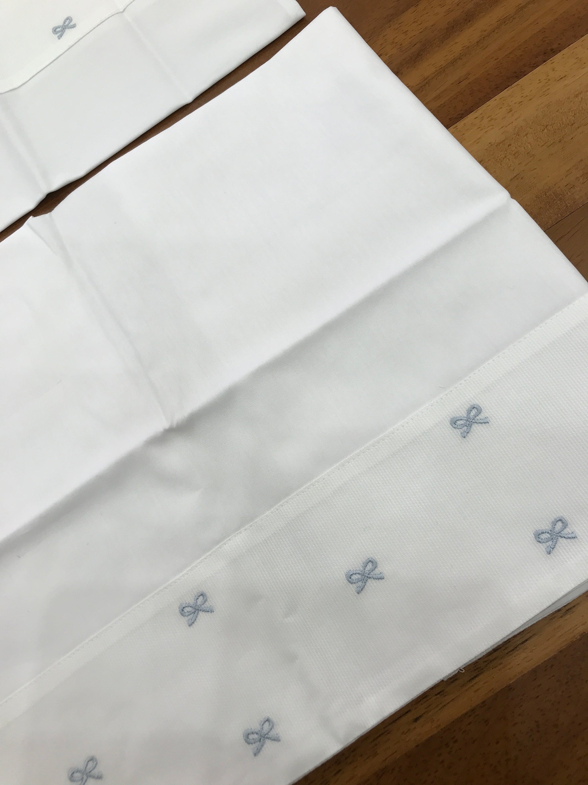Set di lenzuola bianche impreziosite da ricami di fiocchetti celesti, con la stessa decorazione raffinata ripresa sulla federa del cuscino, realizzato in una versione più lunga per garantire una migliore vestibilità e comfort.