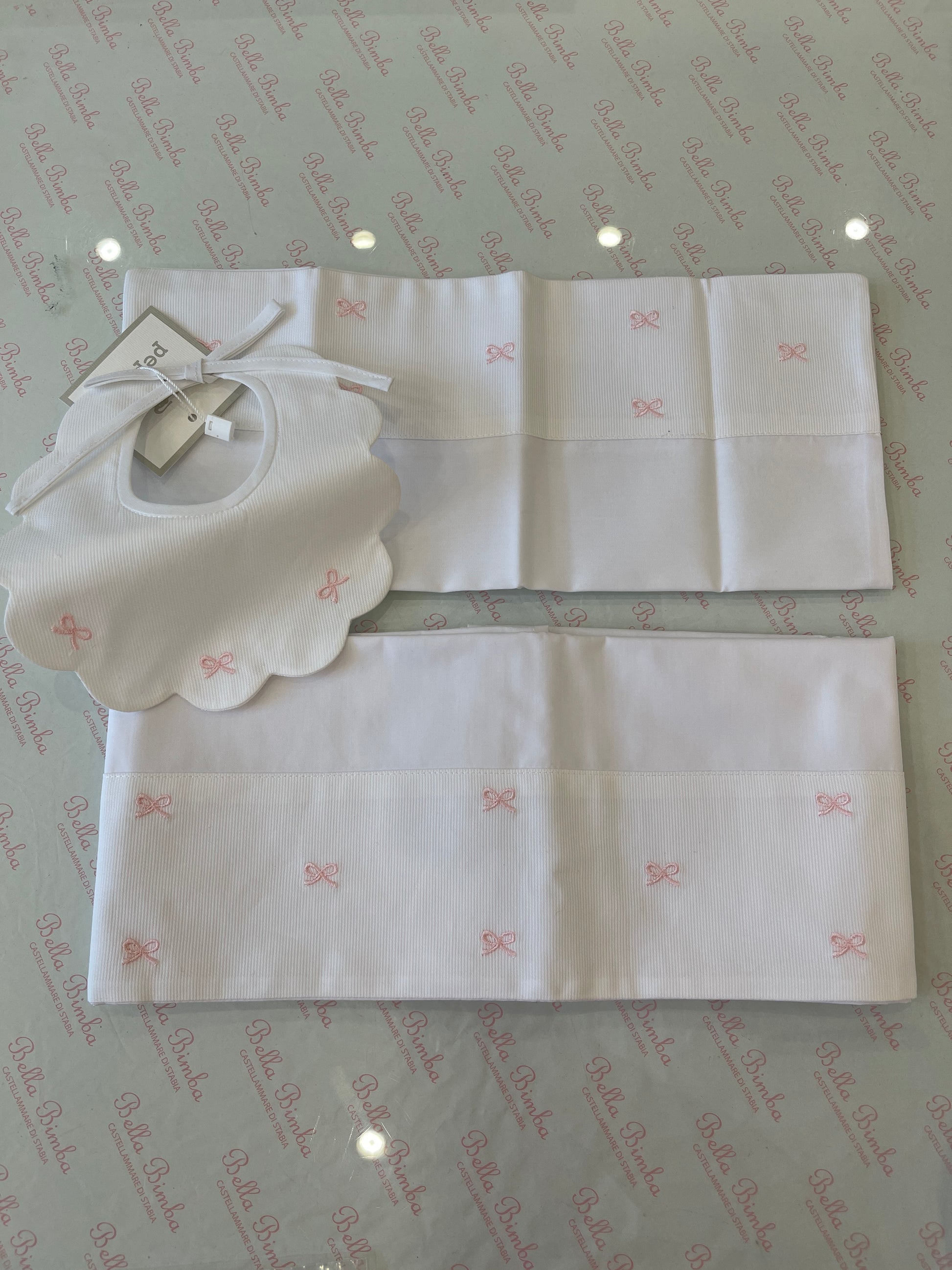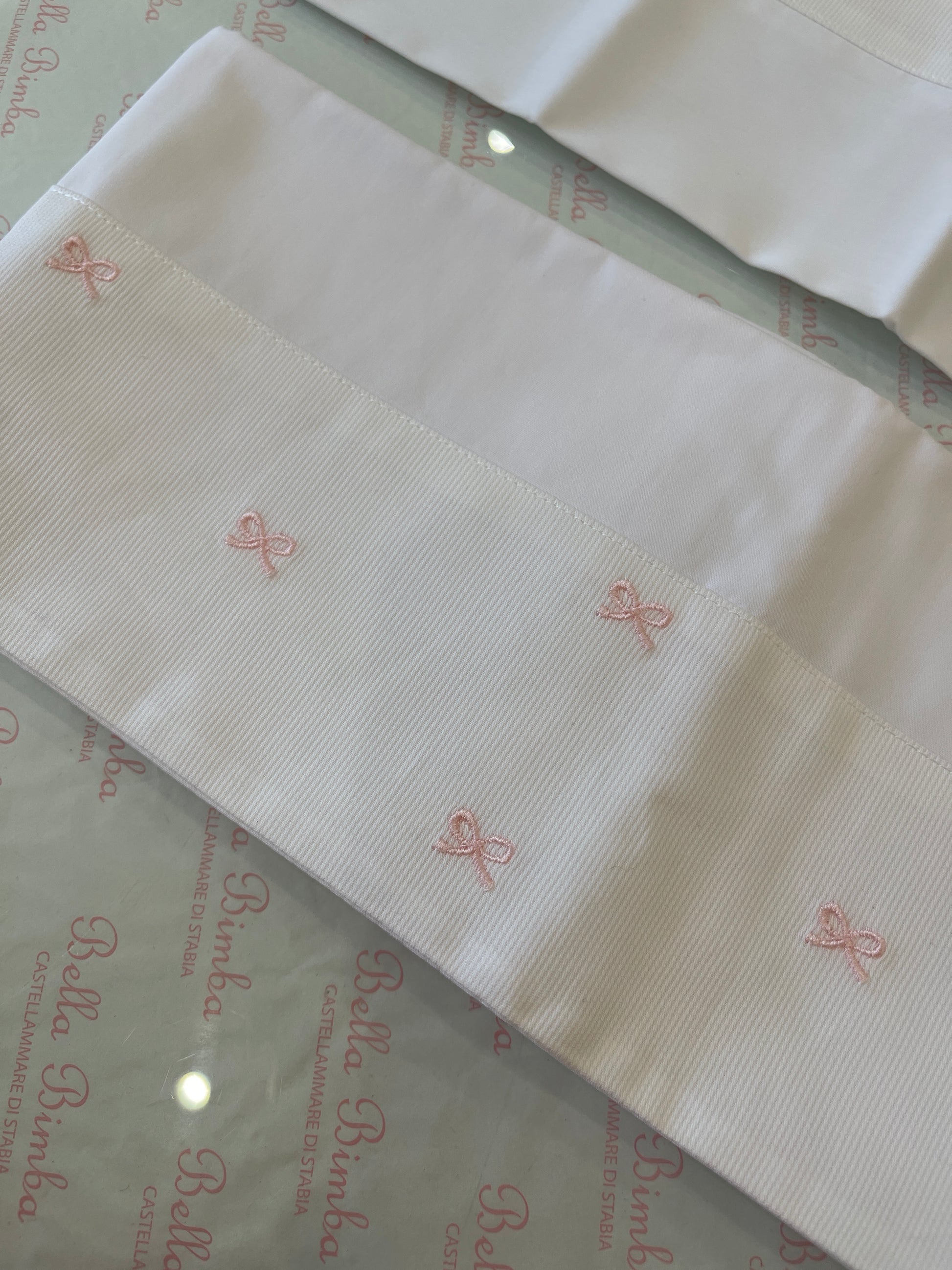 Set di lenzuola bianche impreziosite da ricami di fiocchetti rosa, con la stessa decorazione raffinata ripresa sulla federa del cuscino, realizzato in una versione più lunga per garantire una migliore vestibilità e comfort.